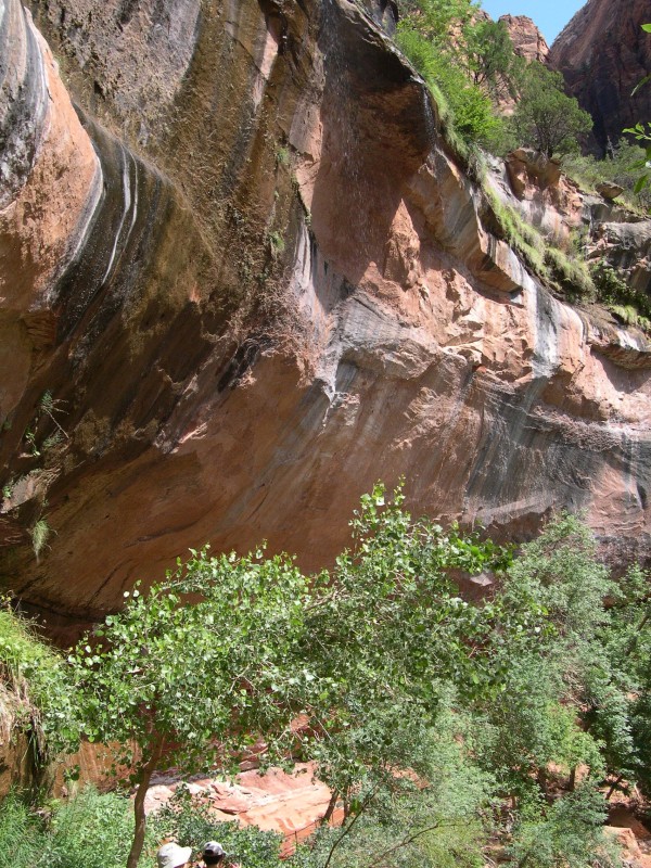 續往北行,Weeping Rock 0.5哩輕鬆易行,步道終點的山壁,一滴滴的流下水珠,像是在訴說著什麼。 Shuttle Buses最後一站是Temple of Sinawava,走2.0哩的Riverside步道終點是Virgin River。有備而來的人換穿溯溪鞋,或拖鞋或打赤腳拿著手杖走入河中,溯溪而上。我什麼也沒有準備,高高的捲起褲腳,脫下布鞋慢慢的走入河中。赤腳又沒有手杖走來寸步難行,此時一位回程的遊客把他的木棍送給了我。有了堅硬的木棍,走起安穩多了。愈往上游河道也愈小,水也愈深,河岸兩邊的山壁也愈顯陡峭,難怪有那麼多的人有備而來。我的裝備不足,不能走太遠隨即往回走。回程遇林口高中的老師,我也把那支木棍交給了他們,我想他們會走得更裡面才對。 營地內沒有沖澡的地方,回到營地時間還早,我和維凡到附近的河中泡水,當然就順便洗澡囉(不能使用清潔用品)。只是這時天空已佈滿烏雲,沒有太陽的照射,溫度下降了許多,河水又冰冷,真佩服當地的人,能在水中自在的玩水。沒多久竟下起小雨來了,出門那麼多天,白天幾乎都是晴空萬里,艷陽高照,當我們最需要太陽時它卻躲起來了。