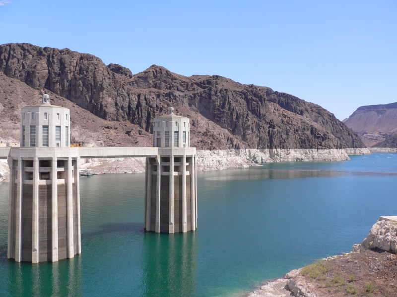 09:10收拾妥當告別賭城。今天住那裡尚未決定,計劃是依時間而定,Kingman或Williams都可。近11點時來到胡佛水壩(Hoover Dam),因距拉斯維加斯很近,成了頗受歡迎的觀光景點。水壩建於1935年,耗費的資金龐大,是美國聞名的人工水霸,西南各州都得依賴它。要了解它的歷史及相關功能,得到遊客中心購票,參加深度導覽。我們受限於語言,時間及需求性並未參加。將車停在免費的路邊停車場,沿壩堤步行參觀,感受它的巨大功能與成就。水庫四周的山光禿禿的一片,湖水湛藍,要感受的它的美可能要從另一個角度去構思。