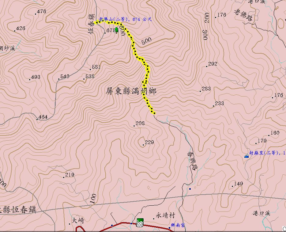 登山口:自從七月初,馬博橫斷回來後,至今近半年的時間,除了前二週去柴山走走外,幾乎未曾走入迷人的山林。今天是另一個新的開始,再度與山林親近。文賢兄與上霖兄,為了登老佛山,曾從滿州鄉的老佛社區,尋找舊步道 入山。因舊步道近來少有人走,路跡已不清楚,雜草佈滿路旁,不易行走。他們翻閱地圖,學習先人開路的精神,從七孔瀑布風景區進入,披荊斬棘,開出一條新路。 沿途都有”墾丁蝴蝶農場”的路條,順著路條就可以順利抵達。