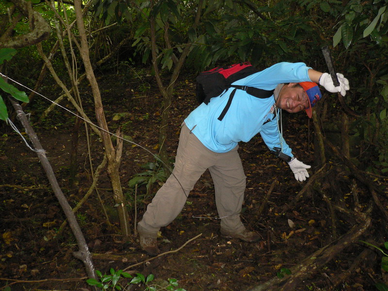 早期當地人會在山上出入,大概都是從事放牧或打獵等活動,因此他們是很少登頂的。當我們走到陡坡處時,就換我們找路了,上霖兄靠著GPS的資料,指引方向,走在前頭的文賢兄,春風兄手拿柴刀,俐落的砍出一條路來。