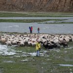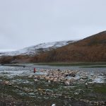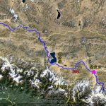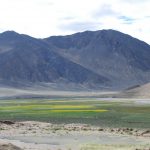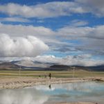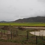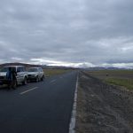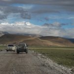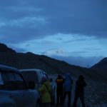 16:25終於抵達定日縣城,最晚的午餐時間。過了老定日,車道全是泥土路。車隊開在草原上,雖有既定的道路,可是比較顛簸,開車師傅們就各顯神通,自己找便道開。下午七點來到崗嘎村的安檢站,這裡可見卓奧友山,旁邊的小水池還有倒影,這可是來到西藏以來看得比較清晰的山容。