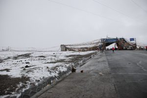 馬攸木拉山口 海拔5210M,過了這裡就算進入阿里地區,此後將更地廣人稀。進入阿里是屬於重要管制區,在馬攸木拉橋設有邊防安檢站。在西藏地區安全檢查非常嚴格,只要進入或離開聚落一般都會設立安檢站,由公安或邊防部隊設立。簡單的安檢只要由師傅下車驗證即可,煩瑣的則需要核對所有人的證件,甚至還有把行李送進X光機逐一掃描,外加人身安檢。八天以來我們已經不知道被核對過多少次。另有一種針對行車速度的限速單,在某一路段的兩頭各設有檢查站,入口處開立車輛進入時間及此路段至少需行車時間,路的另一頭則檢查車輛是否提早通過檢查站。為了避免被開超速的罰單,開車師傅們發現可能會太早抵達檢查站時,就會在檢查站之前的隱密處停車等待。這就是道高一尺,魔高一丈。