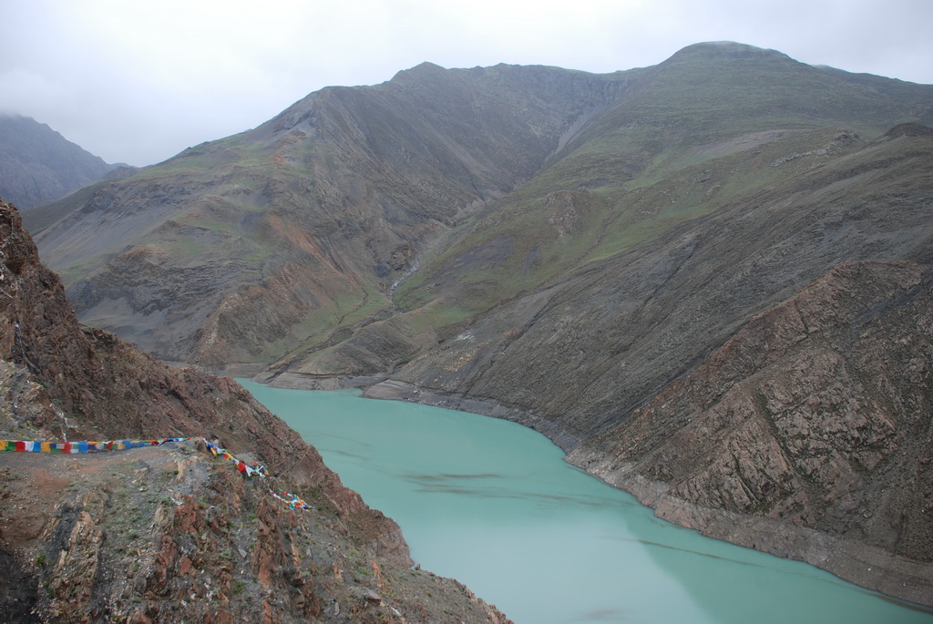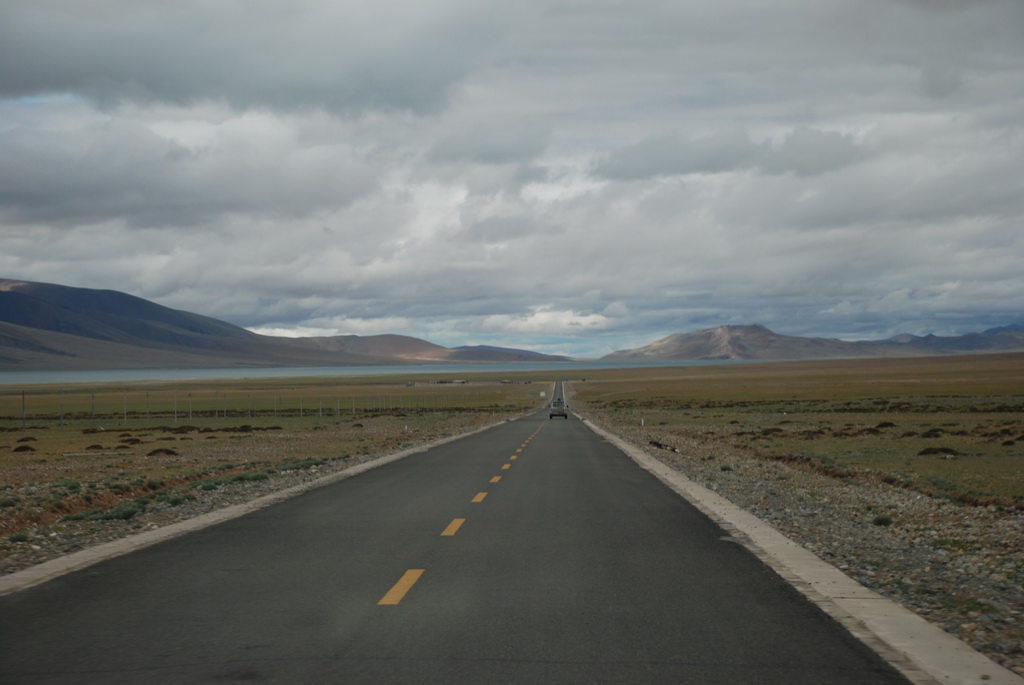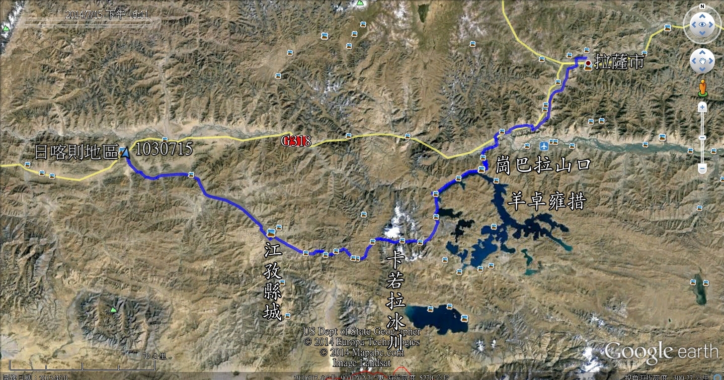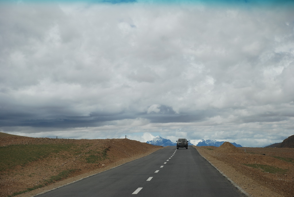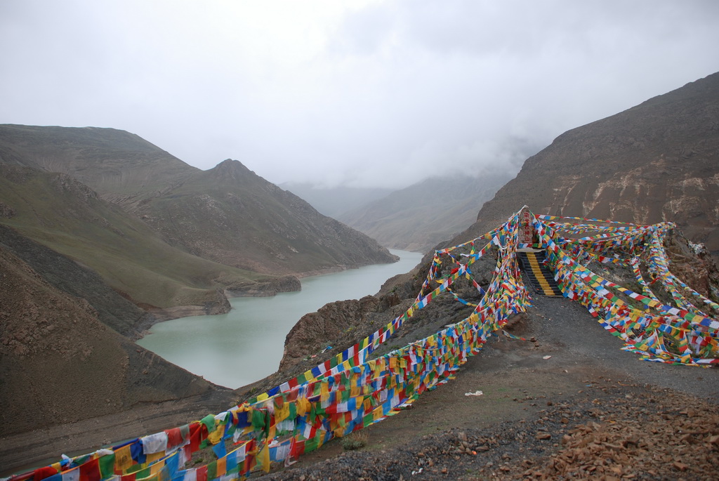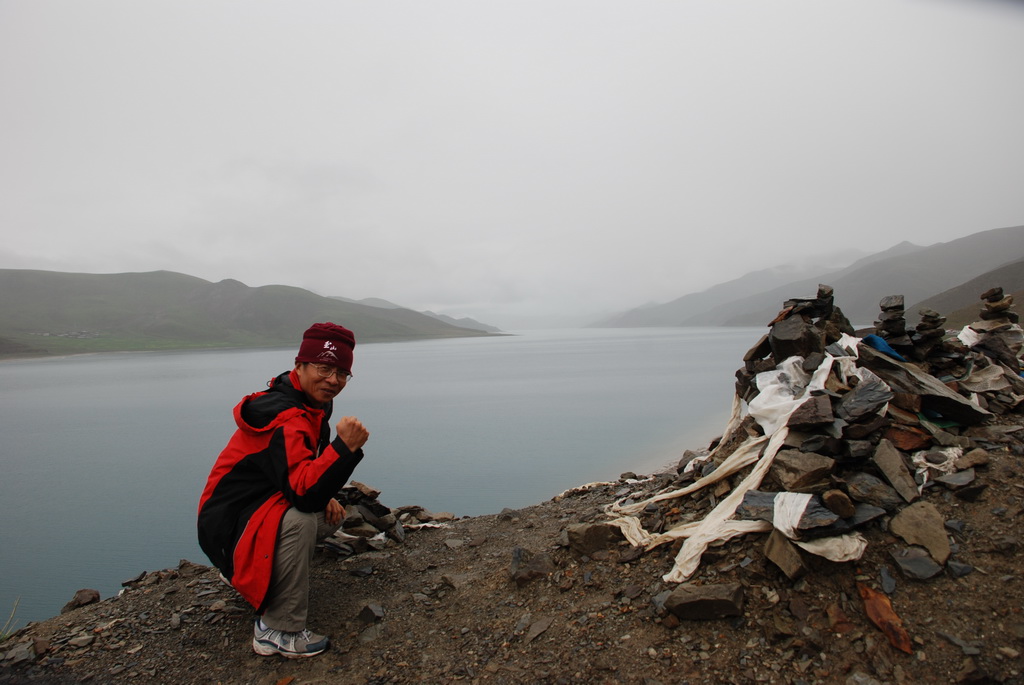 今天一早離開拉薩,將真正進入本次旅行的重頭戲:朝聖(遠眺聖母峰)、轉山(轉岡仁波齊神山)、進入人煙罕至的阿里地區。早上出發還是下著毛毛雨,這場雨從抵達拉薩以來就斷斷續續的下著,抬頭望向天空, 烏雲密佈著整個天空,希望向西行後能有一大片藍天。三名團員分配一輛四輪傳動的休旅車,放進行李車箱內空間還是很寬敞,這種車才能勝任進出阿里地區。進入山區後公路蜿蜒而上,越過崗巴拉山山口,向下遠眺就是羊卓雍措。山上有一大型的停車場,遊客大都會在這裡停車,俯瞰聖潔的羊湖。我們的車隊沒有停車,仍續往前行 ,理由是什麼不得而知。