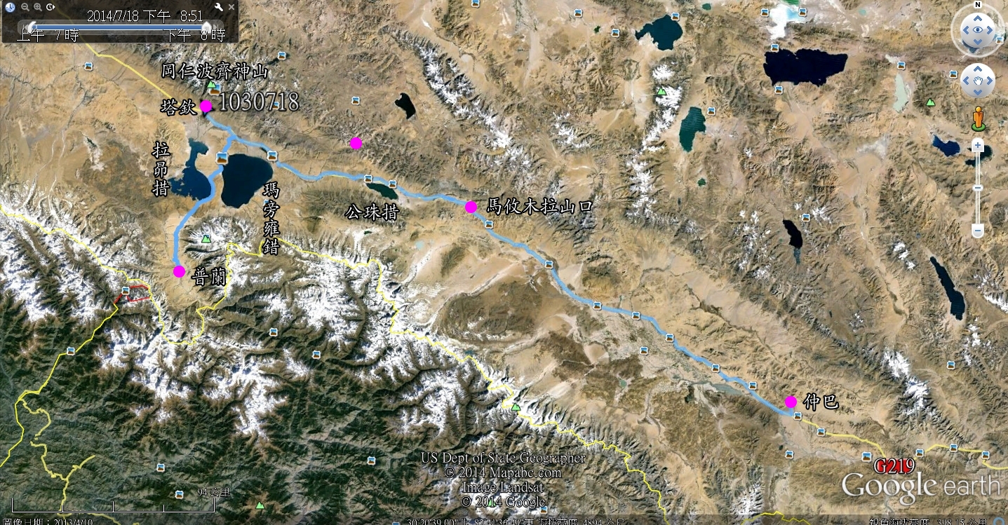 公珠措是進入普蘭之前路旁的湖泊,只要路過湖泊大多會停車讓大家賞景、拍照留念、休息或是放水。今天的重點湖泊是瑪旁雍措,它是西藏地區三大聖湖之一,與神山岡仁波齊同享盛名,為信徒們所崇拜。據說玄奘取經時,把它稱之為天上瑤