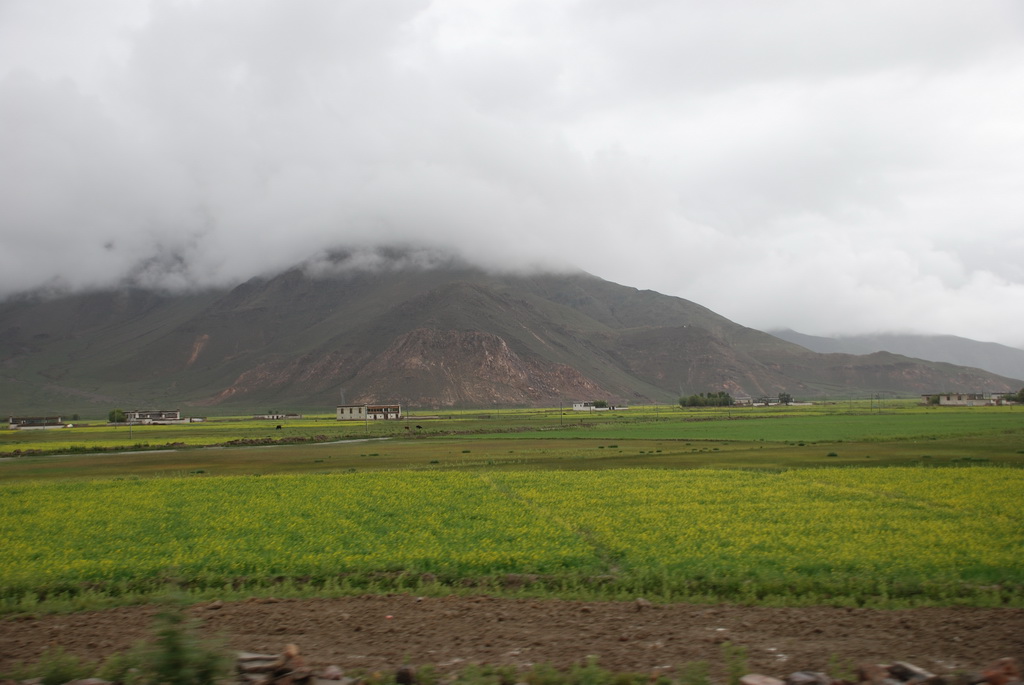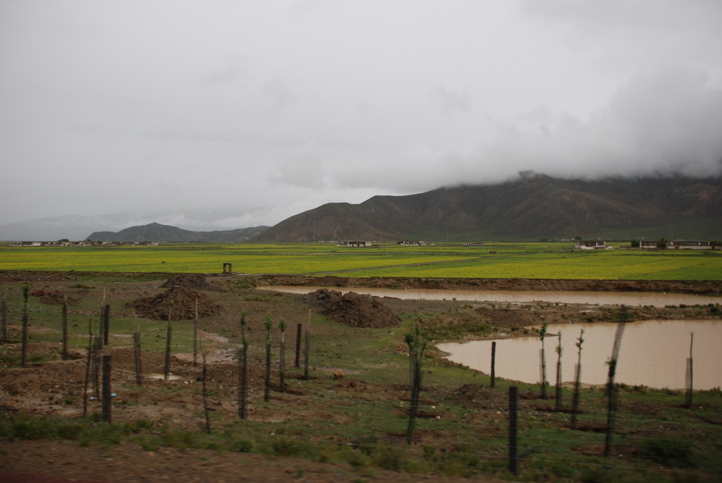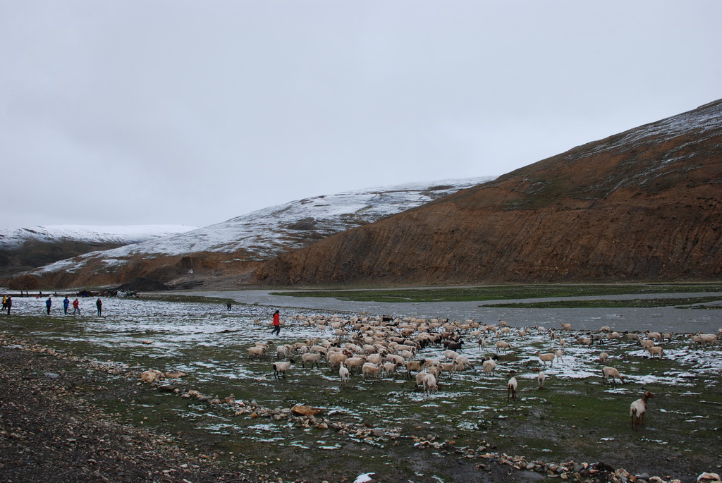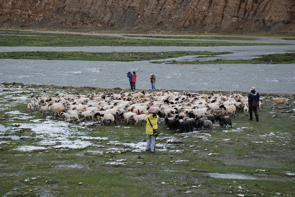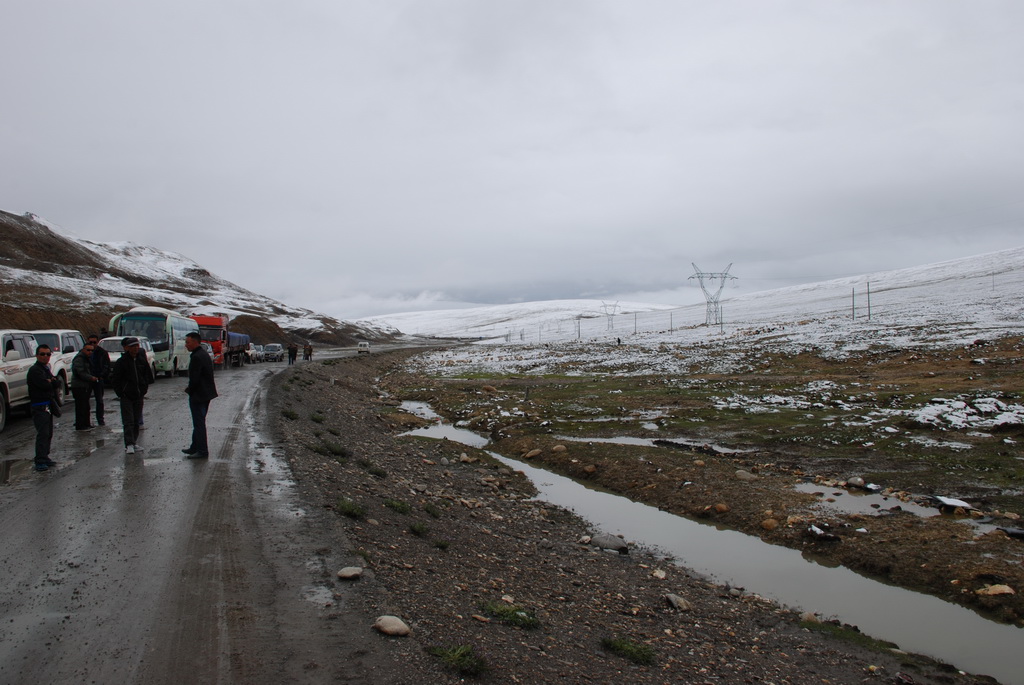 沿途道路旁油菜花正盛開著,不因沒有藍天而無景可賞。11:35來到嘉措拉山山口,停車休息、放水、拍照。連日的下雨,山上也下了不少的雪,一片白茫茫的。車隊續前行後沒多久,前方塞車,望向車窗外,車陣已排成一長龍。詢問開車師傅可能原因,答案是前方可能有車陷入泥淖中進退不得。可是我們停車的地方是柏油路面啊?等待時的路旁有 條河流經過,河岸邊有二個牧羊人在放牧。為了打發時間,遊客都下車走到羊群中拍照,牧羊人非常慷慨,讓遊客盡情的拍照也不收錢,讓大家不會因等待而煩燥。經過約三個小時的等待,下午二點十分車隊終於動了,可是約只移動了300公尺,又停住了。這時才恍然大悟,從這裡開始的路段正在進行道路整建工程,車輛行走便道時因連日的下雨,泥土鬆軟車子陷住了,就這樣我們在車陣中等了近三小時。第二次又等了1.5小時,15:40車隊才真正脫離這無奈的大塞車。