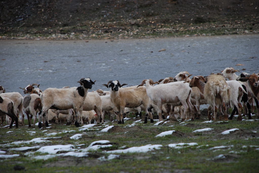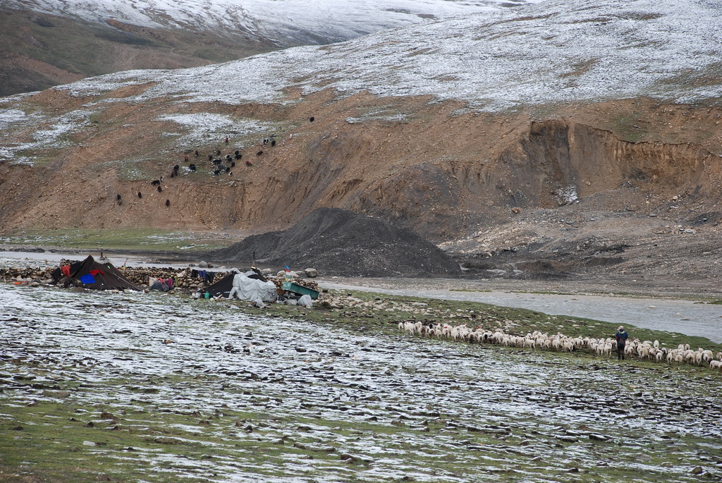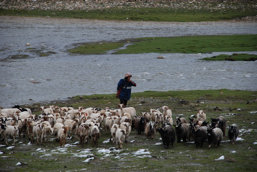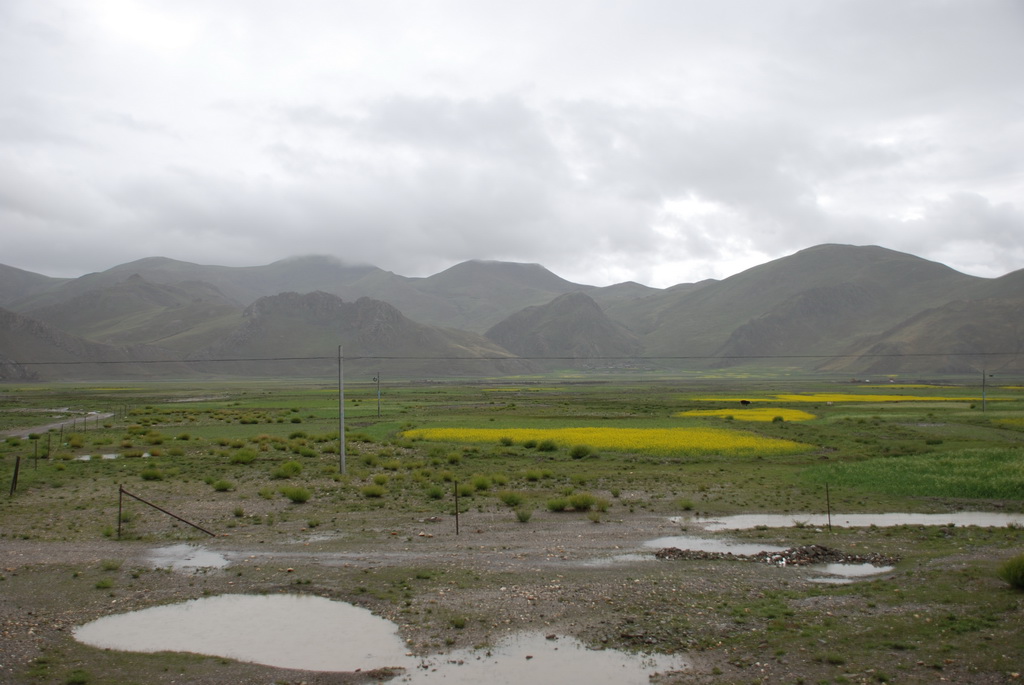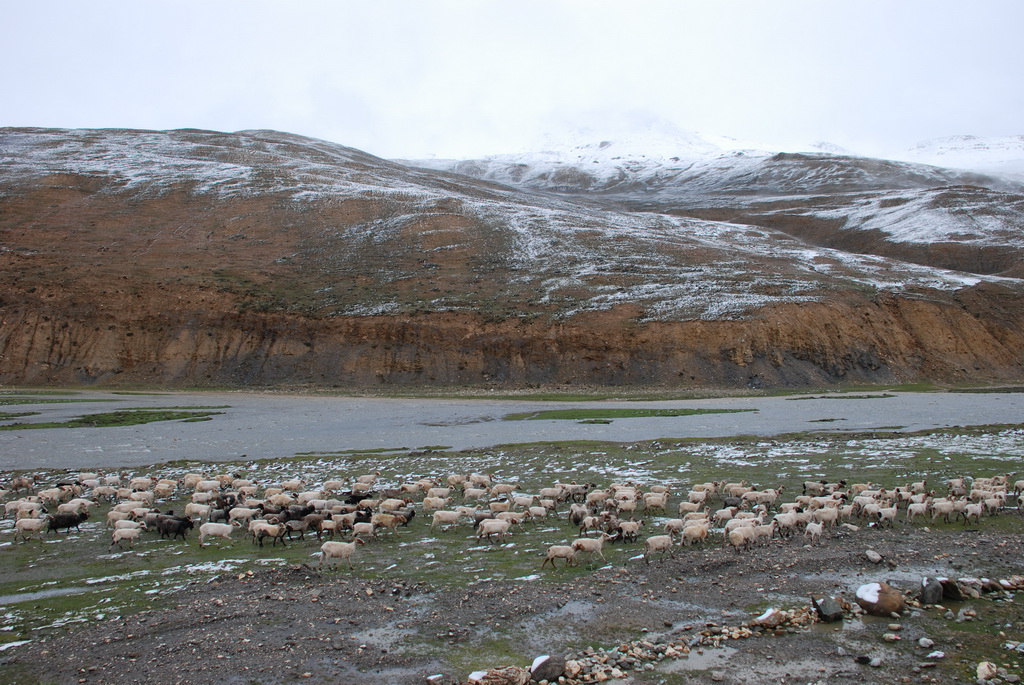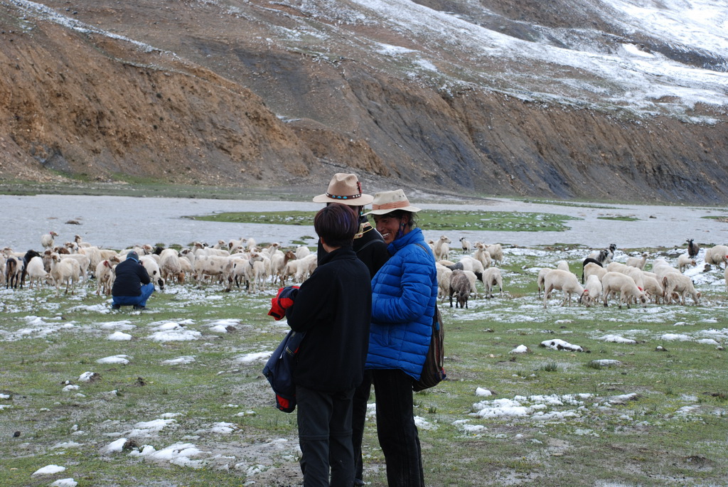 沿途道路旁油菜花正盛開著,不因沒有藍天而無景可賞。11:35來到嘉措拉山山口,停車休息、放水、拍照。連日的下雨,山上也下了不少的雪,一片白茫茫的。車隊續前行後沒多久,前方塞車,望向車窗外,車陣已排成一長龍。詢問開車師傅可能原因,答案是前方可能有車陷入泥淖中進退不得。可是我們停車的地方是柏油路面啊?等待時的路旁有 條河流經過,河岸邊有二個牧羊人在放牧。為了打發時間,遊客都下車走到羊群中拍照,牧羊人非常慷慨,讓遊客盡情的拍照也不收錢,讓大家不會因等待而煩燥。經過約三個小時的等待,下午二點十分車隊終於動了,可是約只移動了300公尺,又停住了。這時才恍然大悟,從這裡開始的路段正在進行道路整建工程,車輛行走便道時因連日的下雨,泥土鬆軟車子陷住了,就這樣我們在車陣中等了近三小時。第二次又等了1.5小時,15:40車隊才真正脫離這無奈的大塞車。