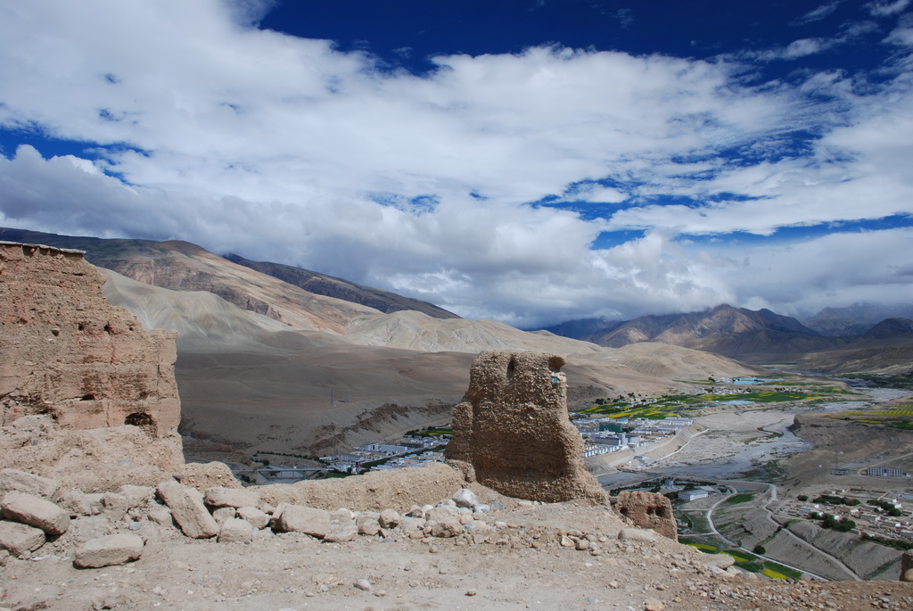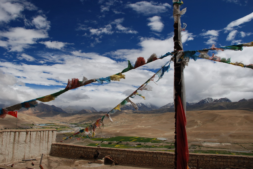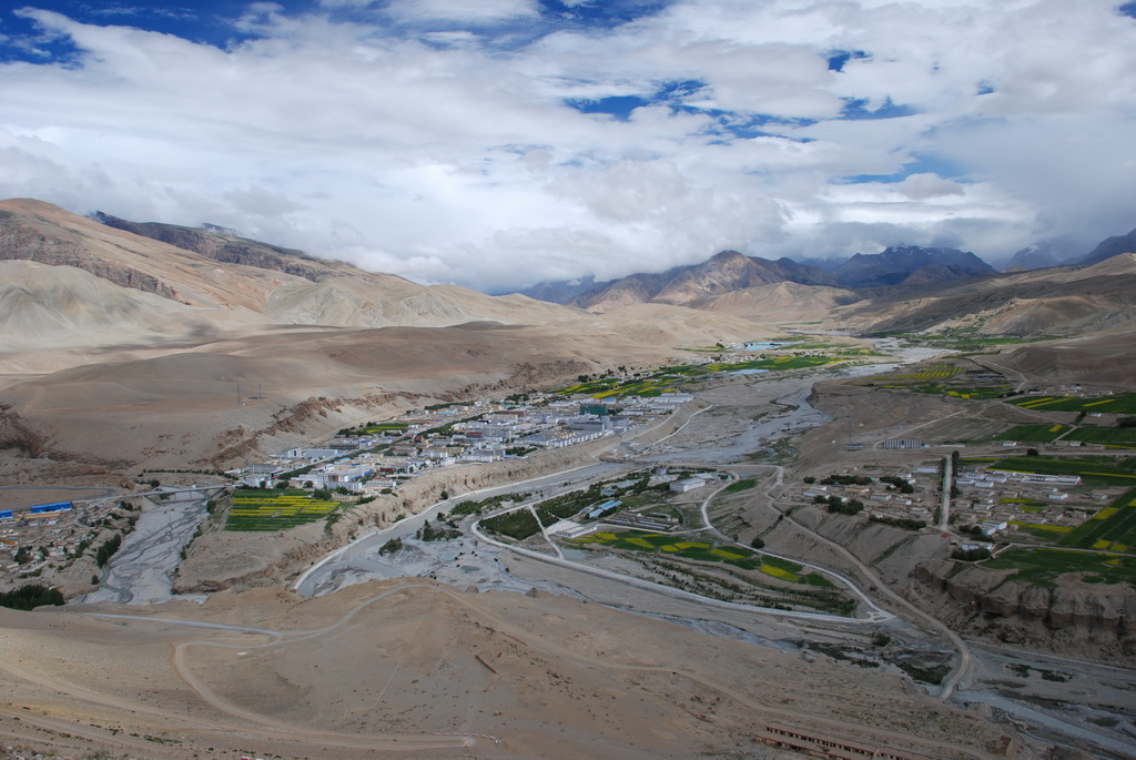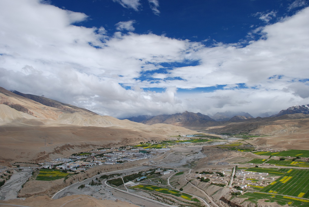 普蘭是一個小縣城,早期是通往尼泊爾的口岸。從山上香柏寺俯瞰普蘭,孔雀河流經縣 城,農田種滿了油菜正盛開著大片黃色小花,像是大地的畫布,把普蘭妝扮得多彩多姿。香柏寺位在地勢險峻的砂石高地上,曾經是孔雀王朝的遺址。千百年前這個小鎮,就已住著一群人,他們在這塊土地上努力生活著,也堅定虔誠的信仰著,至今依然不變。不過這個孔雀王朝應該不是指古印度的孔雀王朝,純粹只是與孔雀河流過有關。孔雀河沿著山谷蜿蜒流過,流經喜雅拉山脈,流入恒河,滋潤了印度、孟加拉 等古國文明。王朝已亡,只剩殘破的殿堂,留下歷史的遺跡,供後人憑弔。