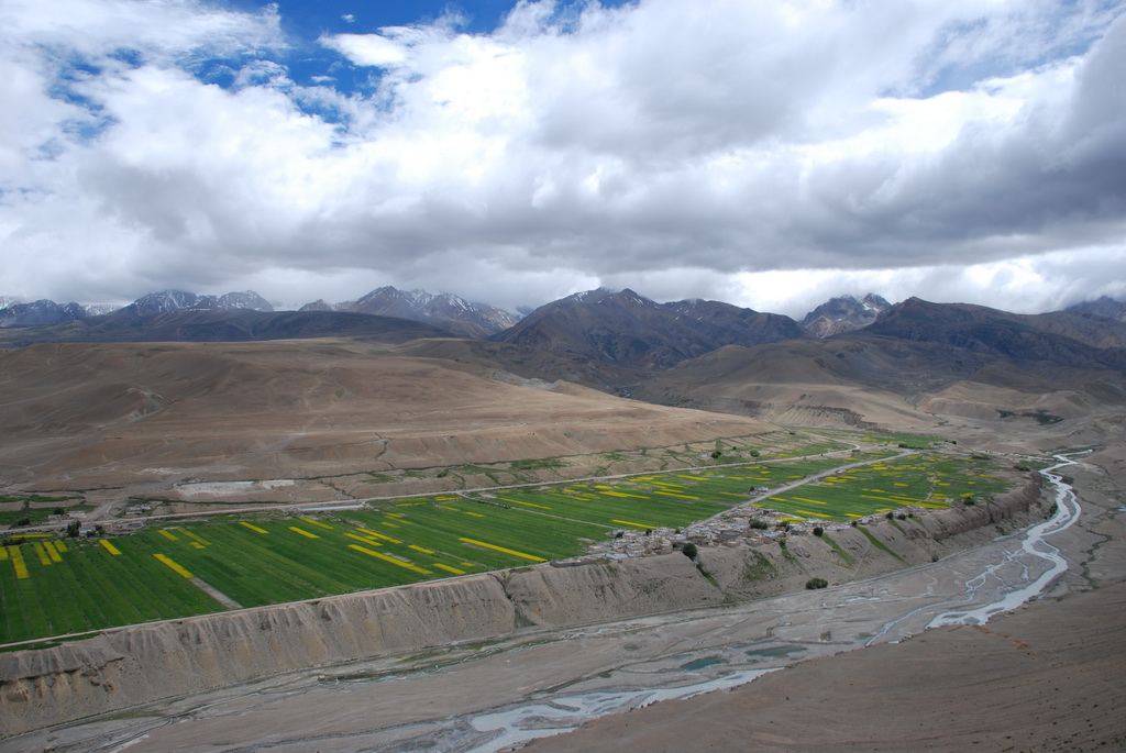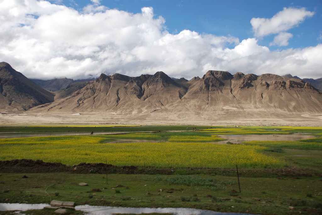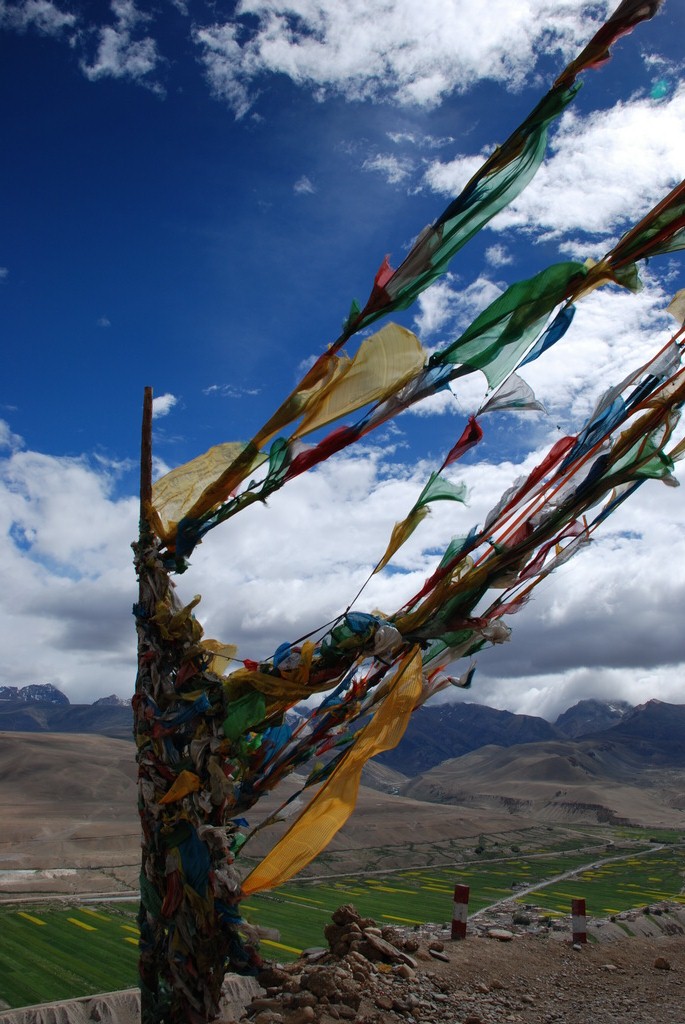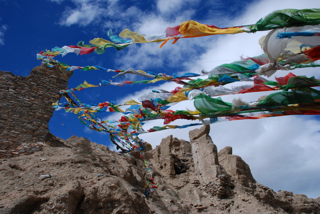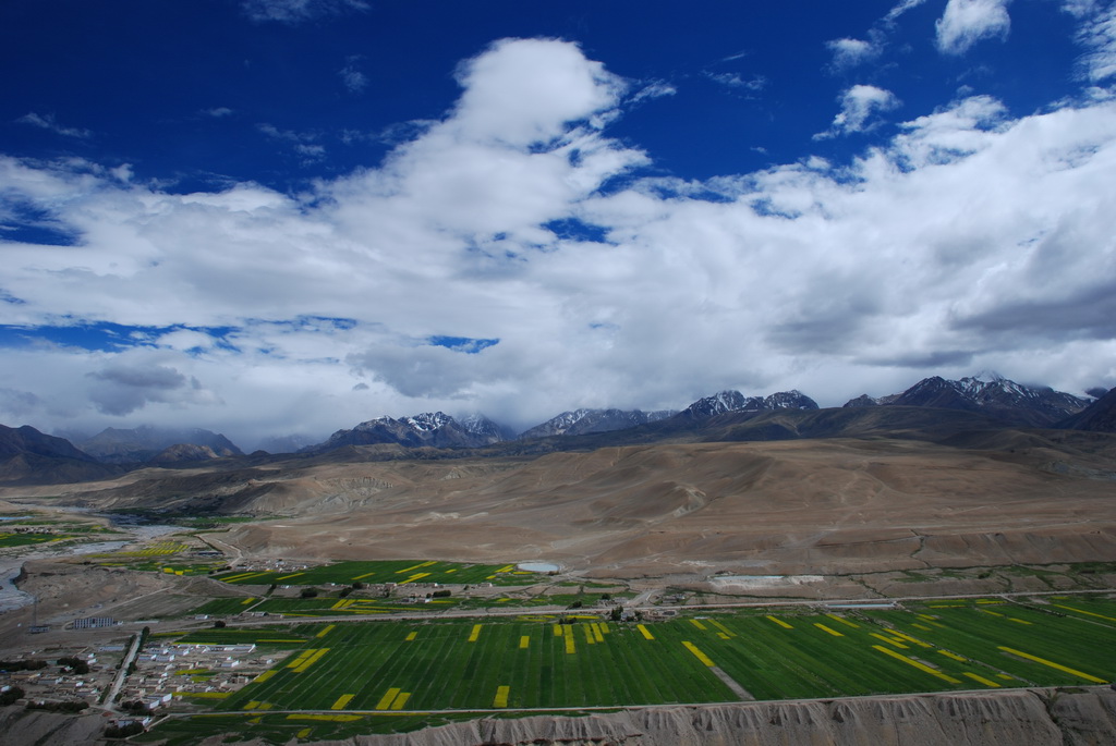 普蘭是一個小縣城,早期是通往尼泊爾的口岸。從山上香柏寺俯瞰普蘭,孔雀河流經縣 城,農田種滿了油菜正盛開著大片黃色小花,像是大地的畫布,把普蘭妝扮得多彩多姿。香柏寺位在地勢險峻的砂石高地上,曾經是孔雀王朝的遺址。千百年前這個小鎮,就已住著一群人,他們在這塊土地上努力生活著,也堅定虔誠的信仰著,至今依然不變。不過這個孔雀王朝應該不是指古印度的孔雀王朝,純粹只是與孔雀河流過有關。孔雀河沿著山谷蜿蜒流過,流經喜雅拉山脈,流入恒河,滋潤了印度、孟加拉 等古國文明。王朝已亡,只剩殘破的殿堂,留下歷史的遺跡,供後人憑弔。