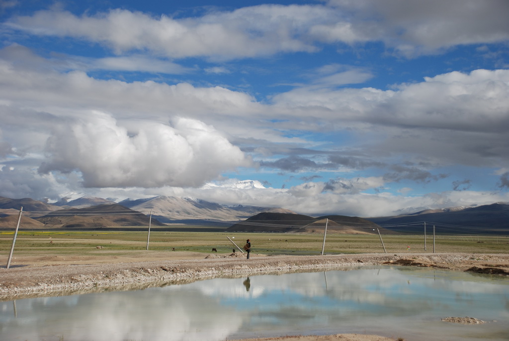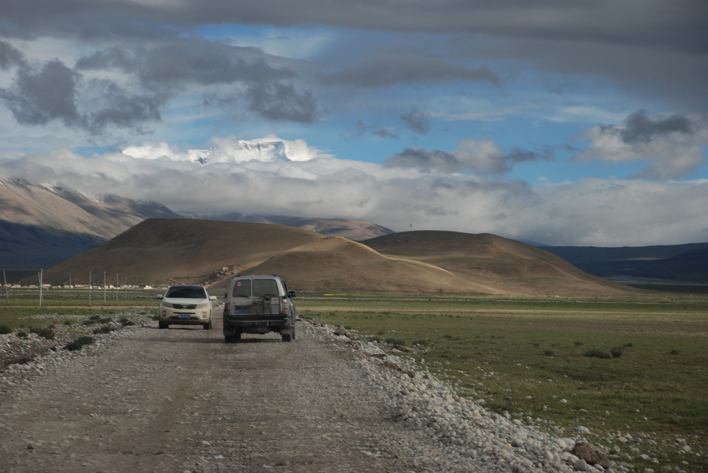 16:25終於抵達定日縣城,最晚的午餐時間。過了老定日,車道全是泥土路。車隊開在草原上,雖有既定的道路,可是比較顛簸,開車師傅們就各顯神通,自己找便道開。下午七點來到崗嘎村的安檢站,這裡可見卓奧友山,旁邊的小水池還有倒影,這可是來到西藏以來看得比較清晰的山容。