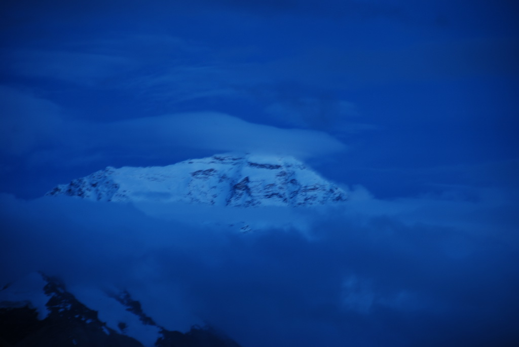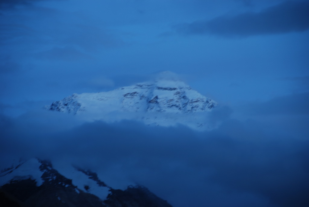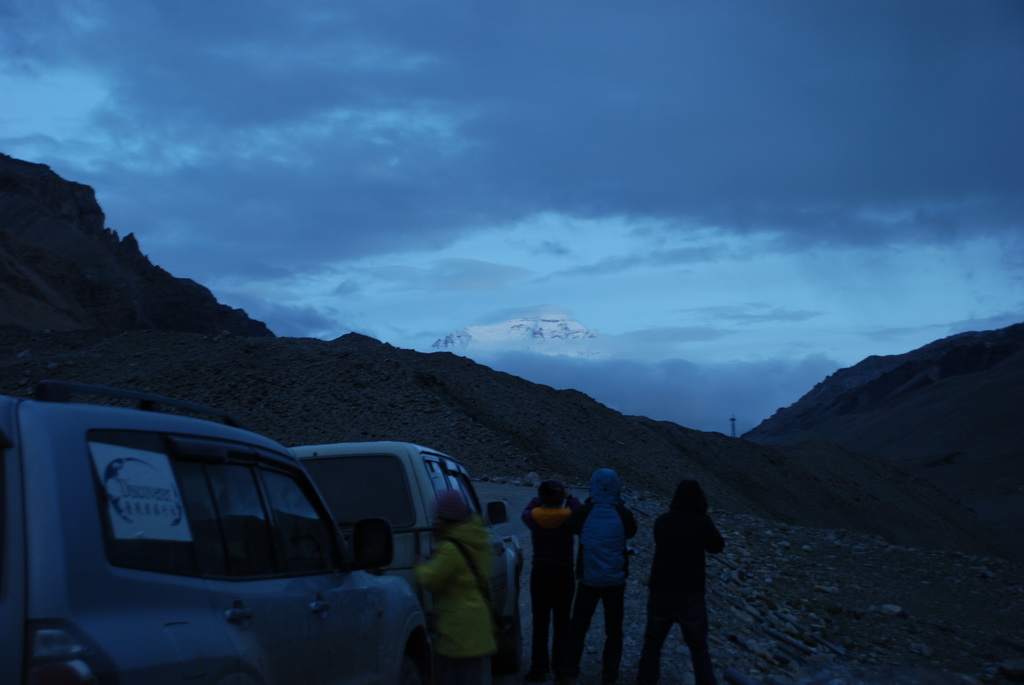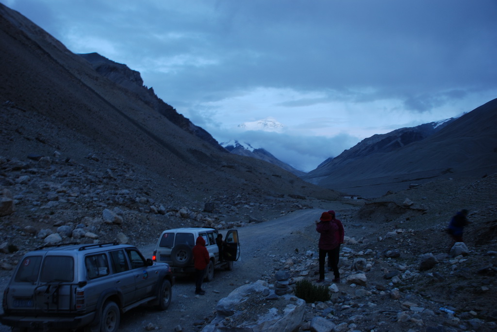 時候已近黃昏,距離絨布寺卻還有很遙遠的距離,本來今天期待的珠穆朗瑪峰,是愈來愈不可能見到了。沒想到就在快到絨布寺的高點,遠處露出珠峰的身影,車隊立即停車讓大家一飽眼福。雖然在昏暗的光線下,並不能拍得多麼清晰,也已可滿足大家的期望。把更精彩的山景暫時寄望在明天。21:30終於抵達絨布寺。晚餐後走到戶外,今晚星空十分燦爛美麗。