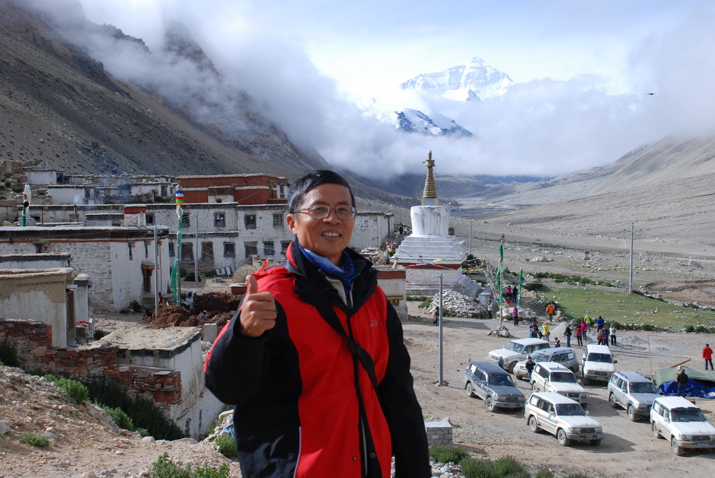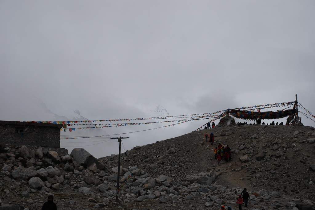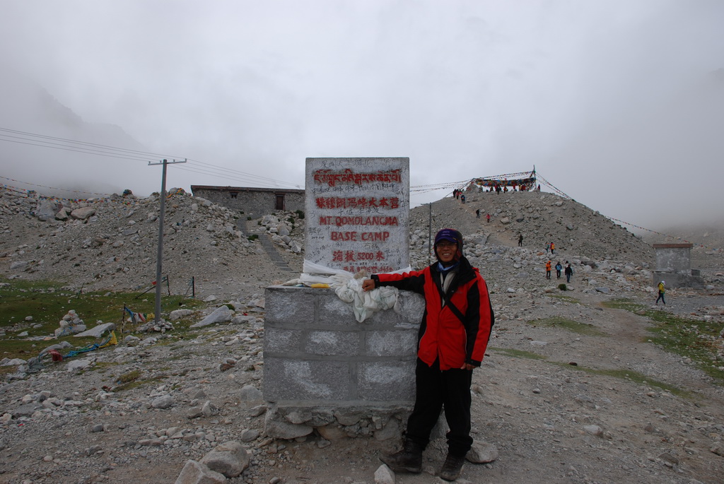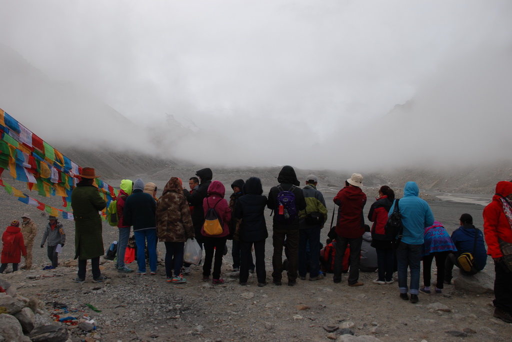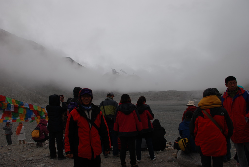 轉乘環保車前往基地營,天空的雲並未散去,珠峰露臉的機會渺茫。在基地營往珠峰的方向看去,偶爾露出一點點山的岩壁、雪壁,雖已知道那不是珠峰的山頂,大家還是猛按快門,至少它也是珠峰的一部分。近年來大家在風景區拍照,總是喜歡玩跳躍起來的動作。崖邊一位看似來自香港的遊客,看她已跳了近十次,沒拍到喜歡的畫面絕不罷休。佩服她在這麼高的海拔,還能玩得那麼High。青藏高原已是世界屋脊的屋脊,大家還嫌不夠高,想跳得比珠峰還要高。