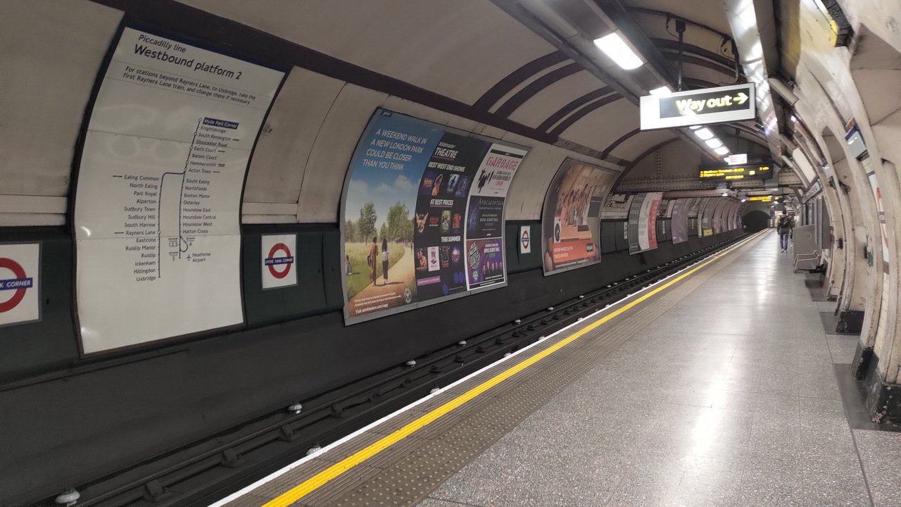 出了航廈轉入通往地鐵的通道,走了好久都要懷疑是不是走錯了。終於看到地鐵站,先到購票機前買Oyster卡。出國前有先了解一下流程,來到機器前按了幾次鍵,看看畫面,下一步不知道該怎麼辦了。向工作人員求助,卻發生溝通上的障礙。後來回想才發現,原因是出自我閱讀了過時的訊息,而又沒能在現場即時領悟。只好讓工作人員去忙他的事,我們自己繼續研究。此時後方傳來熟悉的語言,"需要幫忙嗎?"。一位來英國遊學的小姐,到機場接父母到英國旅遊,協助我們完成了和機器的對話。