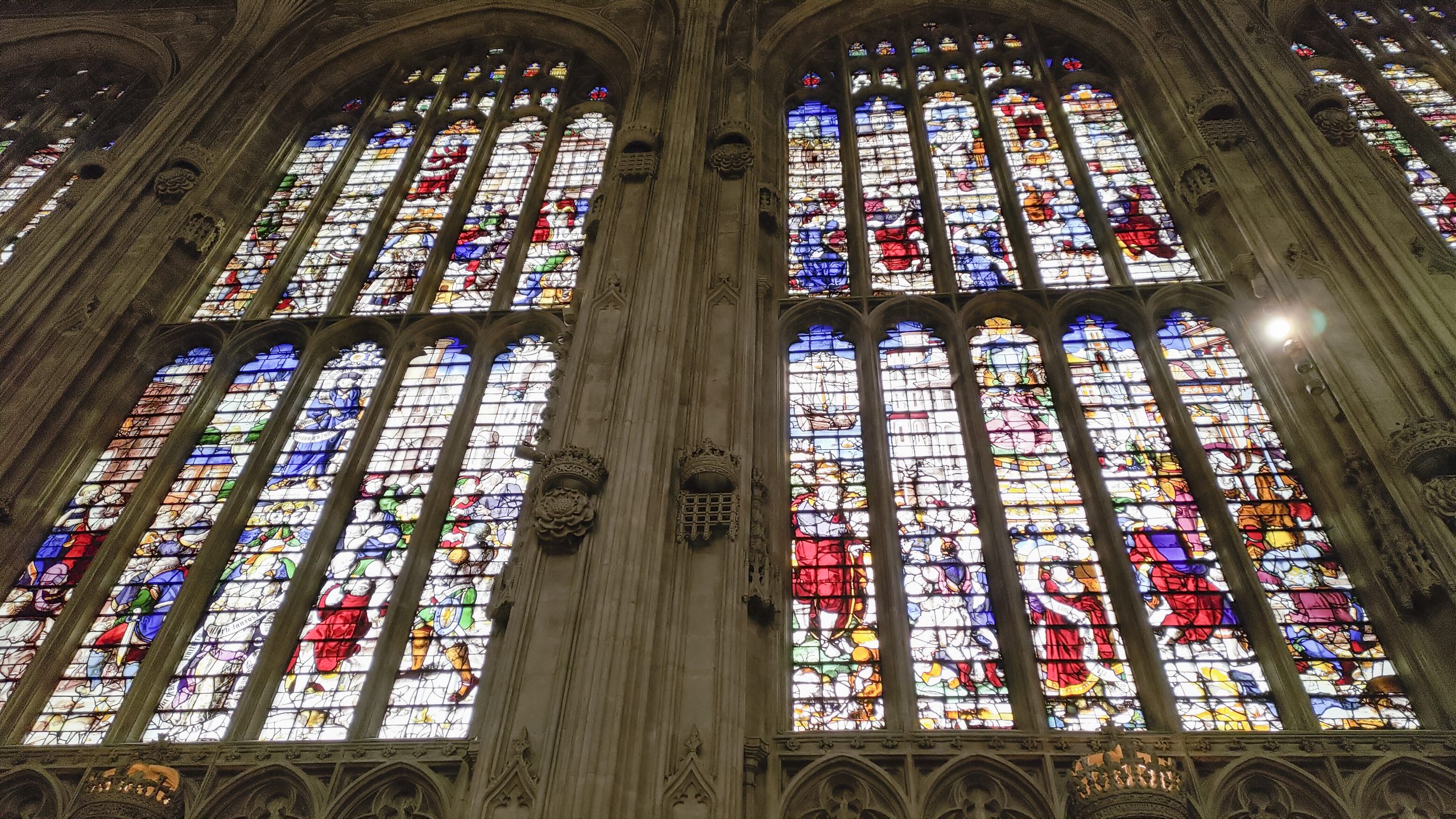 從康河概覽了大學城,回到街上買了國王學院的門票。最近只有國王學院開放供遊客參觀,其他的學院可能是因為教學因素而未開放。國王學院教堂是十五世紀哥德式建築,高聳的尖塔,精美的雕像,顯得無比的莊嚴神聖。教堂內絢爛奪目的彩繪玻璃,透過聖經的故事,教堂內充滿了神聖的氣息。
