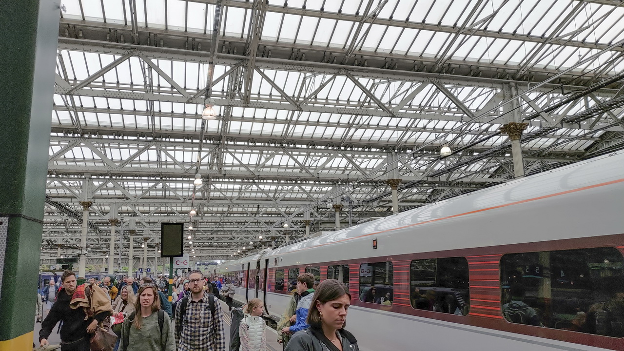 昨晚先行到火車站訂好了座位,如何搭火車已經都清楚了,很快就正確的找到了車廂。乘客陸續上車,沒想到居然已接近客滿了,有幾位沒有訂位的人,在車廂內來回走了幾回,還沒有找到合適的座位。倫敦到愛丁堡約有630公里,需要4.5小時。這班火車停的站很少,算是快速的班次。這二天搭乘火車,車外風景優美,離開城鎮的車站不久,很快就會出現大面積綠油油的草地。再仔細觀察也沒有看過平交道,同行夥伴說曾經看過一個。
