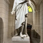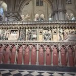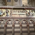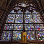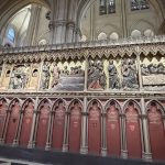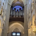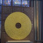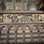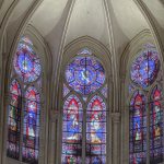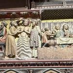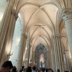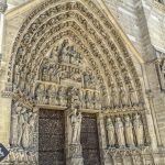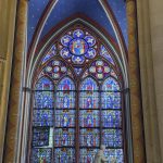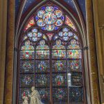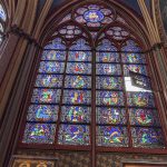 從中間的末日審判門進入教堂,教堂內其實已經來了許多朝聖的遊客。大家都肅穆的,依參觀方向前進。我們對西方宗教只有膚淺的認識,找了幾幅牆壁上的浮雕,使用著Google 翻譯 App 逐一對照著解說文字。整座教堂,寧靜莊嚴,高聳的中殿,各面牆壁上的彩繪玻璃,述說著宗教的故事,是人類文明遺留下來的珍貴藝術品。