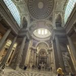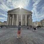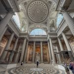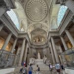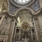先賢祠,是法國著名文化名人、政治家、將領、畫家、宗教家等的安葬處。建築物的立面是仿羅馬萬神殿而建。正面由科林斯柱組成柱廊,主體呈十字形。內部高83公尺的圓頂,懸吊著一個鐘擺,是證明地球自轉的實驗設施_傅科擺。地下樓層是安葬名人的地方,我們進去向居禮夫人、雨果、伏爾泰等致敬。