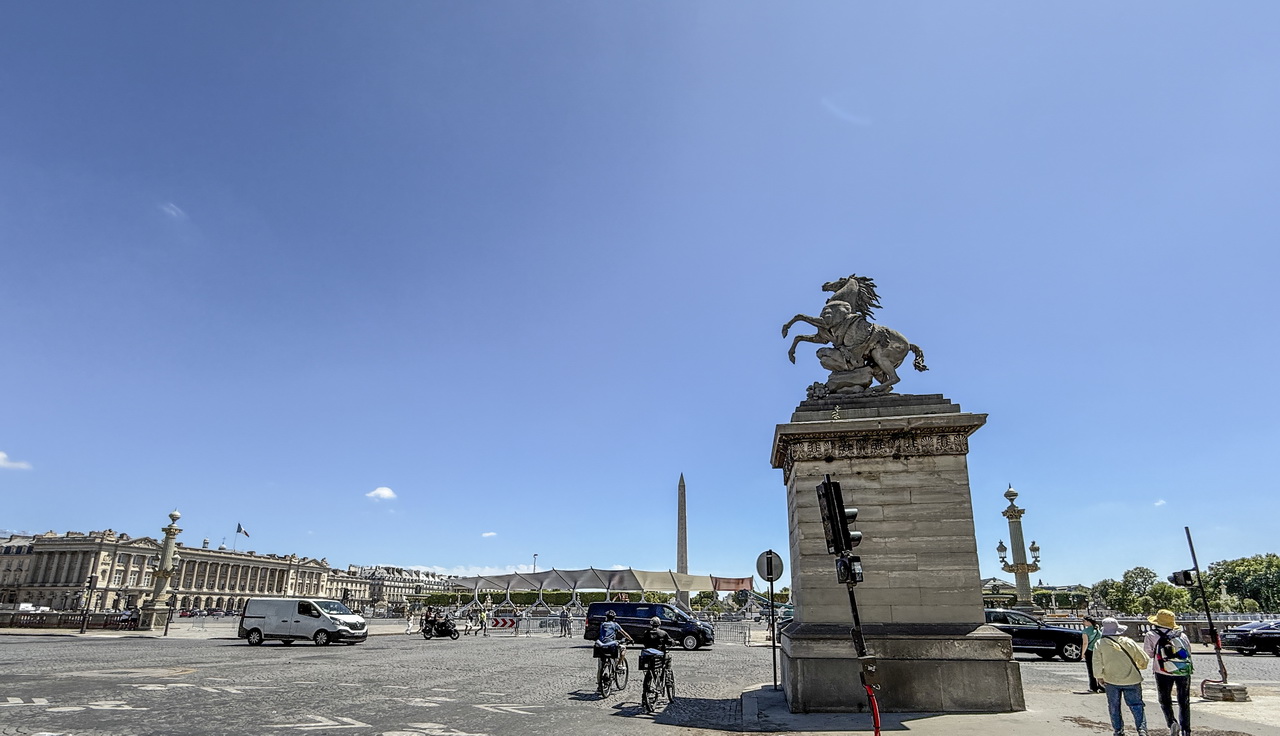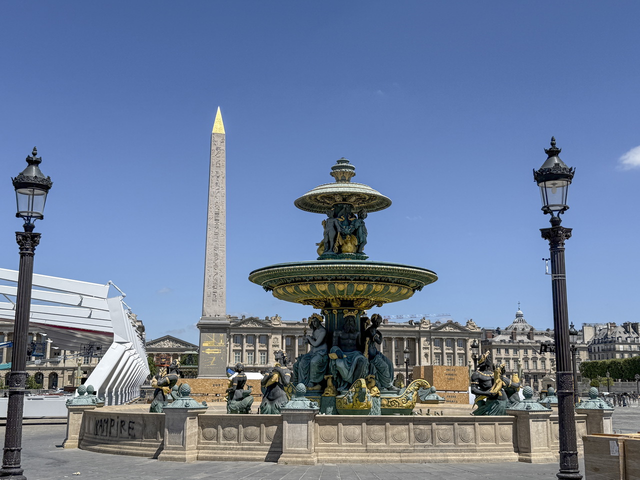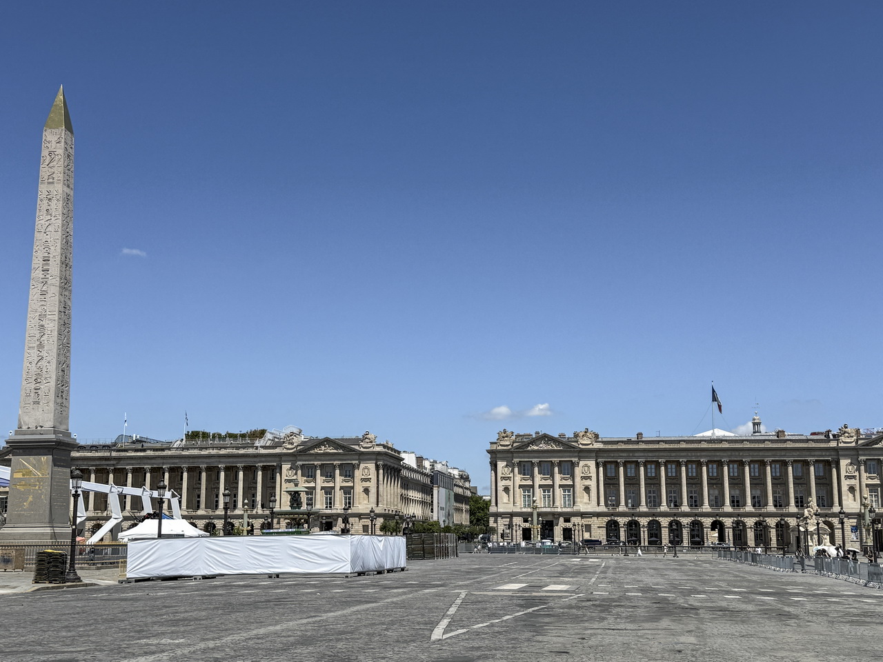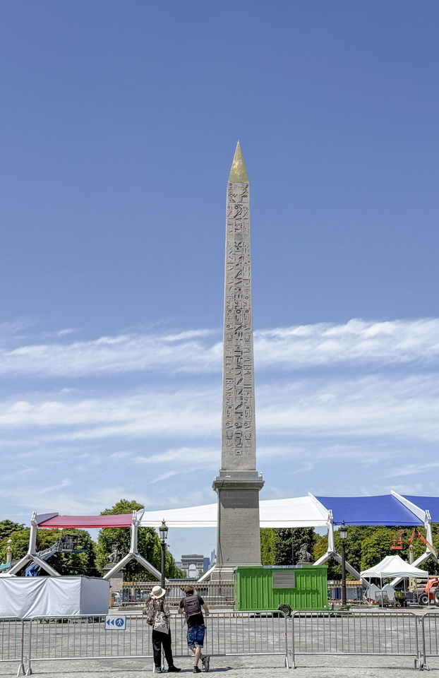 沿著被稱為世界最美麗的香榭麗舍大道,往協合廣場方向散步。浴途知名品牌商店林立,我們只是路過,沒有進去逛,一路來到協合廣場。為了七月十四日的國慶,週邊正在進行著看台等相關工程。大範圍的區域以圍籬圍住了,景觀也就醜了許多,照相取景得想辦法避開。2019年11月曾到埃及旅遊,記得路克索神殿門前的方尖碑,只剩右側一支,左側的另一支現在已經矗立在協合廣場。所以,今天一定要看看這支流浪到法國的方尖碑。