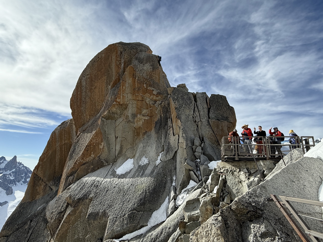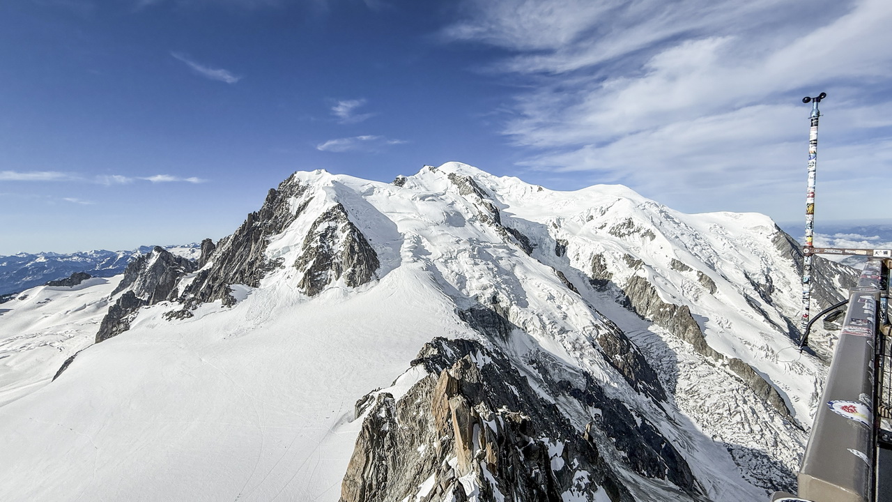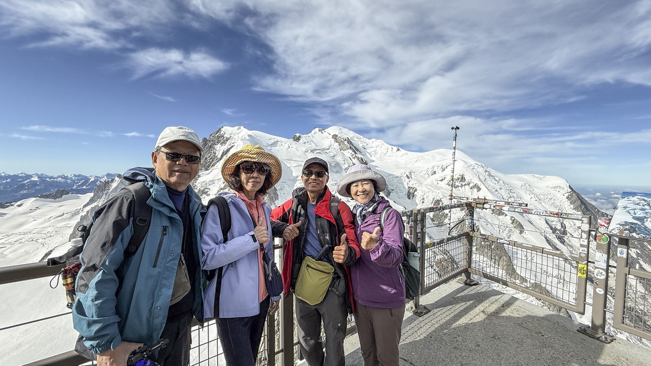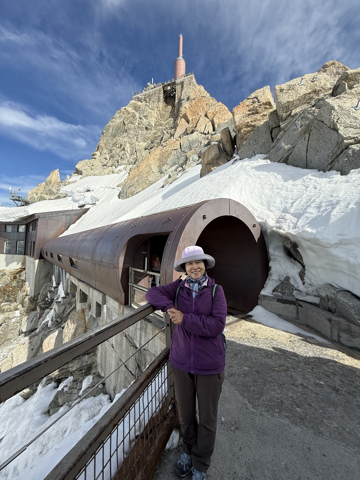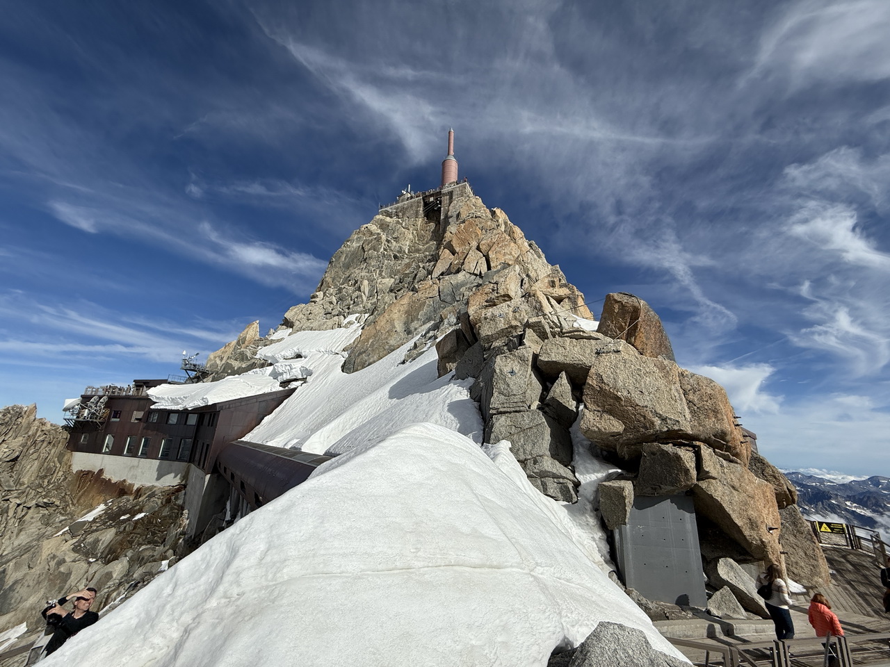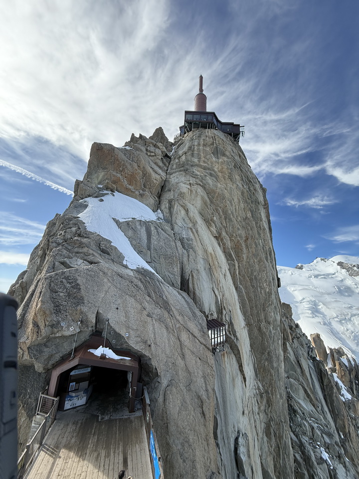 纜車站就建在南針峰的岩泂裡,觀景台已經快到山頂。在這裡眺望不遠處的白朗峰,滿足了眾多愛山人士不可能攀登的險峻山峰,卻可以近距離欣賞的名山。這裡的海拔已經超過3800公尺,千萬記得一切動作都要放慢一些,才不會給自己帶來不必要的麻煩。