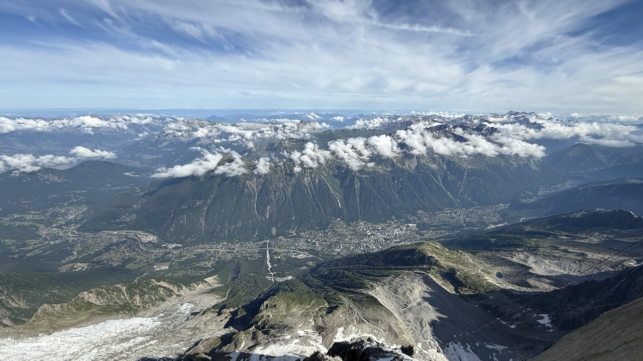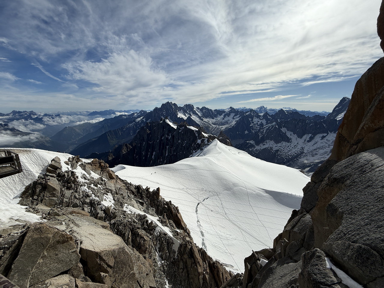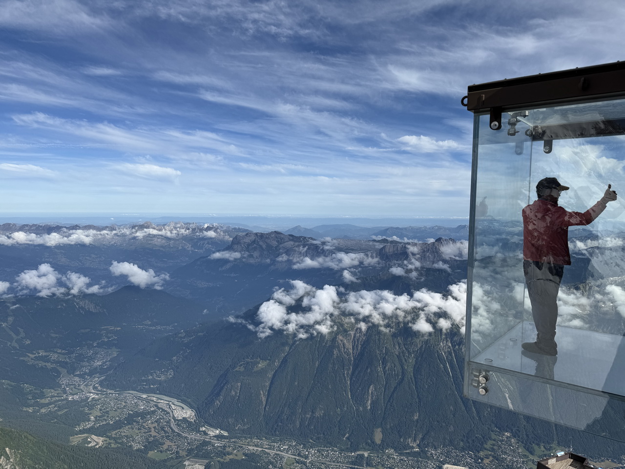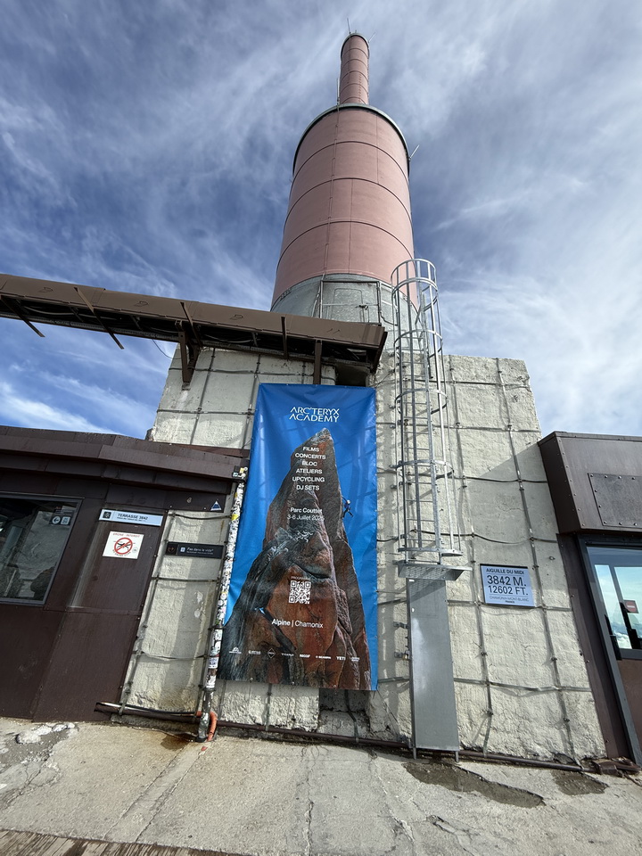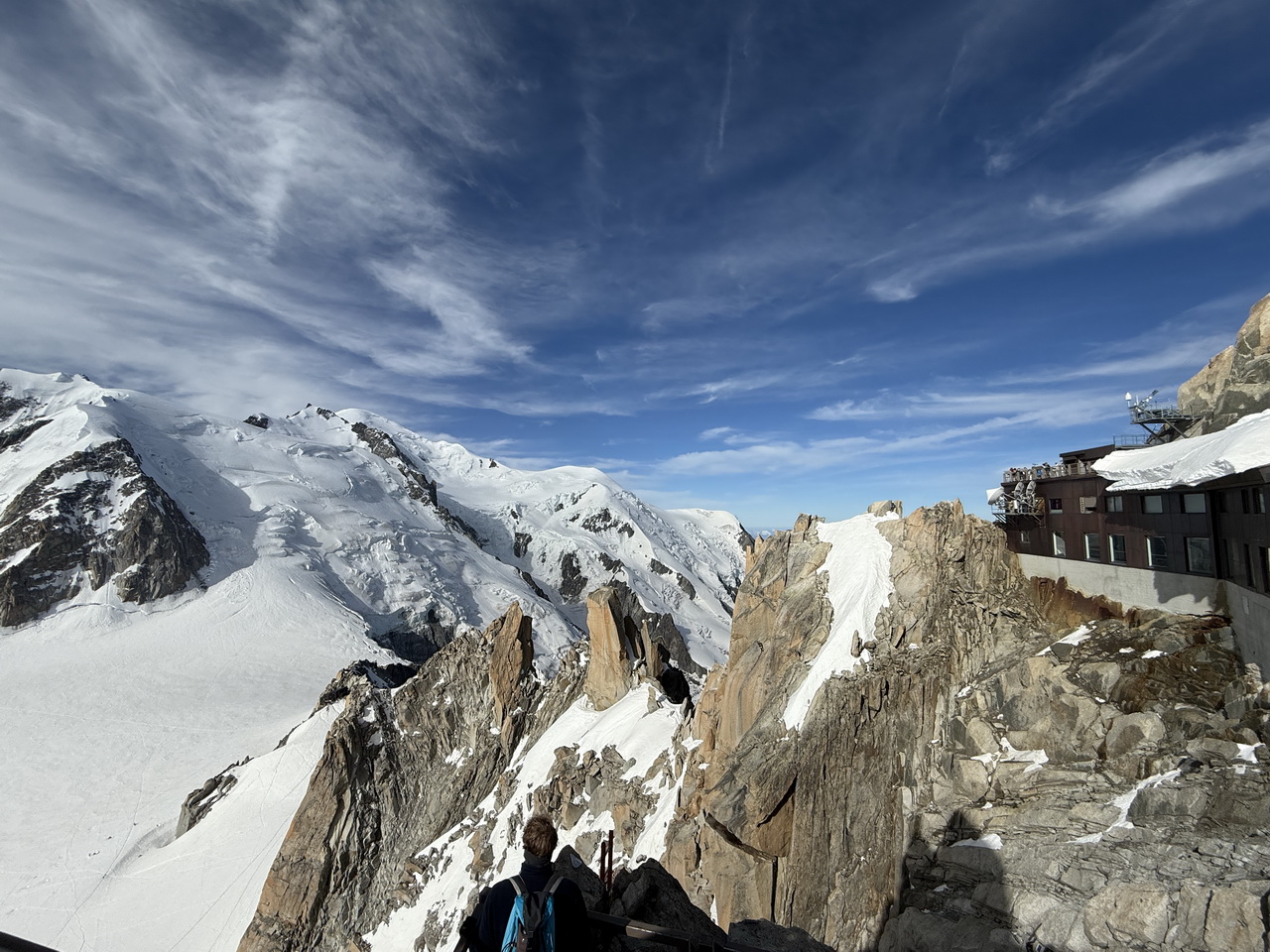 纜車站就建在南針峰的岩泂裡,觀景台已經快到山頂。在這裡眺望不遠處的白朗峰,滿足了眾多愛山人士不可能攀登的險峻山峰,卻可以近距離欣賞的名山。這裡的海拔已經超過3800公尺,千萬記得一切動作都要放慢一些,才不會給自己帶來不必要的麻煩。