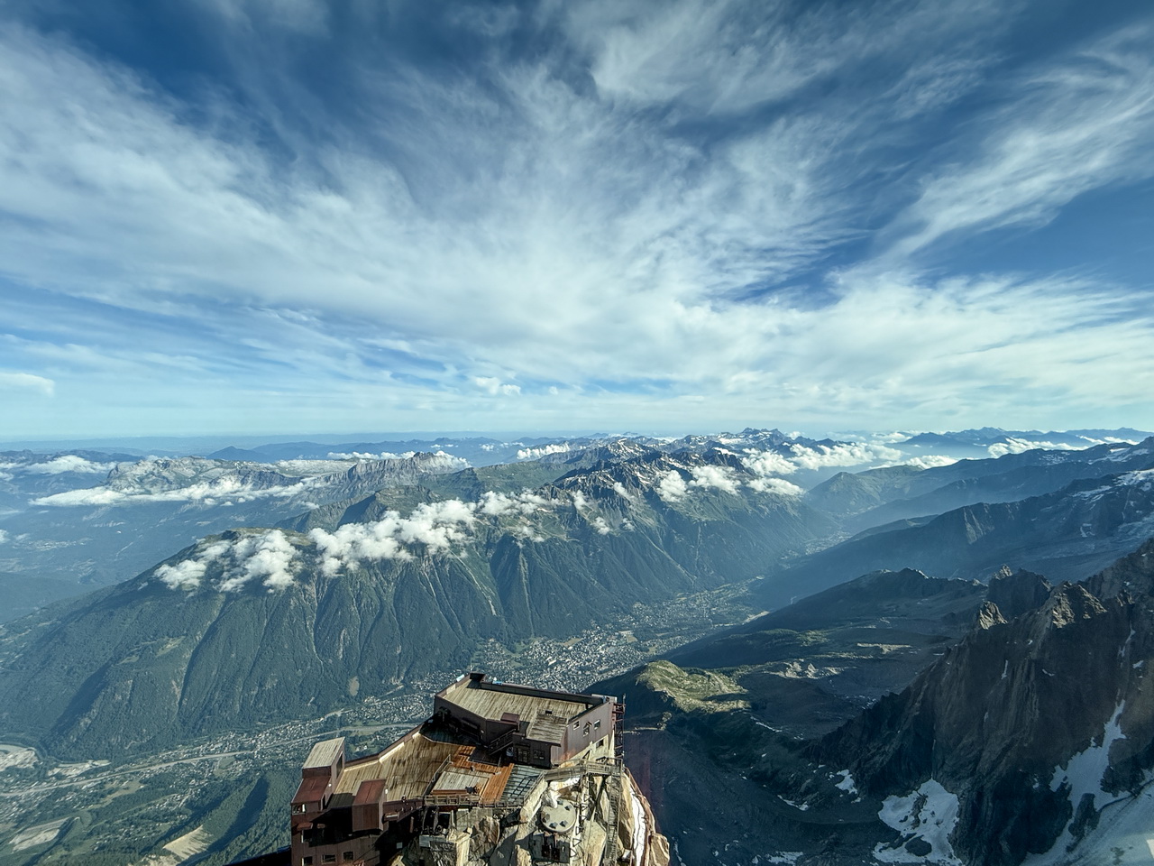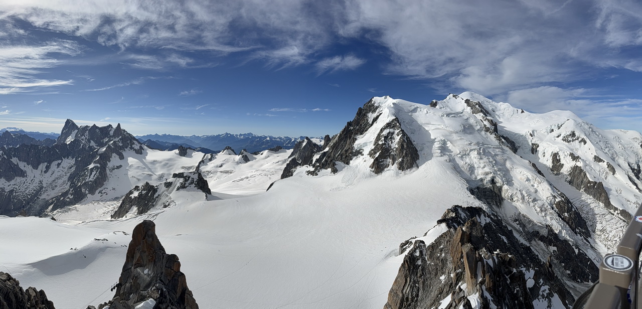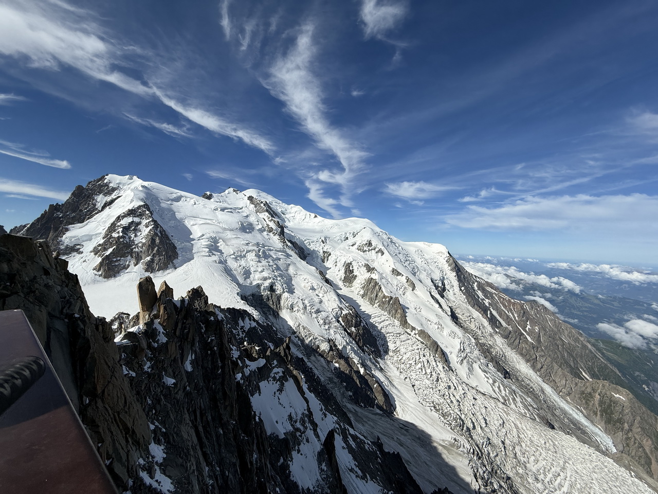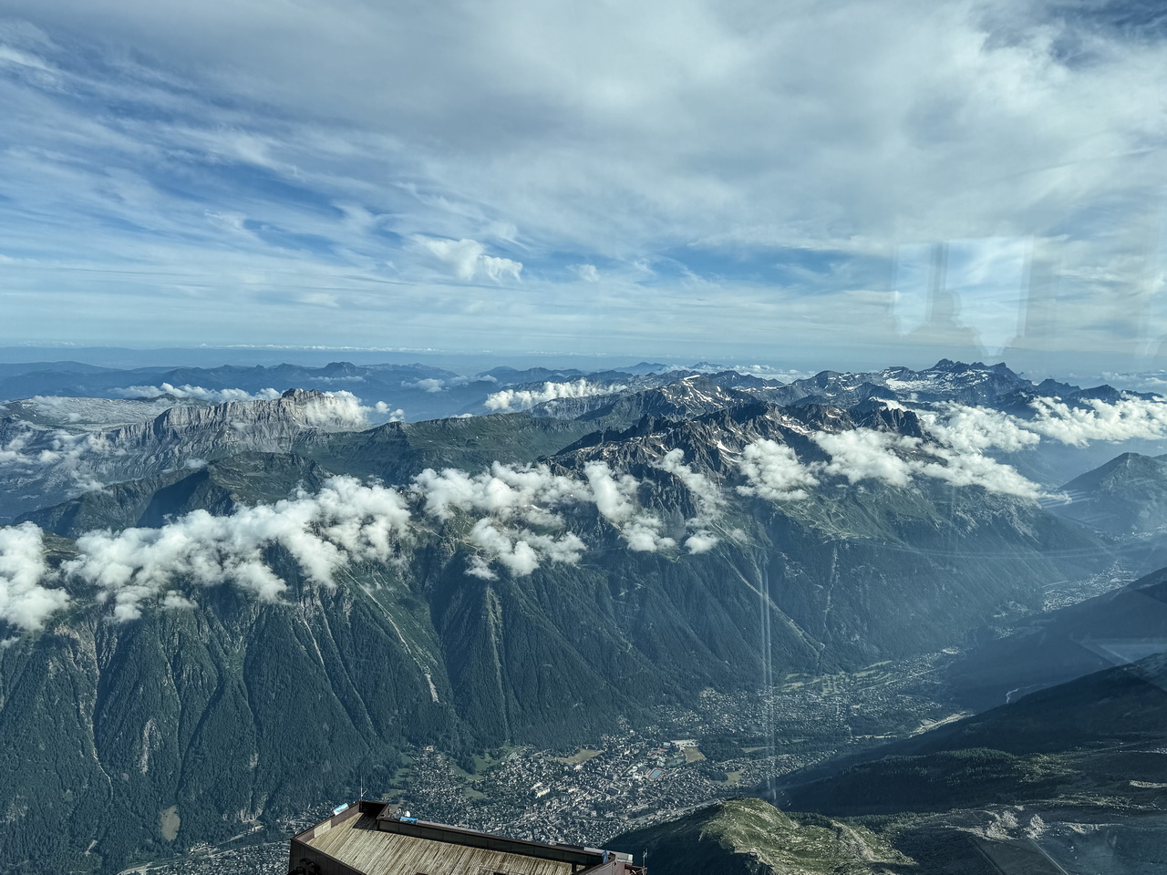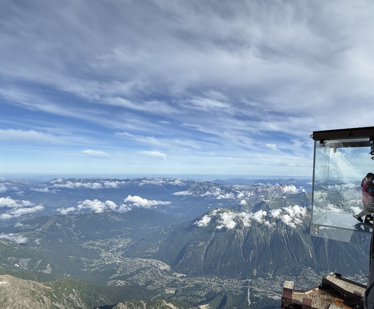 纜車站就建在南針峰的岩泂裡,觀景台已經快到山頂。在這裡眺望不遠處的白朗峰,滿足了眾多愛山人士不可能攀登的險峻山峰,卻可以近距離欣賞的名山。這裡的海拔已經超過3800公尺,千萬記得一切動作都要放慢一些,才不會給自己帶來不必要的麻煩。
