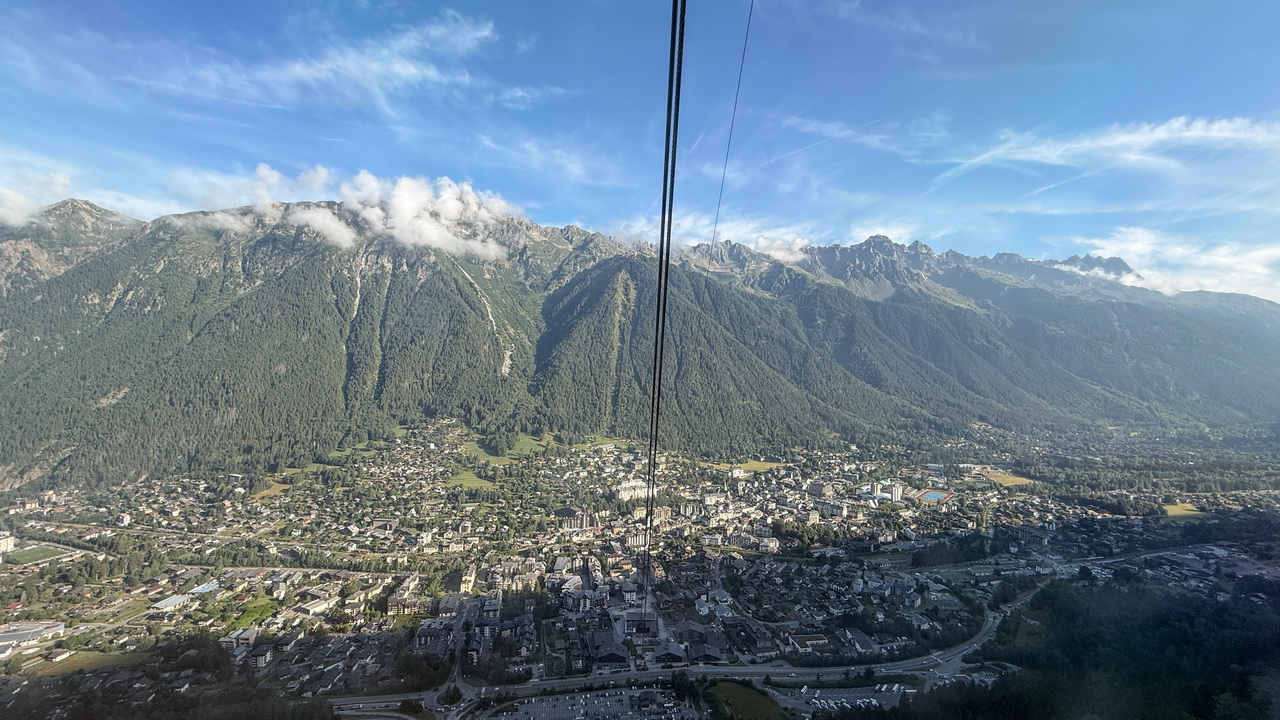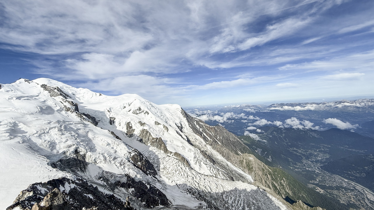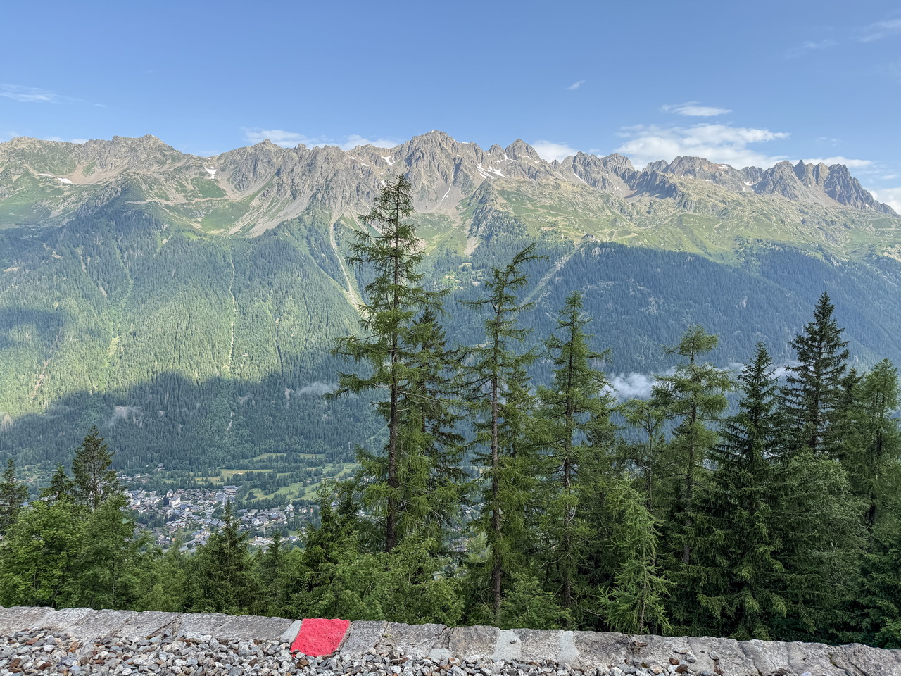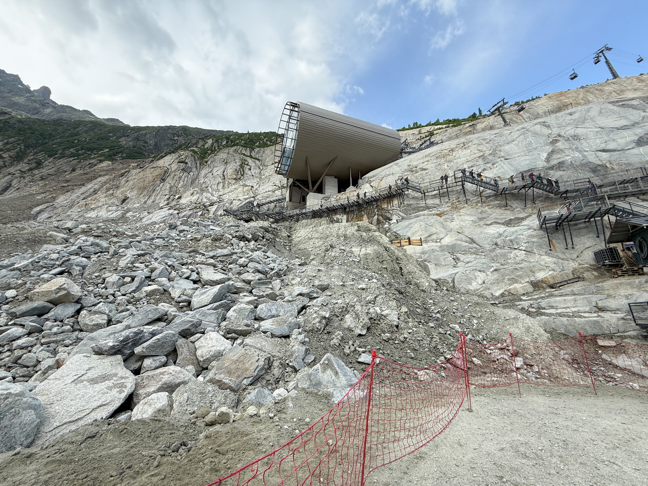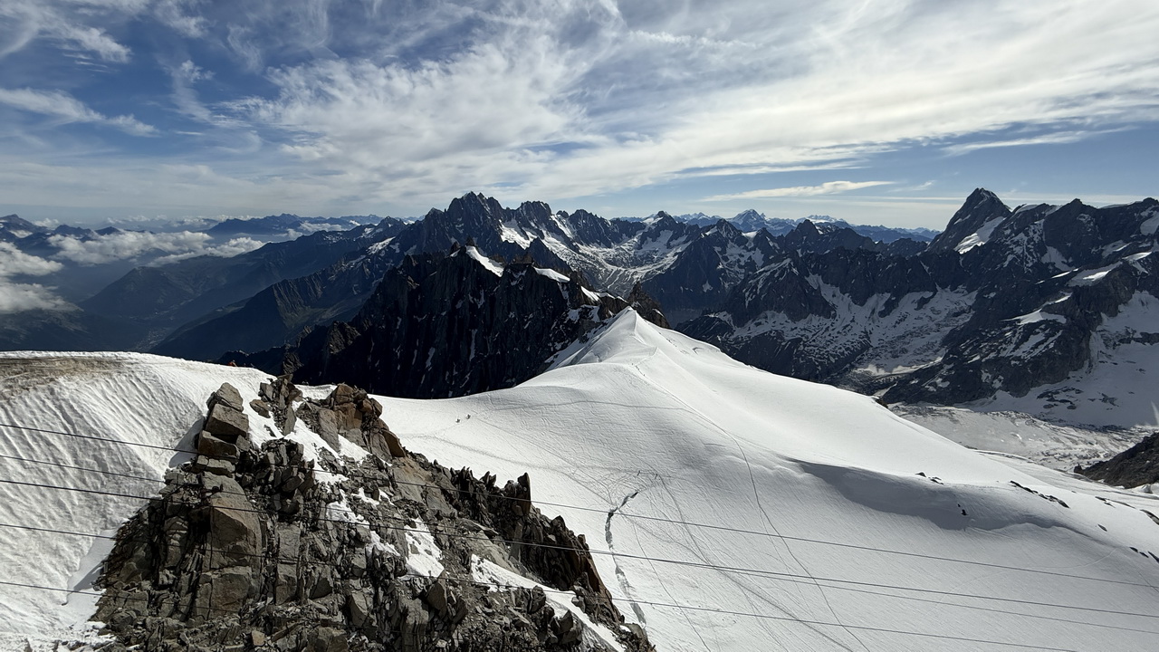 纜車站就建在南針峰的岩泂裡,觀景台已經快到山頂。在這裡眺望不遠處的白朗峰,滿足了眾多愛山人士不可能攀登的險峻山峰,卻可以近距離欣賞的名山。這裡的海拔已經超過3800公尺,千萬記得一切動作都要放慢一些,才不會給自己帶來不必要的麻煩。