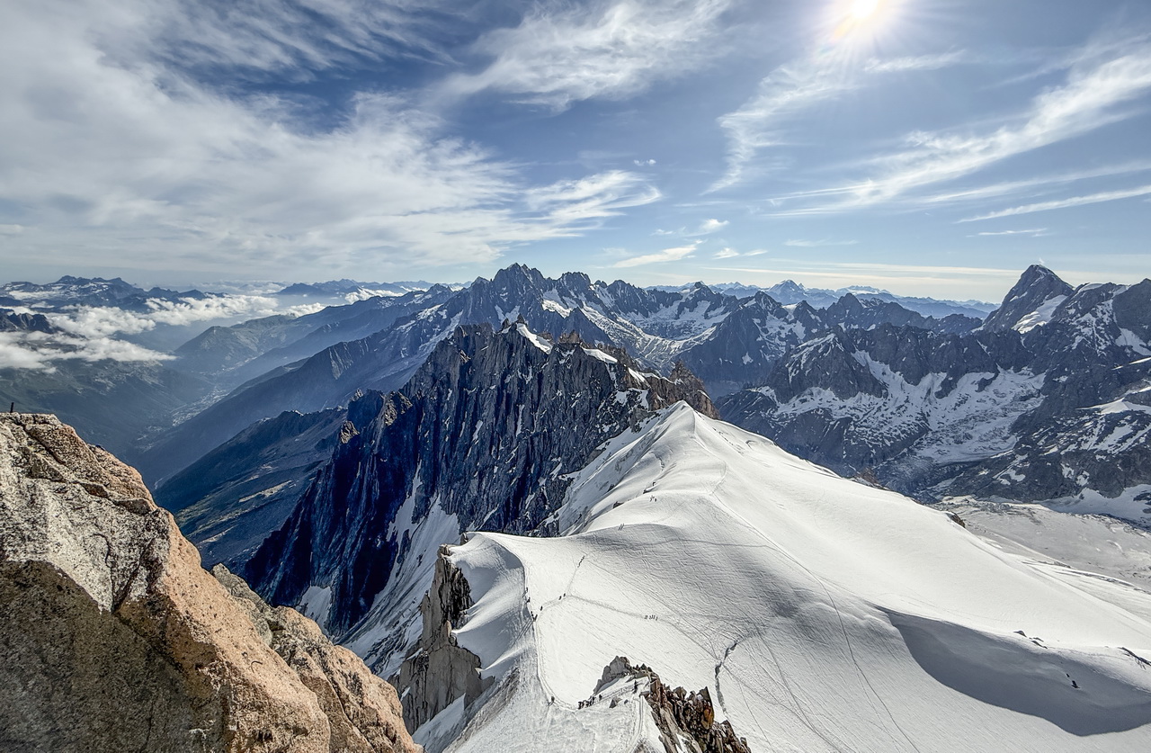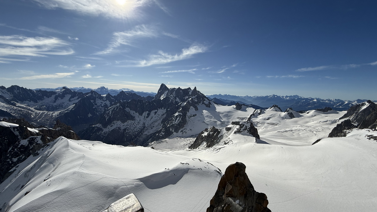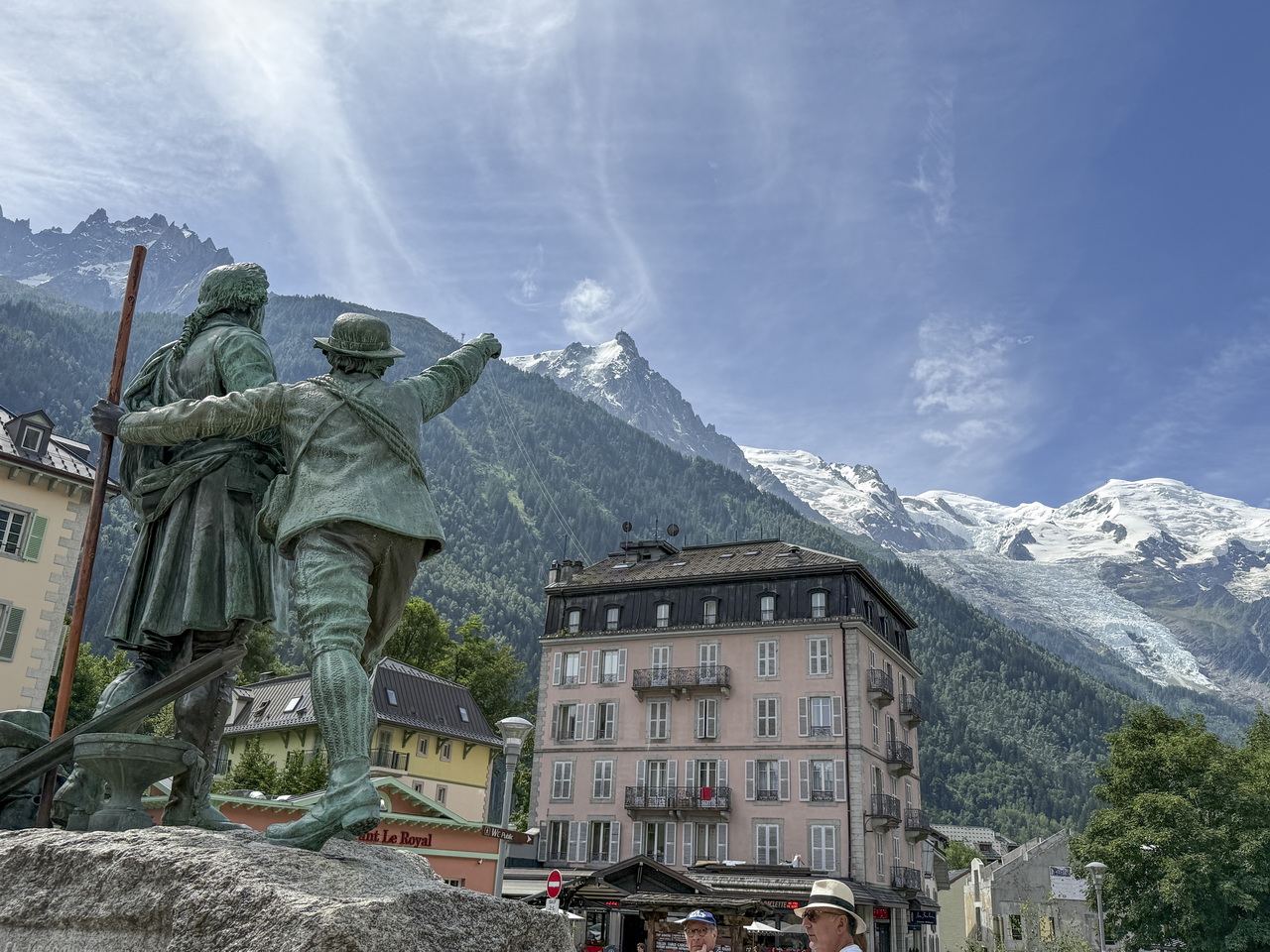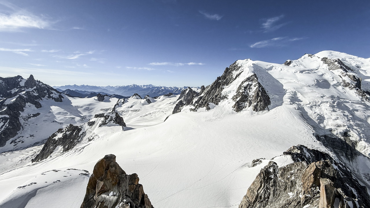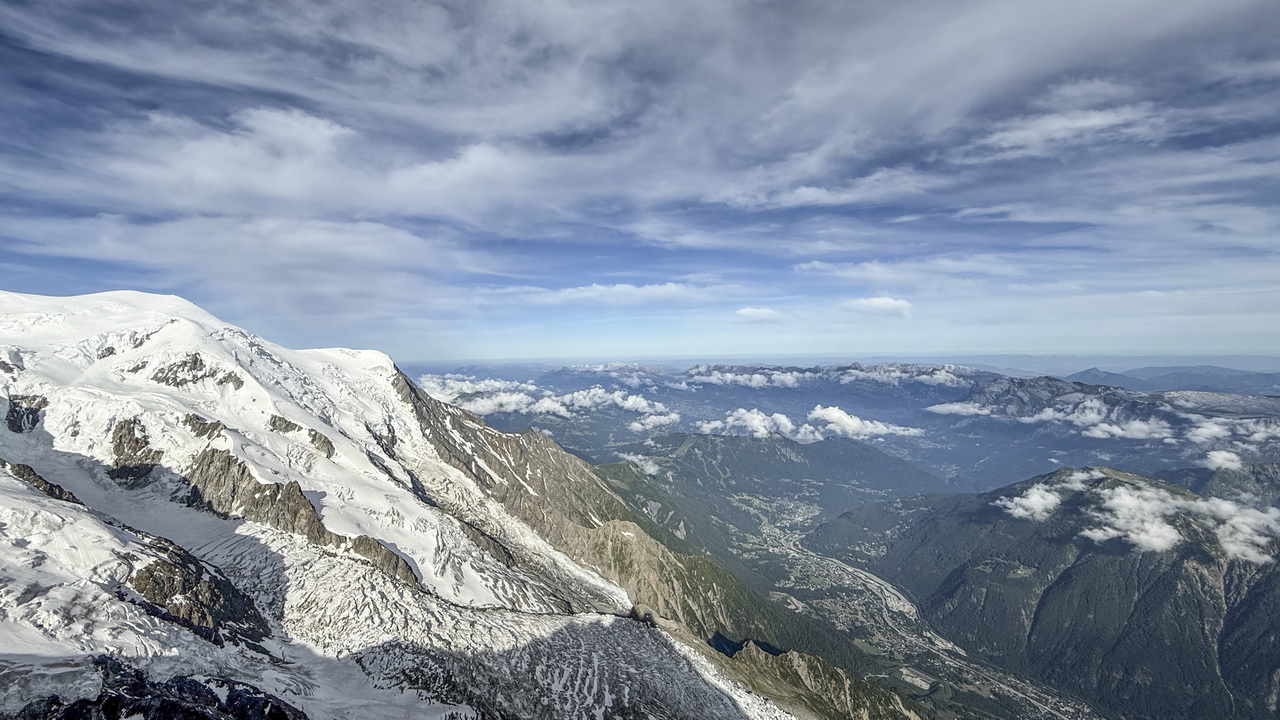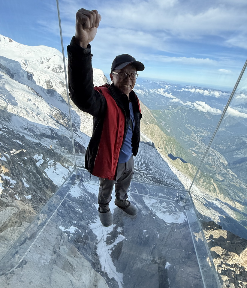 纜車站就建在南針峰的岩泂裡,觀景台已經快到山頂。在這裡眺望不遠處的白朗峰,滿足了眾多愛山人士不可能攀登的險峻山峰,卻可以近距離欣賞的名山。這裡的海拔已經超過3800公尺,千萬記得一切動作都要放慢一些,才不會給自己帶來不必要的麻煩。