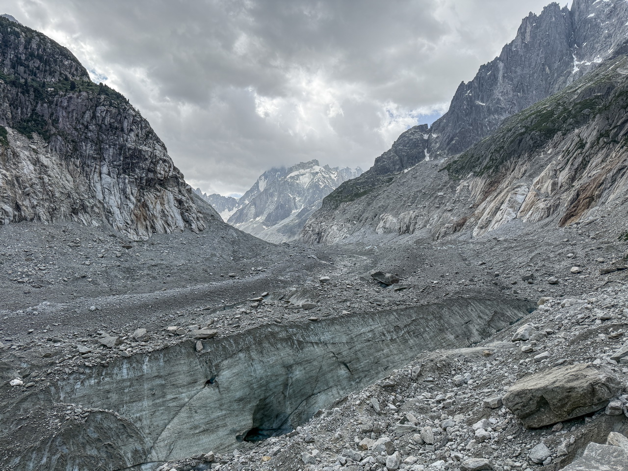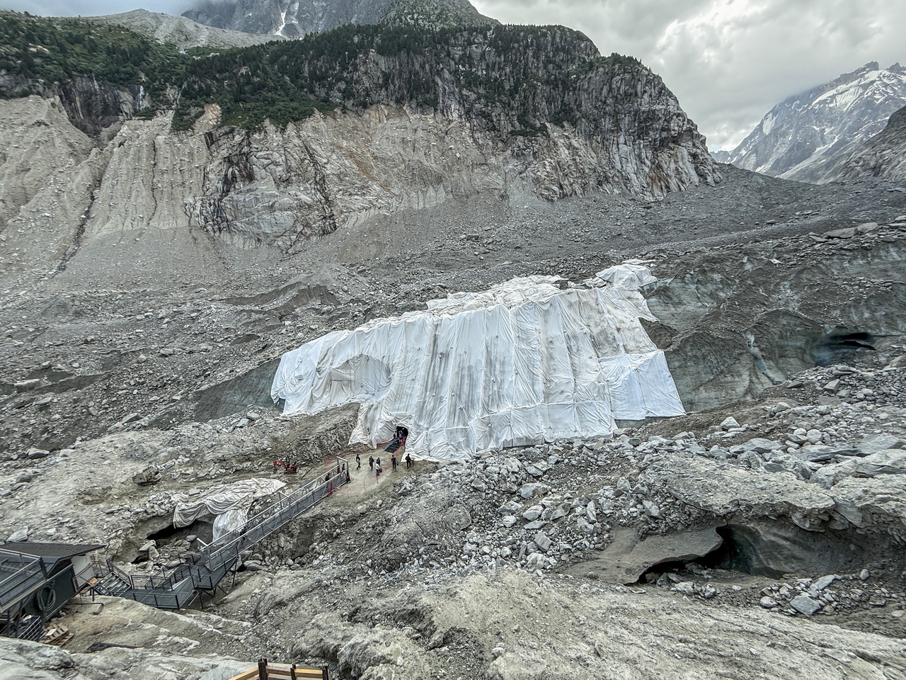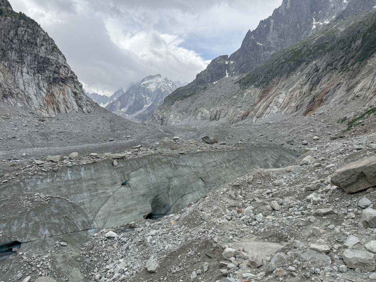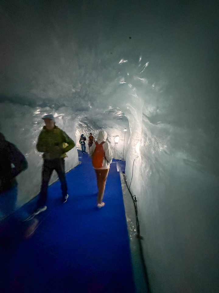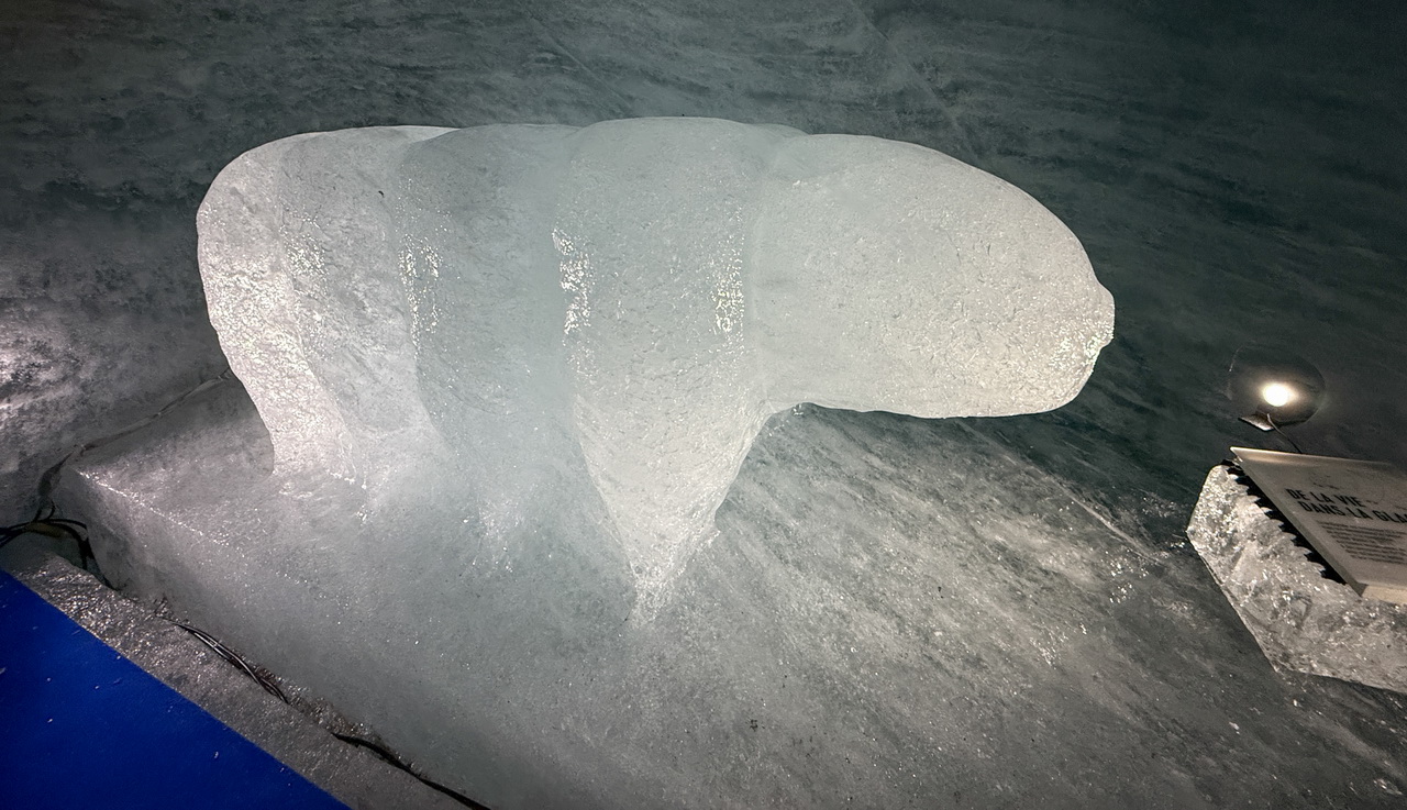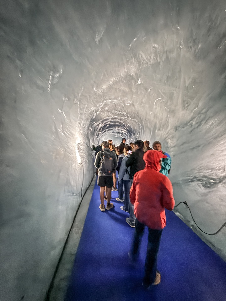 這條冰河受到自然環境影響,每年都在消退中。山谷上方的砂石受到雨水的沖刷,不斷的覆蓋在冰河的上方。因此,這條冰河看起是砂石的顏色。景區管理方在冰河鑿出了一個冰洞,裡面展示冰河的相關知識,和幾座冰雕。在冰河上方的平台往下看,開挖冰洞所遺留的現場,我個人覺得這是對冰河一個很大的考驗。可能是我們這幾天看了太多的高山雪景、冰河等。今天的景點,就沒有那麼高的新鮮感了。