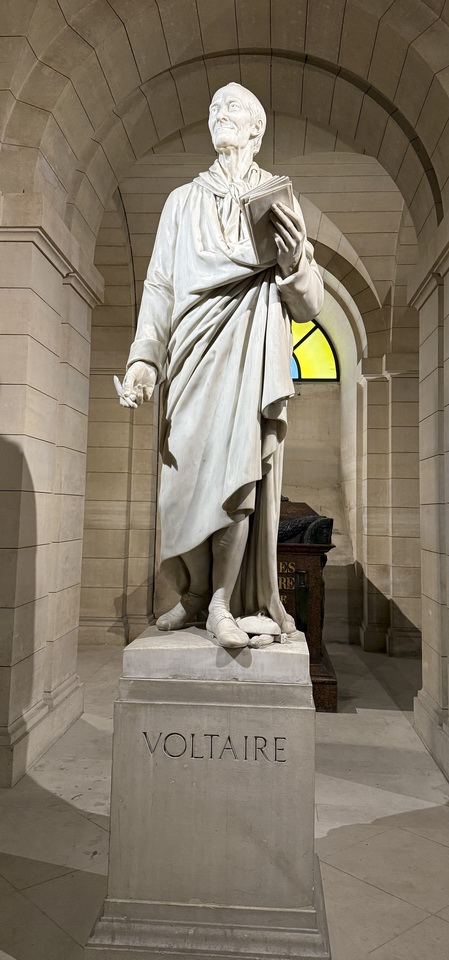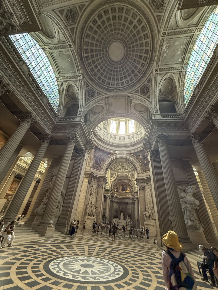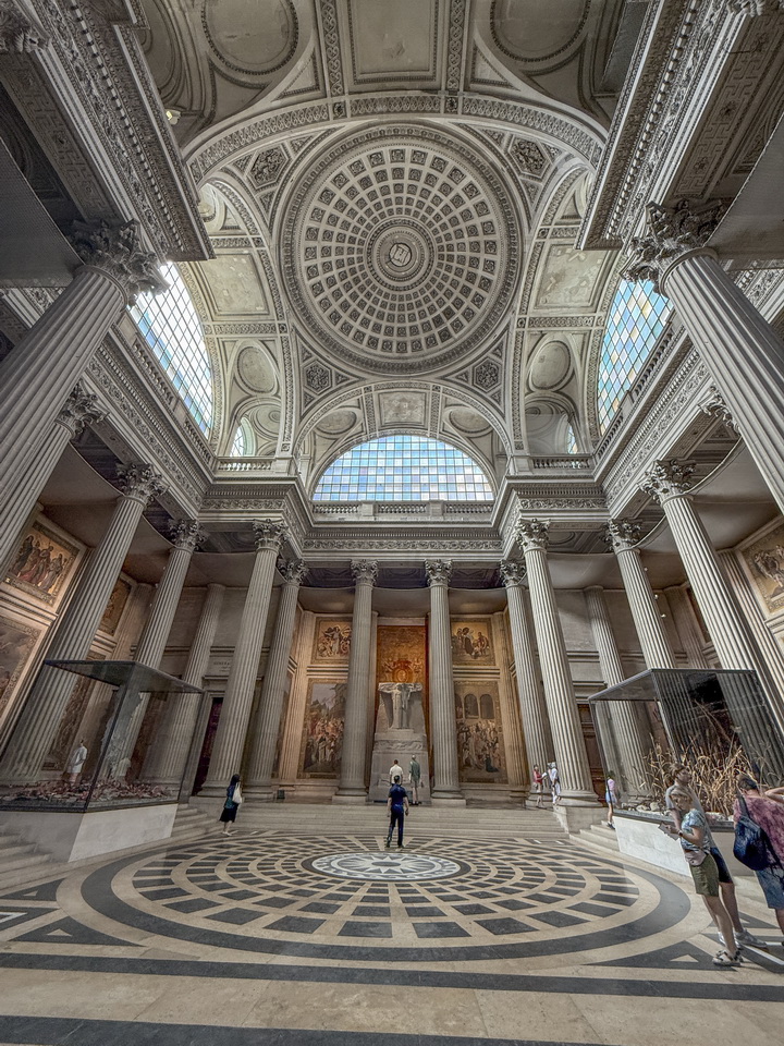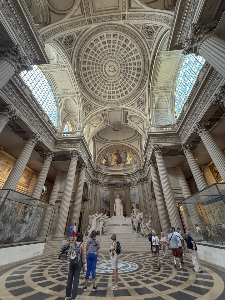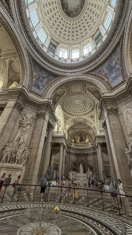 先賢祠,是法國著名文化名人、政治家、將領、畫家、宗教家等的安葬處。建築物的立面是仿羅馬萬神殿而建。正面由科林斯柱組成柱廊,主體呈十字形。內部高83公尺的圓頂,懸吊著一個鐘擺,是證明地球自轉的實驗設施_傅科擺。地下樓層是安葬名人的地方,我們進去向居禮夫人、雨果、伏爾泰等致敬。