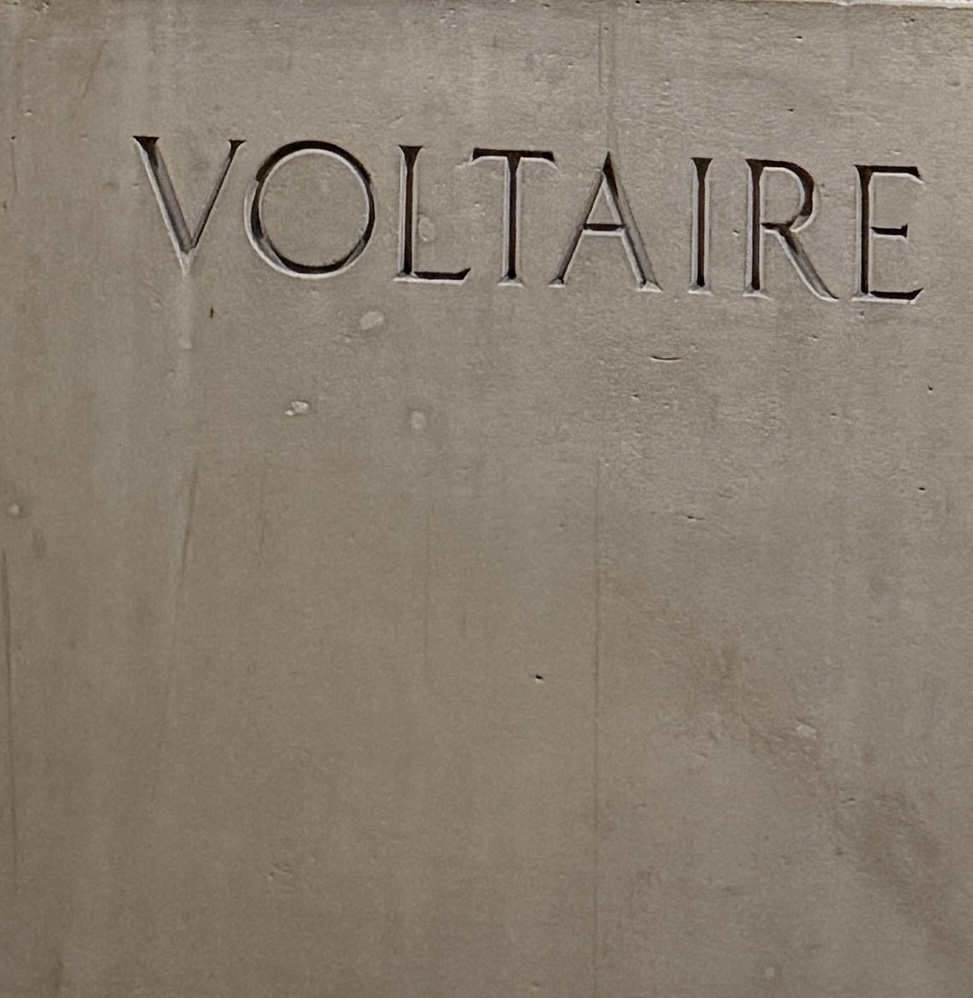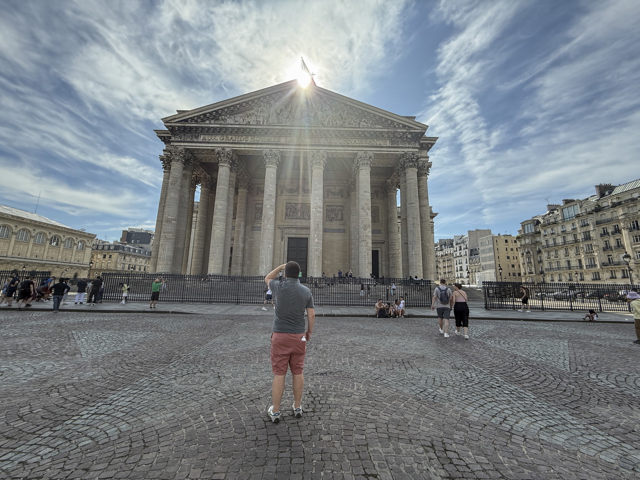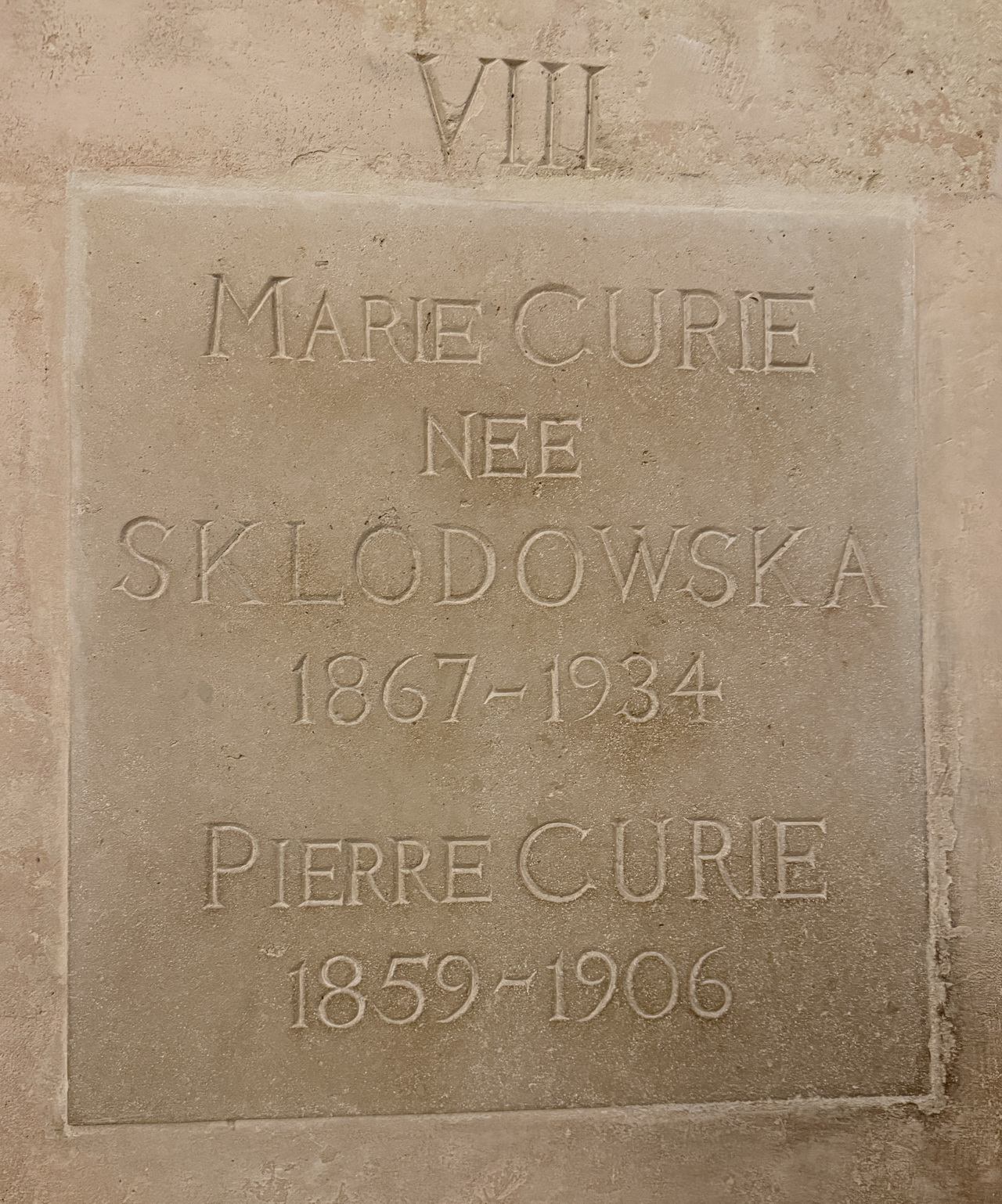 先賢祠,是法國著名文化名人、政治家、將領、畫家、宗教家等的安葬處。建築物的立面是仿羅馬萬神殿而建。正面由科林斯柱組成柱廊,主體呈十字形。內部高83公尺的圓頂,懸吊著一個鐘擺,是證明地球自轉的實驗設施_傅科擺。地下樓層是安葬名人的地方,我們進去向居禮夫人、雨果、伏爾泰等致敬。