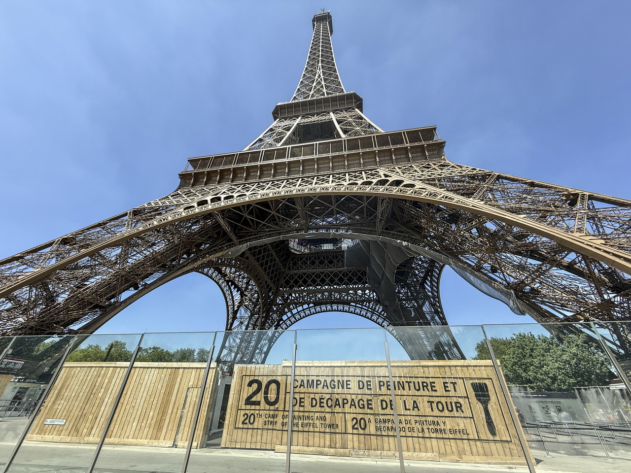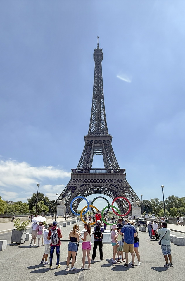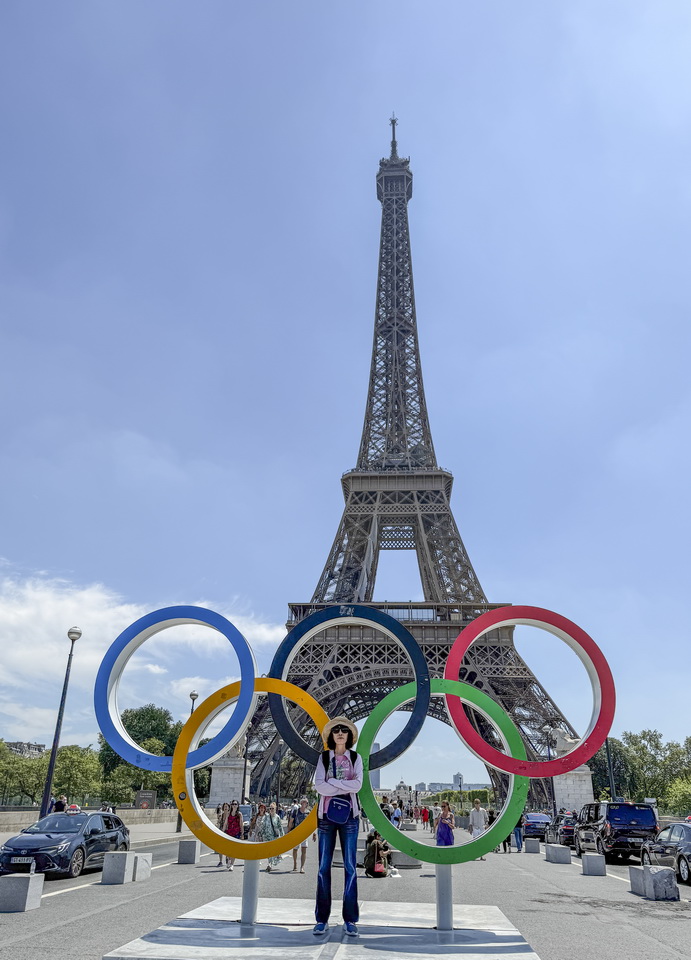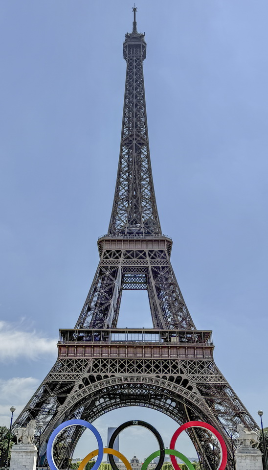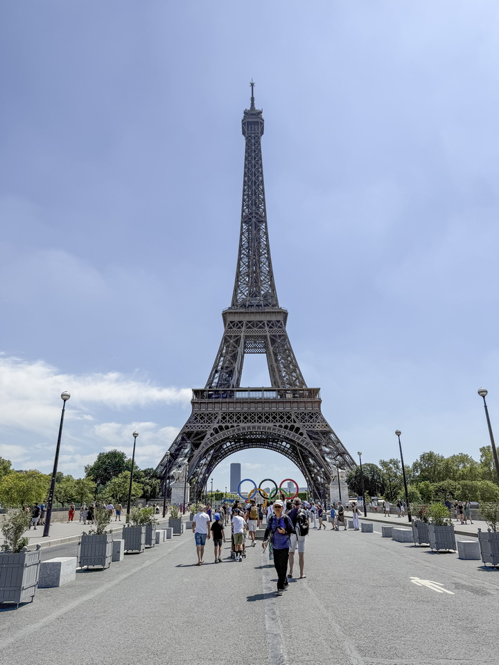 繞過圍籬,來到鐵塔下,鐵塔四周圍得更堅實,還散落著數個巨型木箱,或許又是為國慶而準備的器材。從塞納河的左岸,過橋來到右岸,這個方向留有去年奧運的五環標誌,眾多遊客喜歡和它留下美美的相片,一個接著一個從未間斷。拍艾菲爾鐵塔全景經典畫面,另一地點是夏佑宮,尤其是拍夜景時。