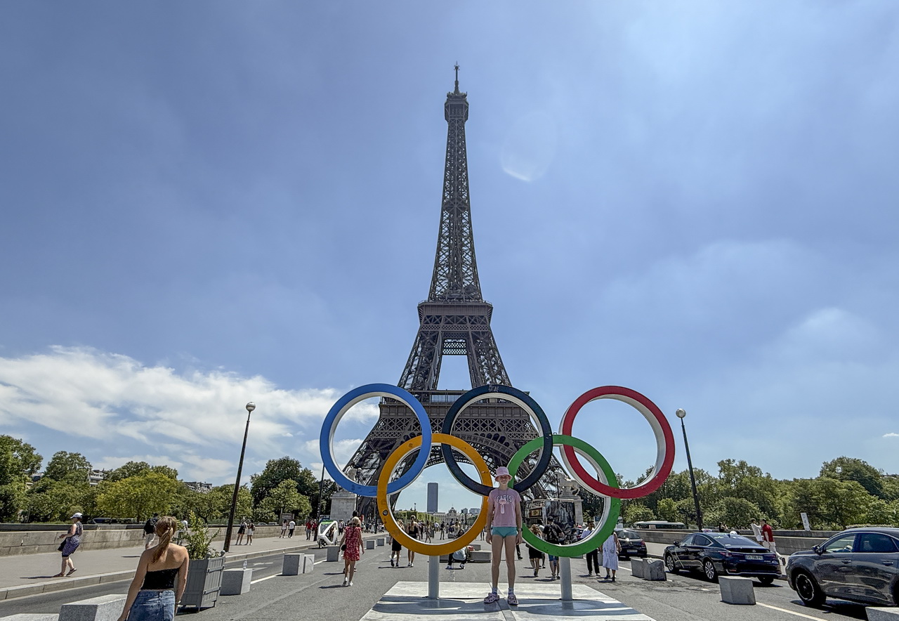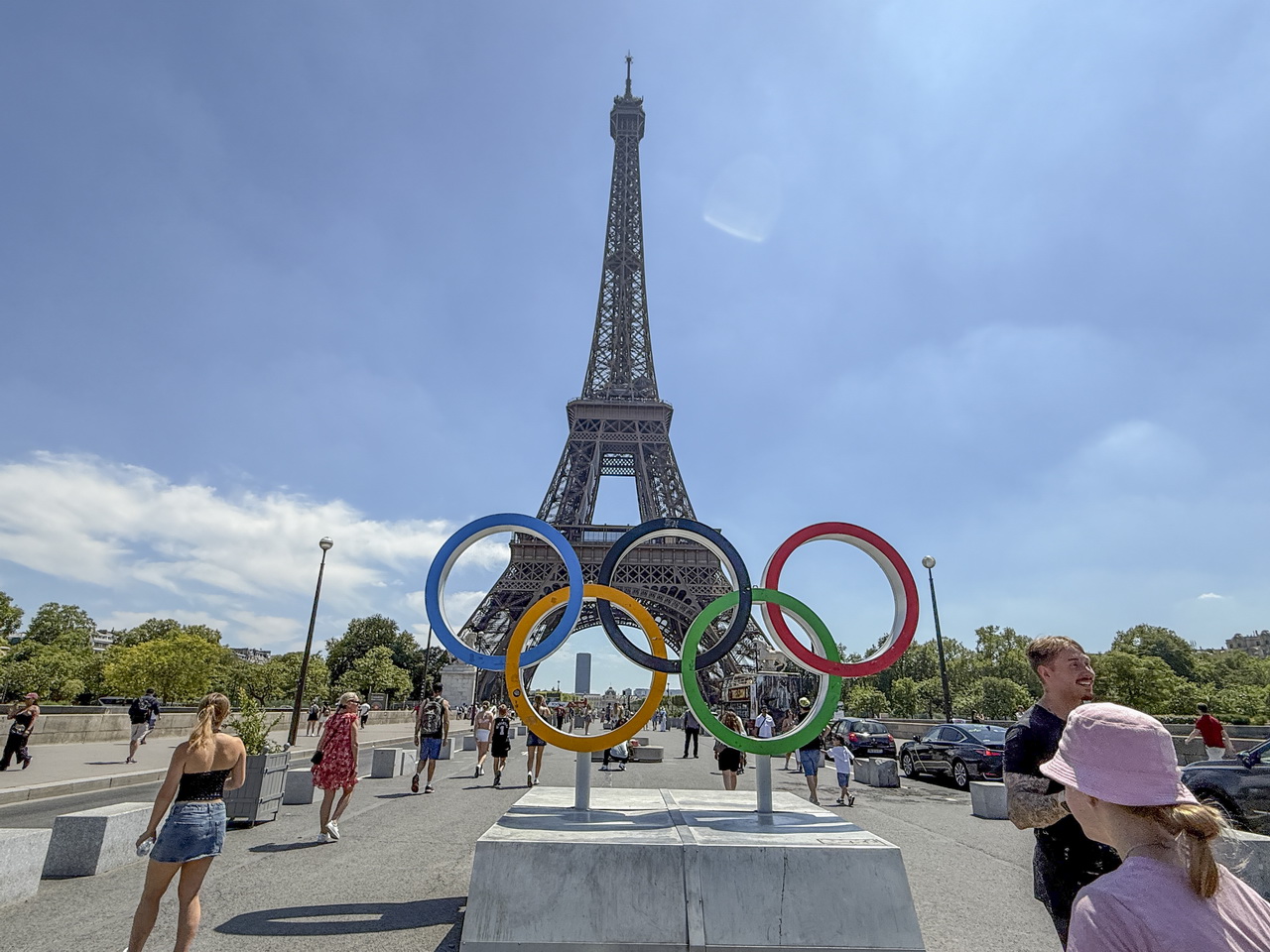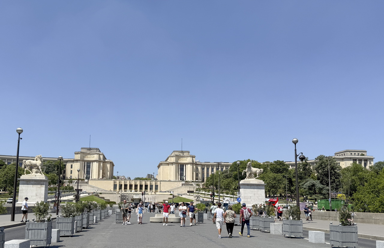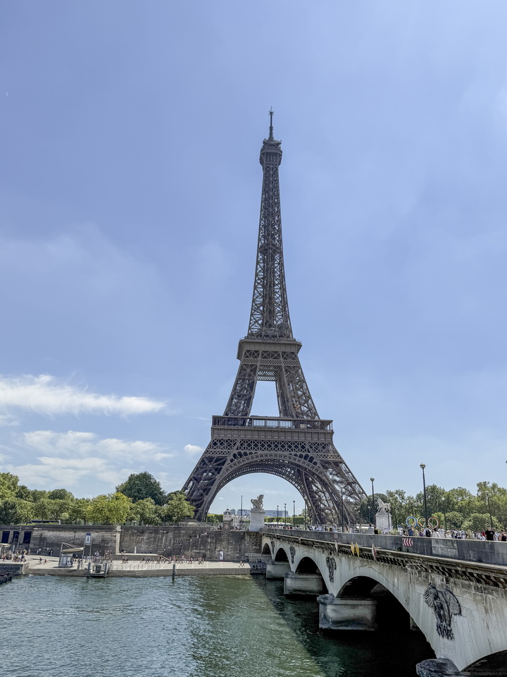 繞過圍籬,來到鐵塔下,鐵塔四周圍得更堅實,還散落著數個巨型木箱,或許又是為國慶而準備的器材。從塞納河的左岸,過橋來到右岸,這個方向留有去年奧運的五環標誌,眾多遊客喜歡和它留下美美的相片,一個接著一個從未間斷。拍艾菲爾鐵塔全景經典畫面,另一地點是夏佑宮,尤其是拍夜景時。