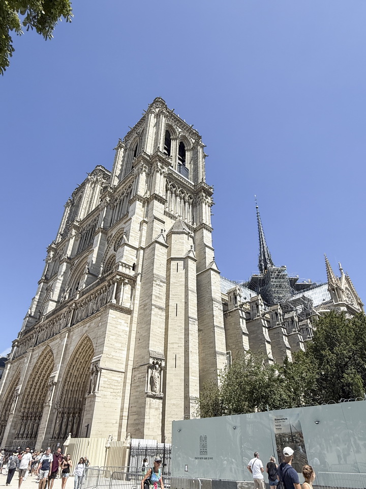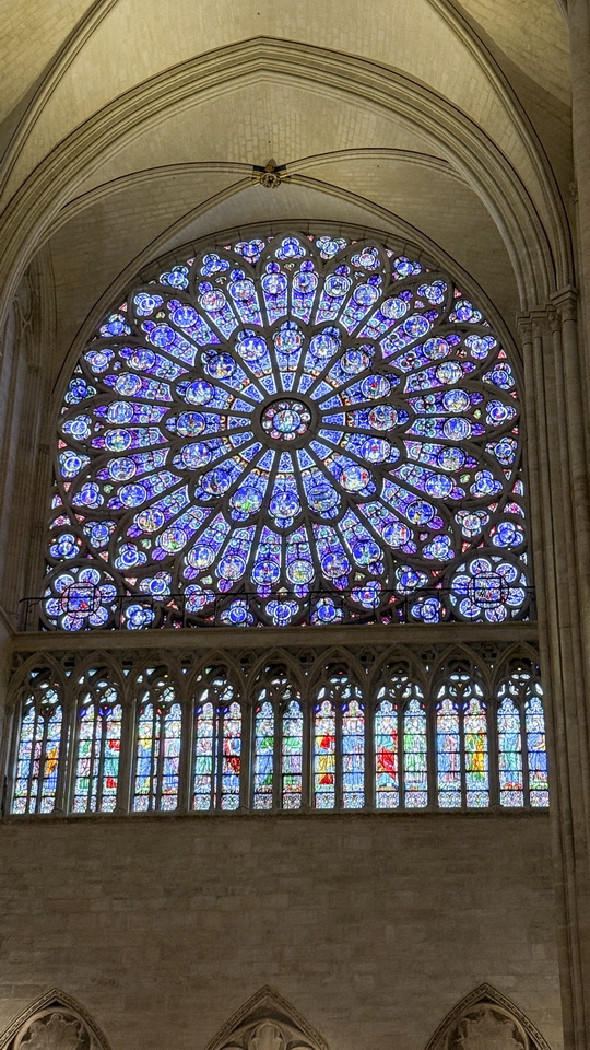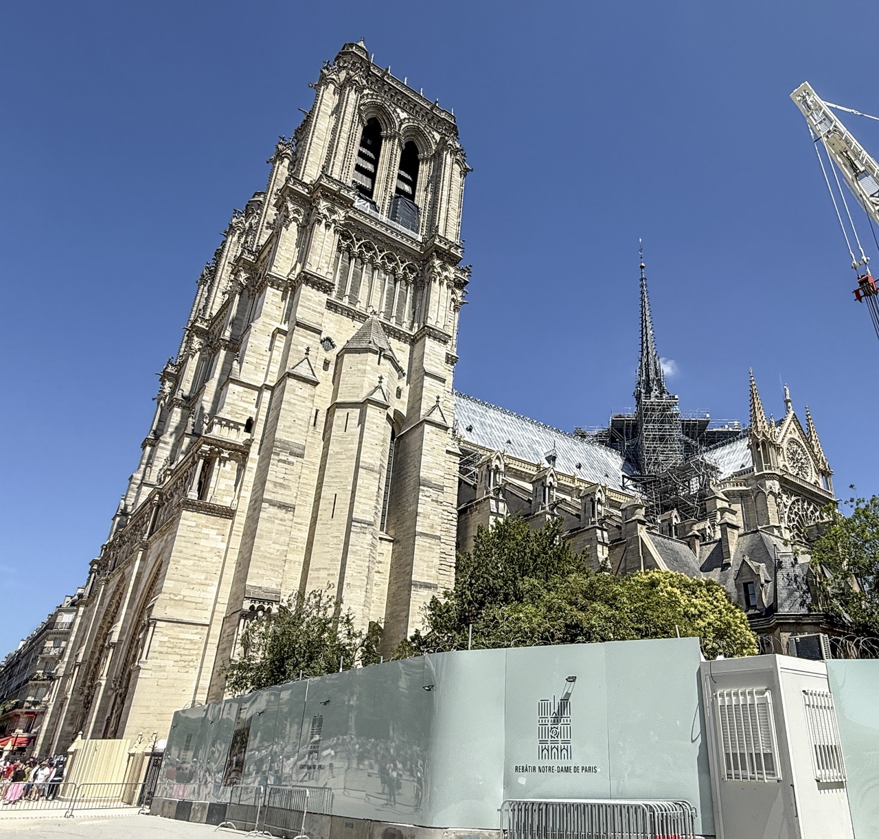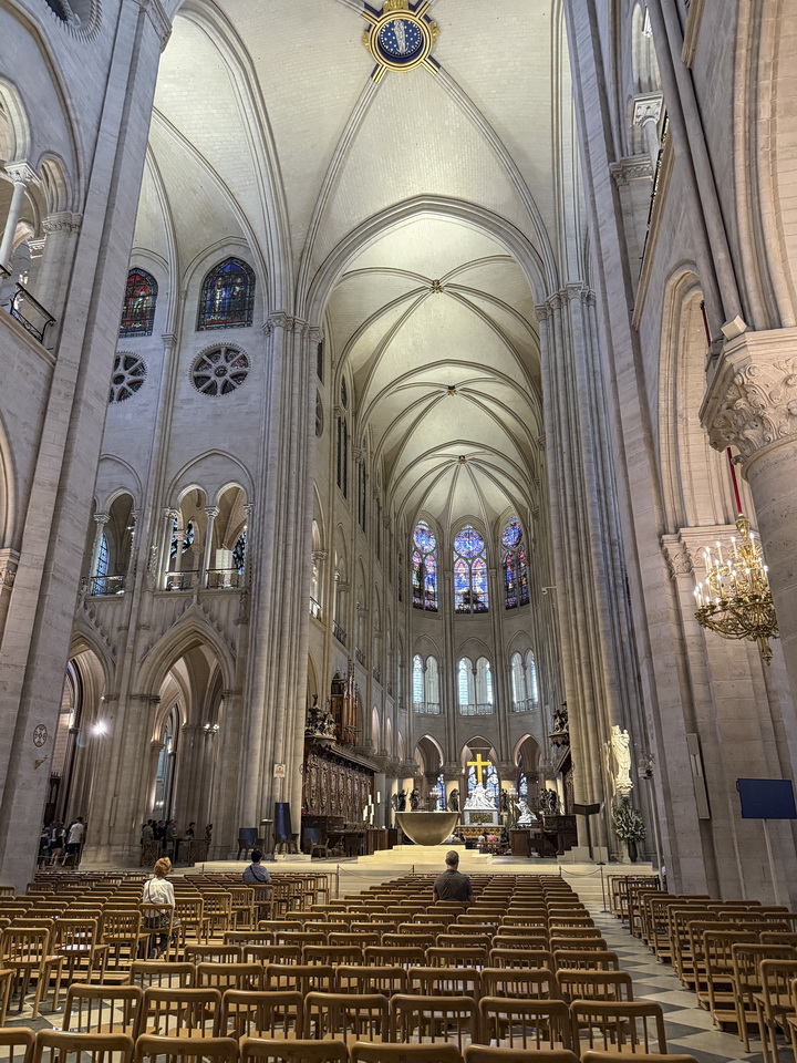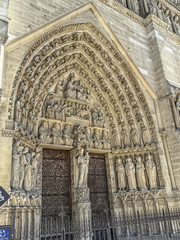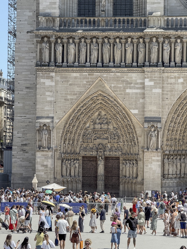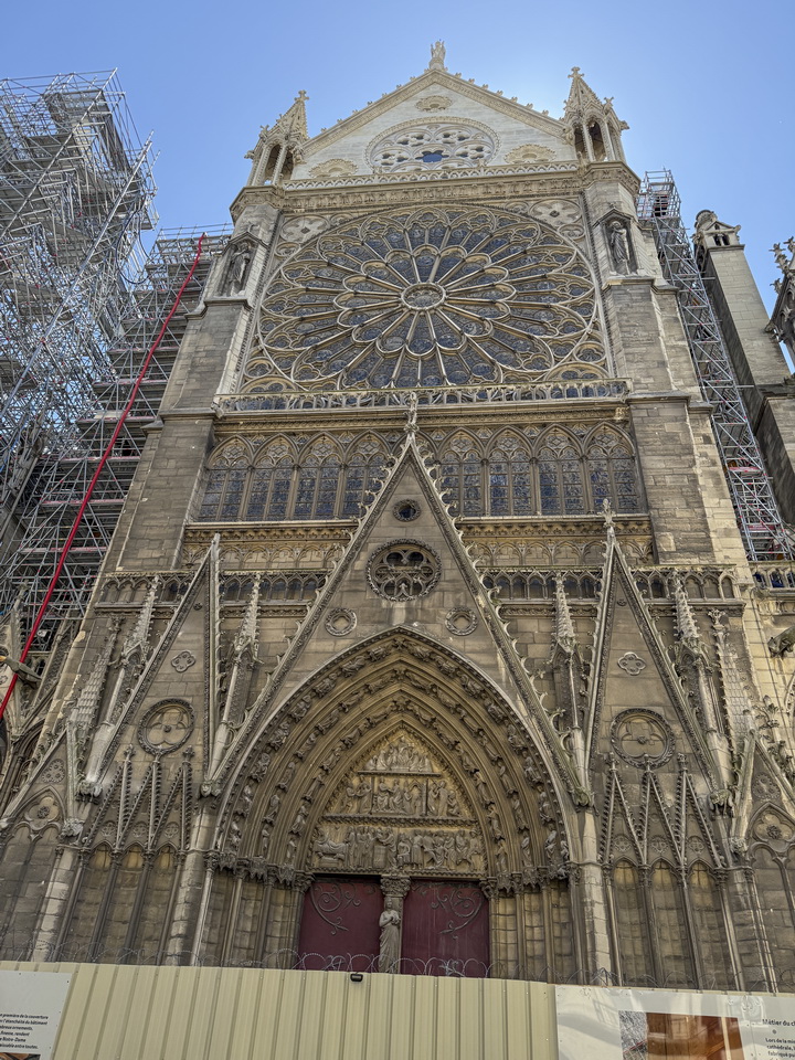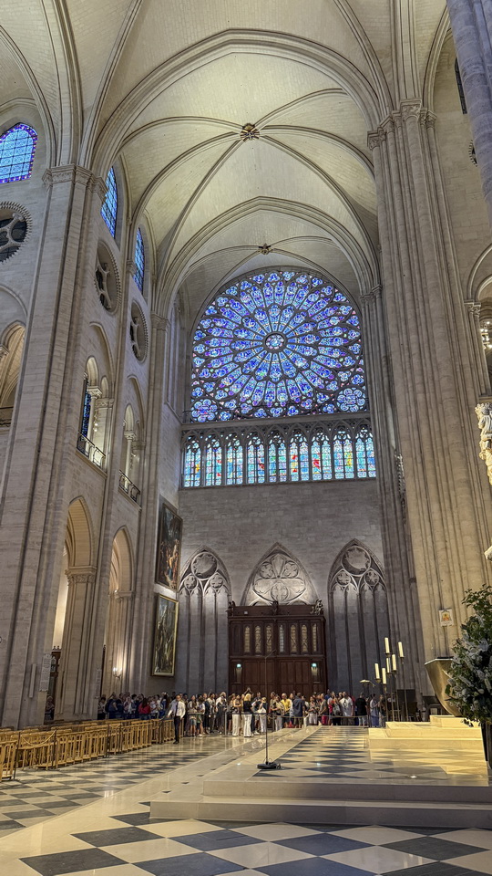 早上第一站就到聖母院,比一般遊客到得早,可以省去排隊進場的時間。2019年的一場大火,中殿的屋頂崩坍,尖塔燒毀。經過15個小時的火災,還好大部分重要文物,都保存下來了。尤其是建築物本體結構也都沒有破壤,去年底終於重新開放,雖然沒有趕上2024年的奧運盛會。昨天來這裡時,我已繞過教堂的北、西、南側。其中南、北側都還在復建中。
