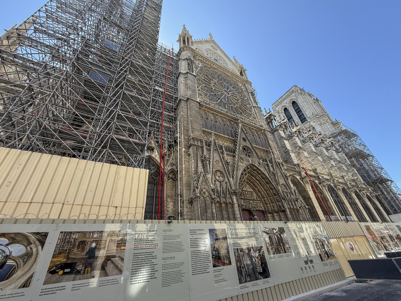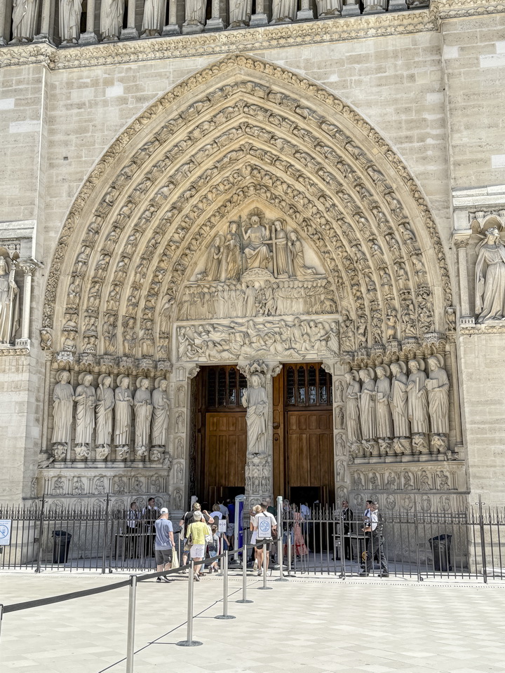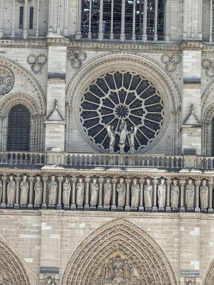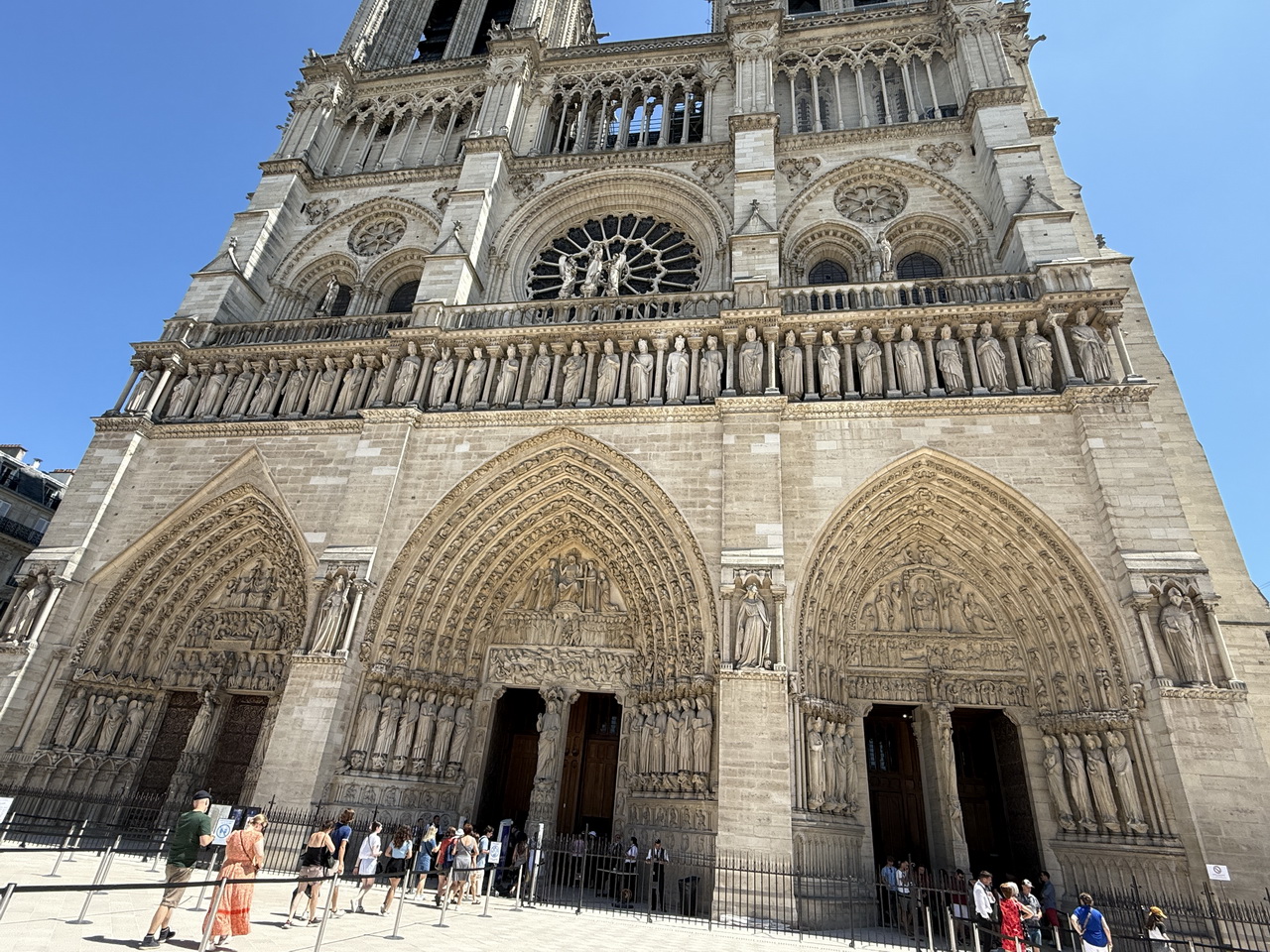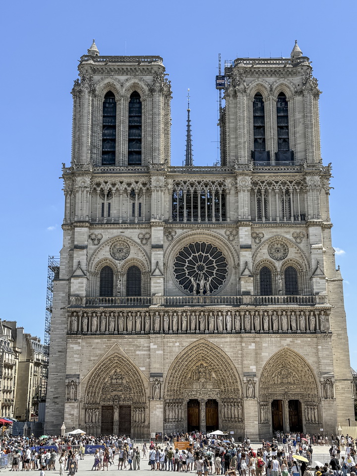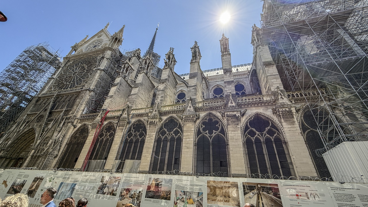 早上第一站就到聖母院,比一般遊客到得早,可以省去排隊進場的時間。2019年的一場大火,中殿的屋頂崩坍,尖塔燒毀。經過15個小時的火災,還好大部分重要文物,都保存下來了。尤其是建築物本體結構也都沒有破壤,去年底終於重新開放,雖然沒有趕上2024年的奧運盛會。昨天來這裡時,我已繞過教堂的北、西、南側。其中南、北側都還在復建中。