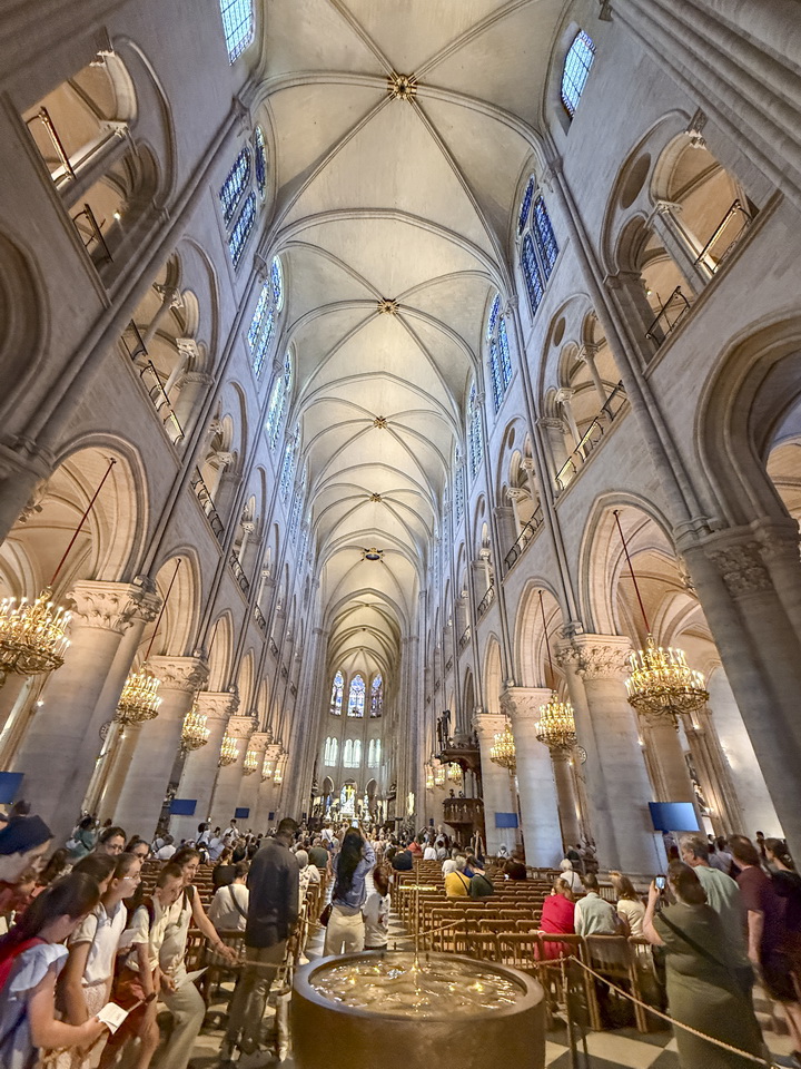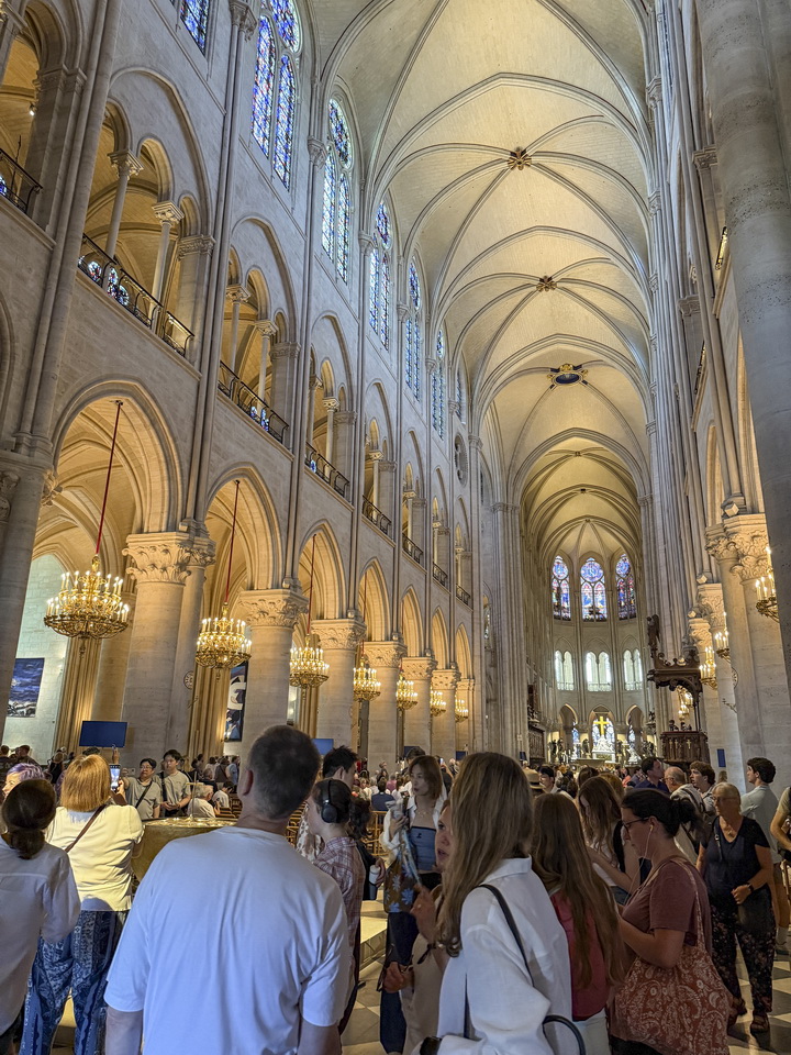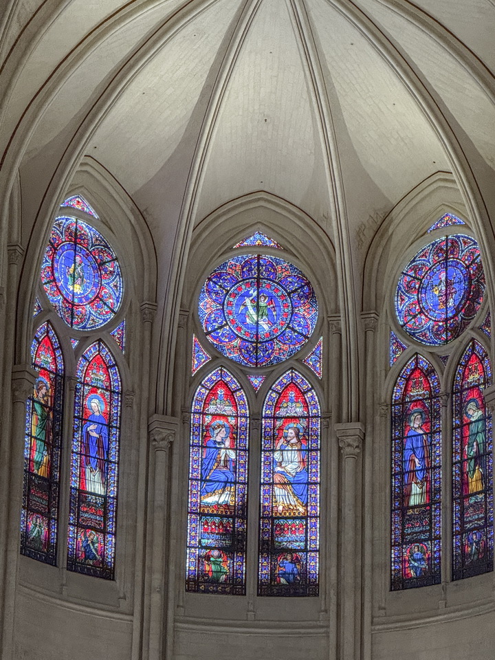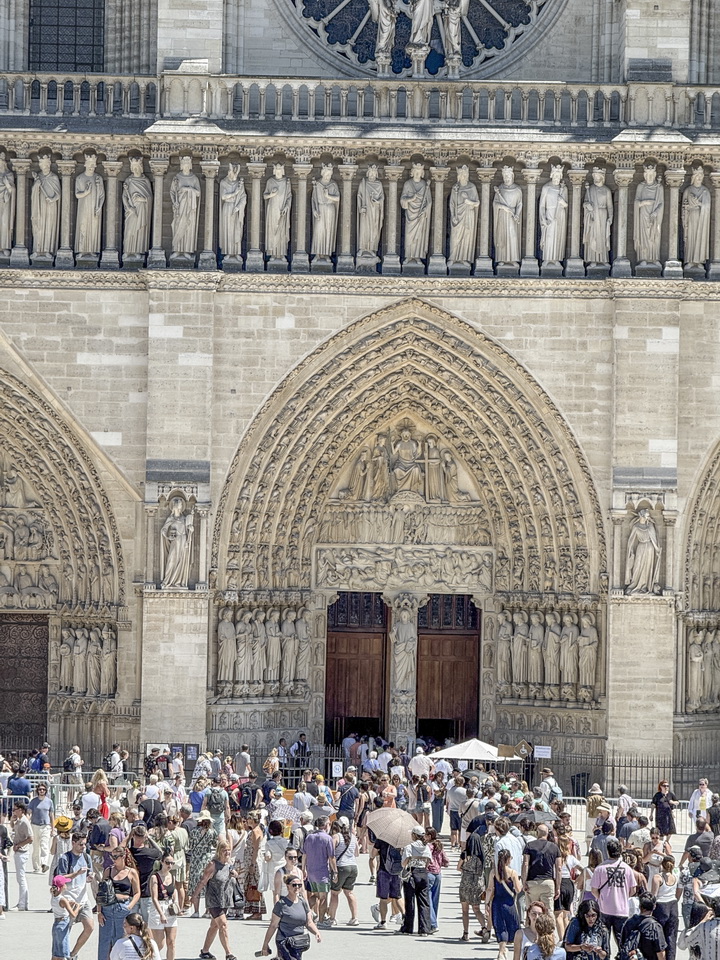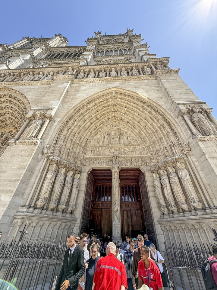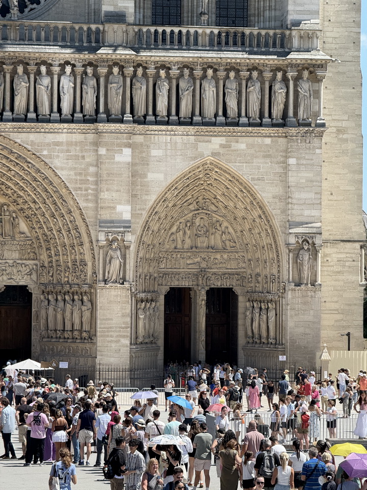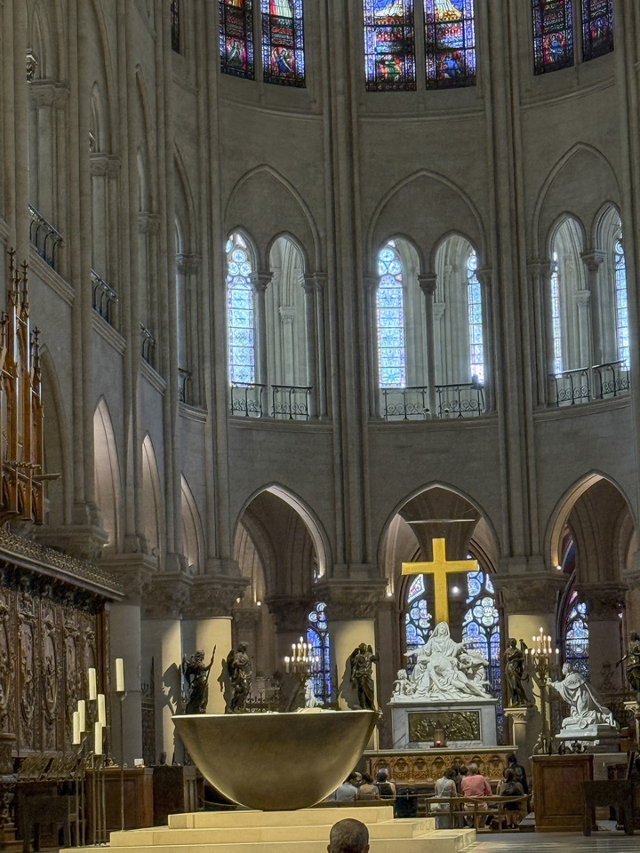 早上第一站就到聖母院,比一般遊客到得早,可以省去排隊進場的時間。2019年的一場大火,中殿的屋頂崩坍,尖塔燒毀。經過15個小時的火災,還好大部分重要文物,都保存下來了。尤其是建築物本體結構也都沒有破壤,去年底終於重新開放,雖然沒有趕上2024年的奧運盛會。昨天來這裡時,我已繞過教堂的北、西、南側。其中南、北側都還在復建中。