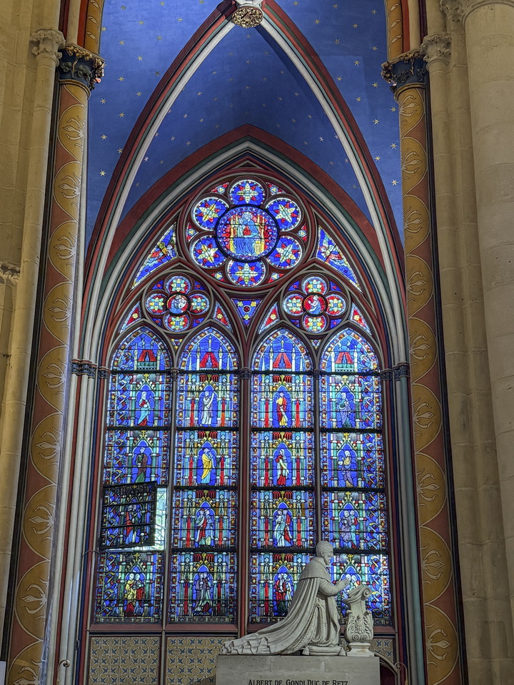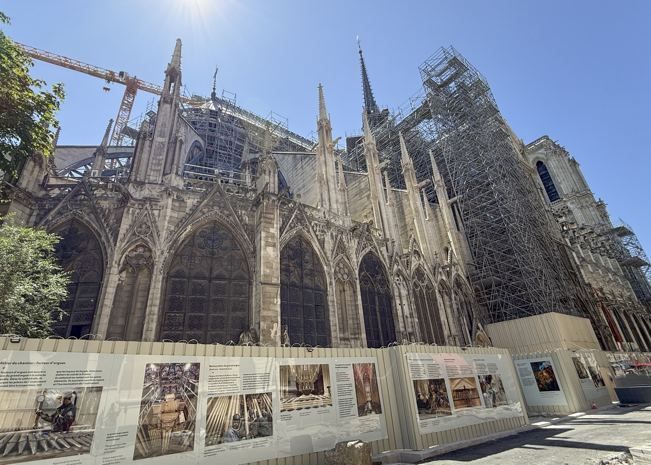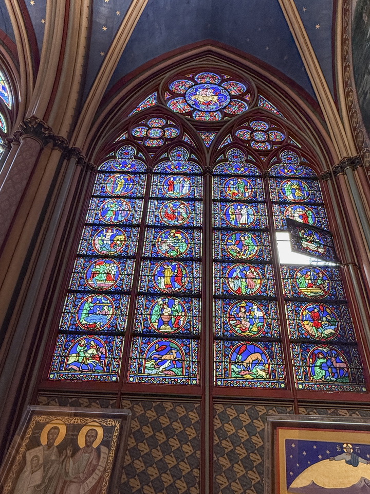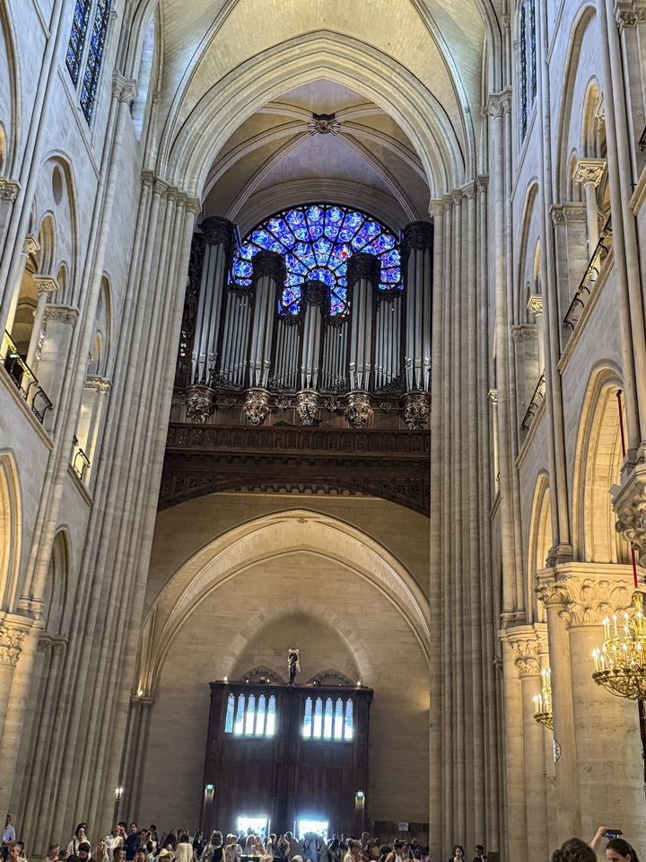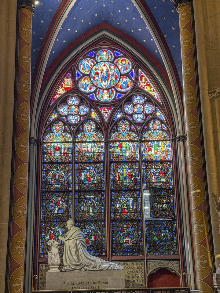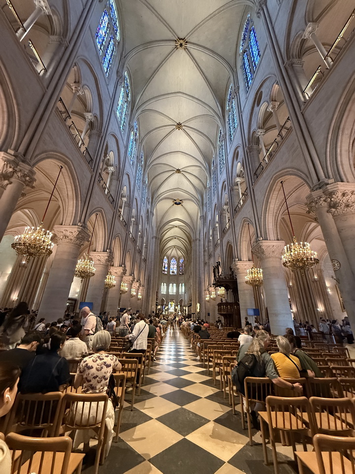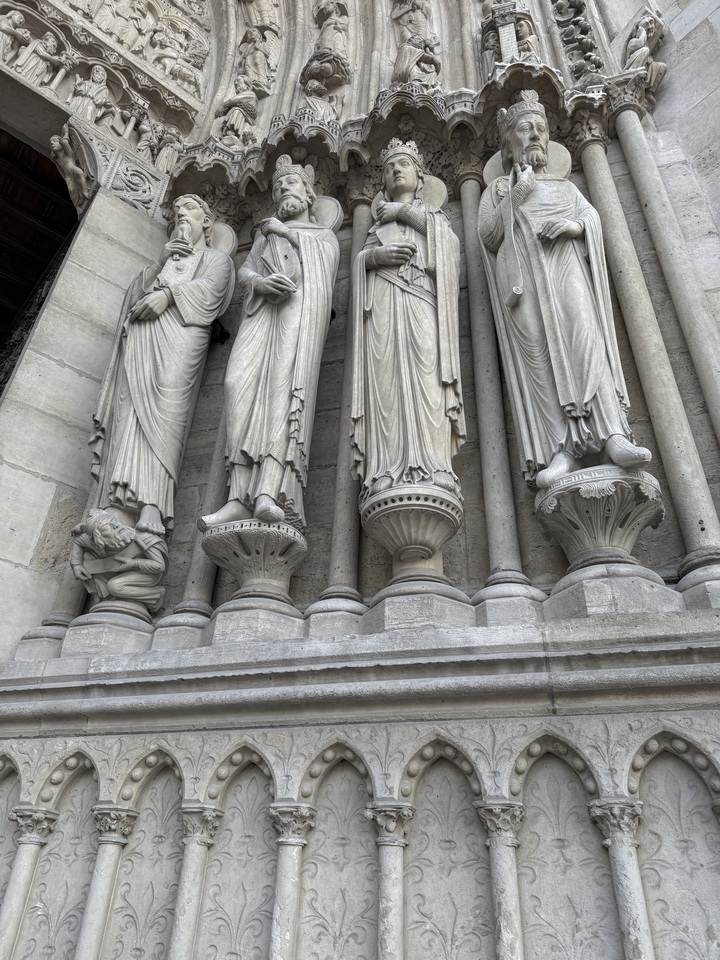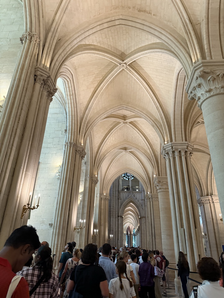 早上第一站就到聖母院,比一般遊客到得早,可以省去排隊進場的時間。2019年的一場大火,中殿的屋頂崩坍,尖塔燒毀。經過15個小時的火災,還好大部分重要文物,都保存下來了。尤其是建築物本體結構也都沒有破壤,去年底終於重新開放,雖然沒有趕上2024年的奧運盛會。昨天來這裡時,我已繞過教堂的北、西、南側。其中南、北側都還在復建中。