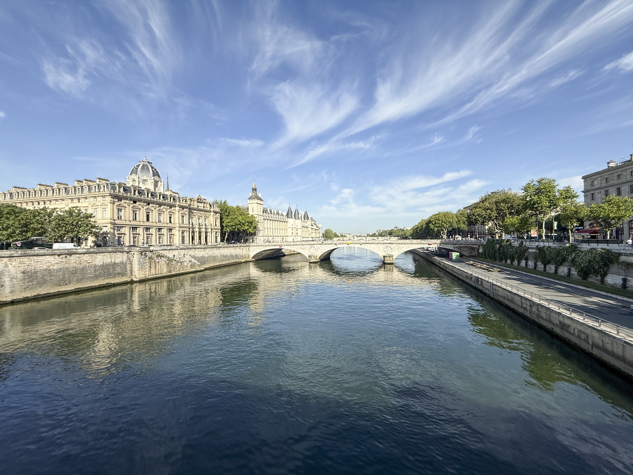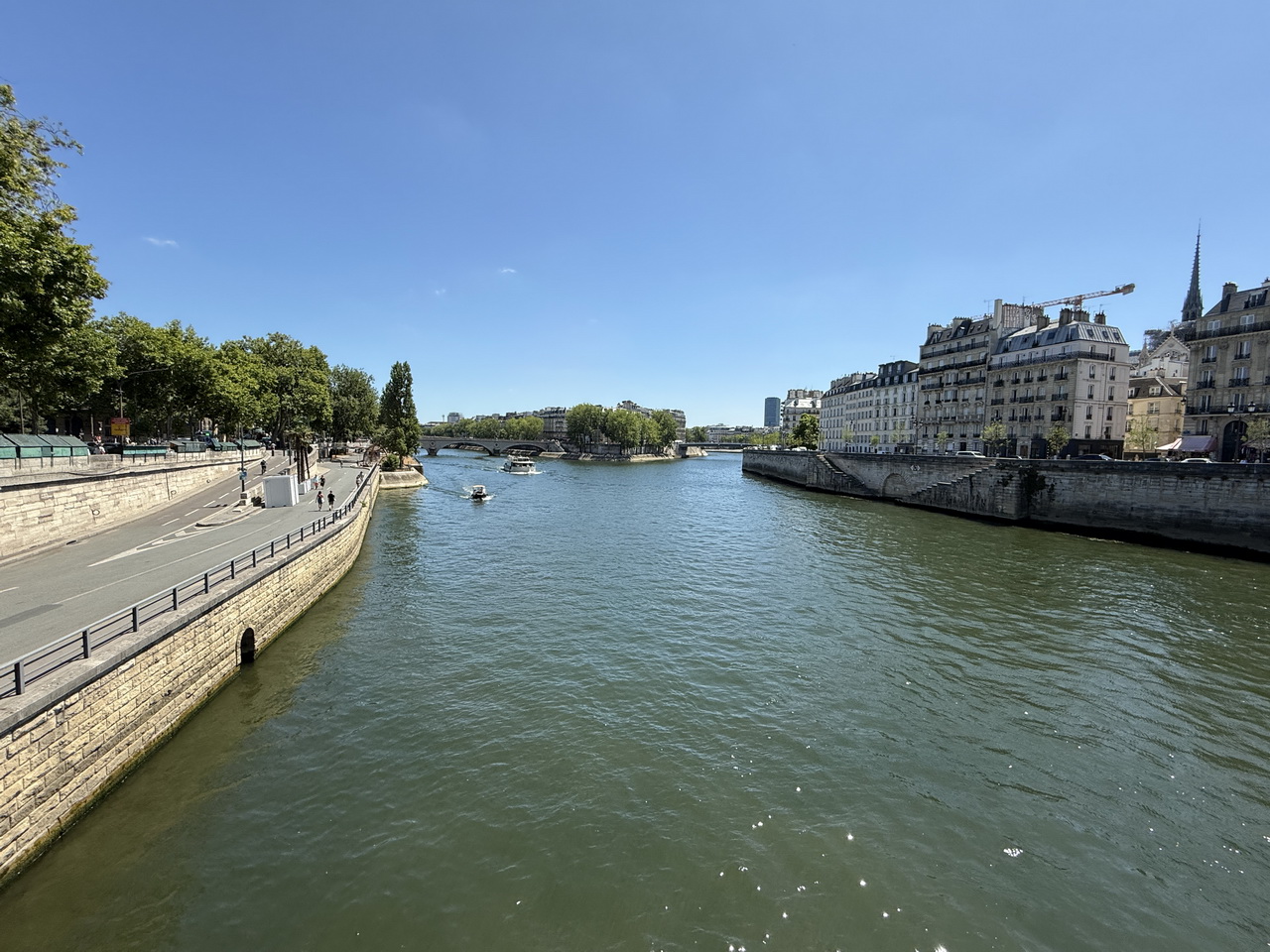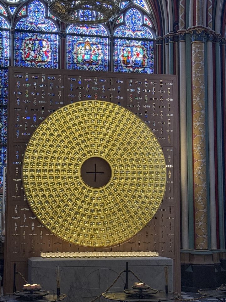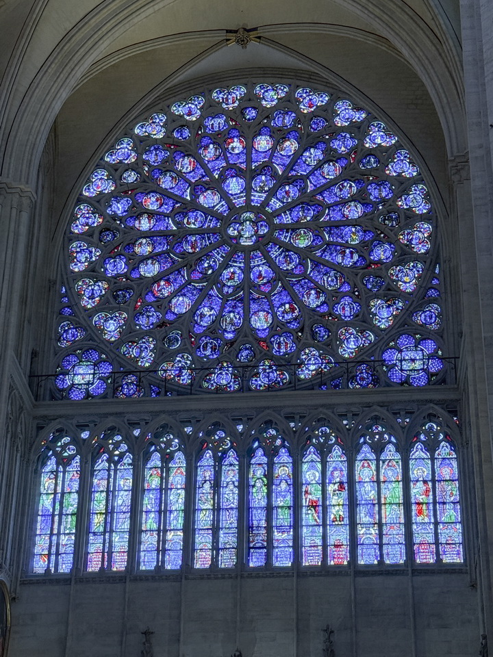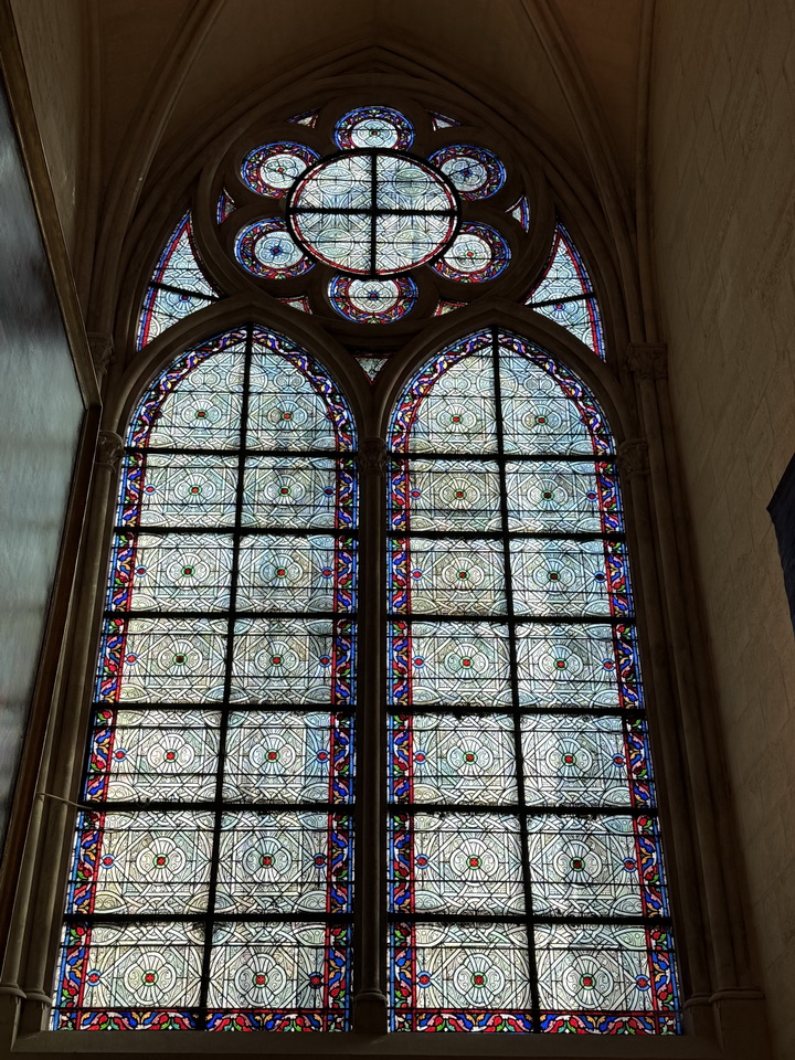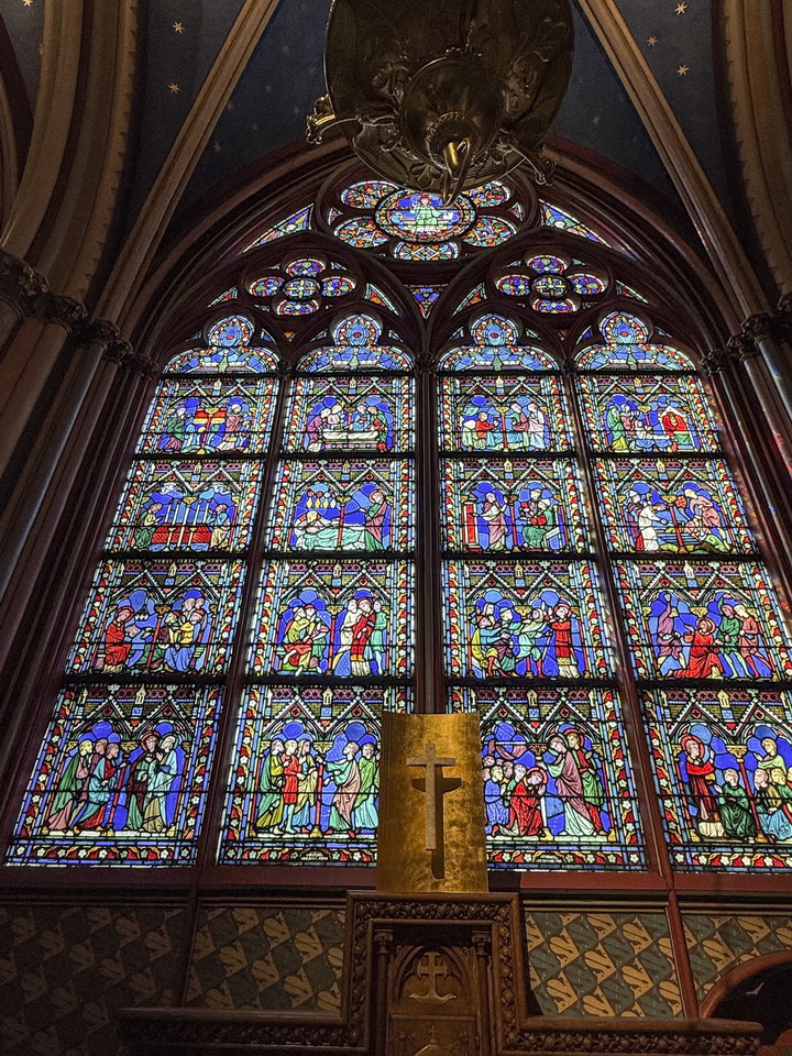 早上第一站就到聖母院,比一般遊客到得早,可以省去排隊進場的時間。2019年的一場大火,中殿的屋頂崩坍,尖塔燒毀。經過15個小時的火災,還好大部分重要文物,都保存下來了。尤其是建築物本體結構也都沒有破壤,去年底終於重新開放,雖然沒有趕上2024年的奧運盛會。昨天來這裡時,我已繞過教堂的北、西、南側。其中南、北側都還在復建中。