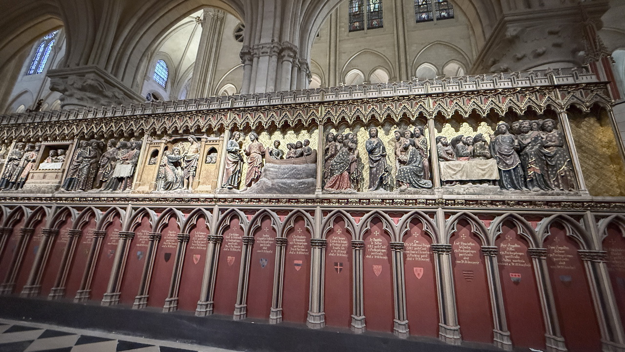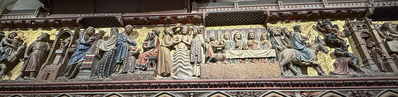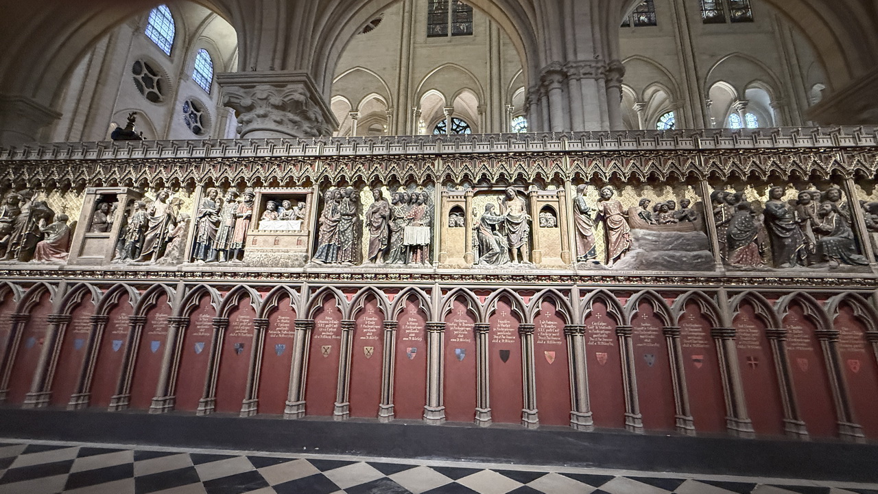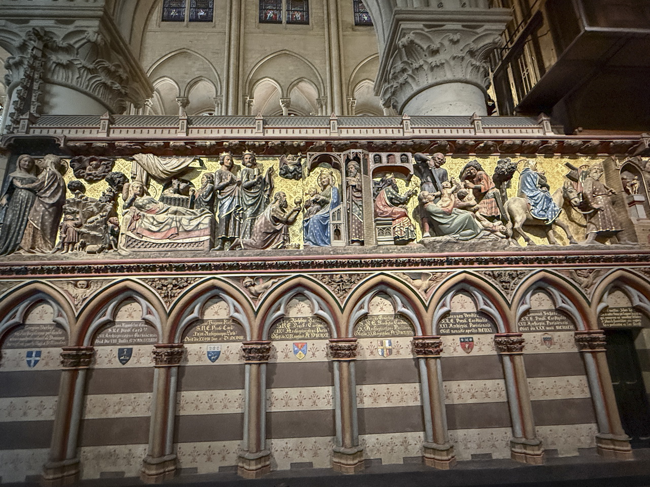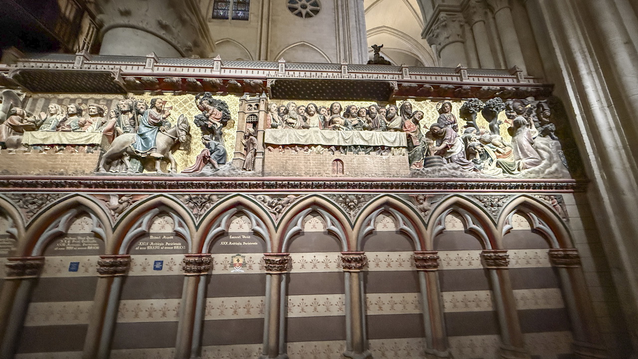 從中間的末日審判門進入教堂,教堂內其實已經來了許多朝聖的遊客。大家都肅穆的,依參觀方向前進。我們對西方宗教只有膚淺的認識,找了幾幅牆壁上的浮雕,使用著Google 翻譯 App 逐一對照著解說文字。整座教堂,寧靜莊嚴,高聳的中殿,各面牆壁上的彩繪玻璃,述說著宗教的故事,是人類文明遺留下來的珍貴藝術品。