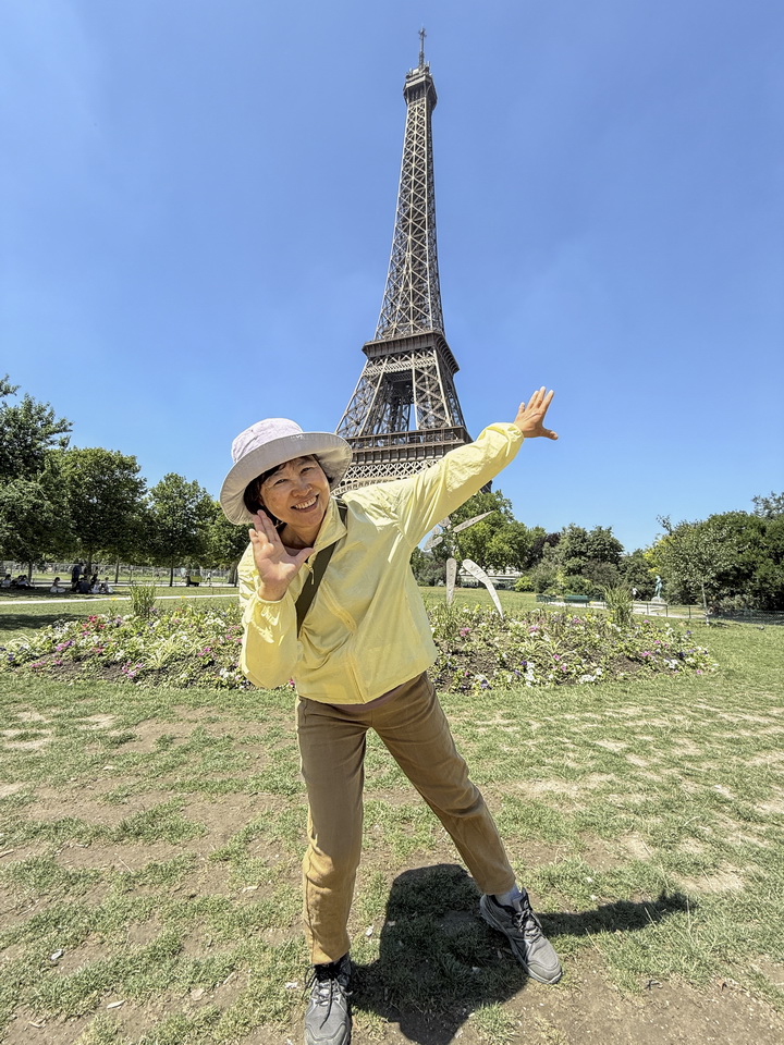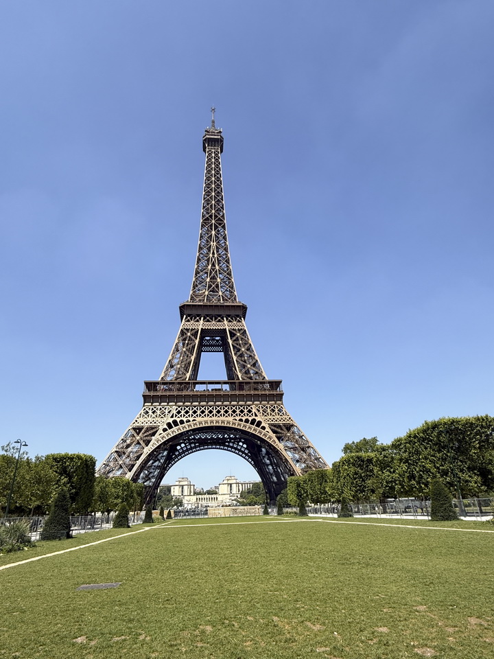 印象中,艾菲爾鐵塔可以從一大片草地的地方遠看。我們看著地圖,搭公車時特地選在草地的附近下車。沒想到,走到草地邊時,大片的草地都被堅固的圍籬圍住了。為了拍一張艾菲爾鐵塔前景有一大片的綠油油草地的相片,還得把手伸進鐵絲網內。