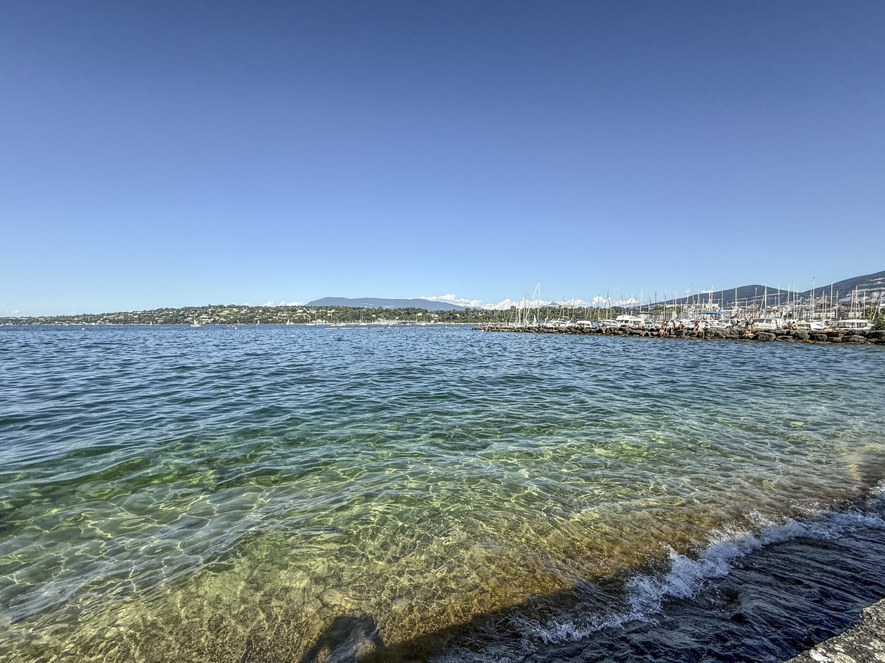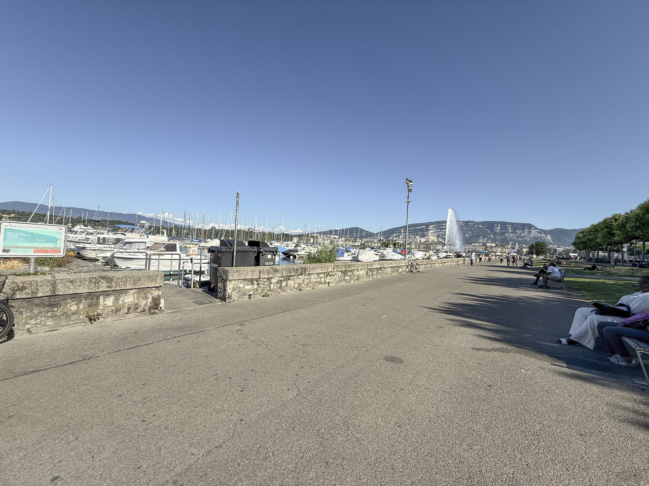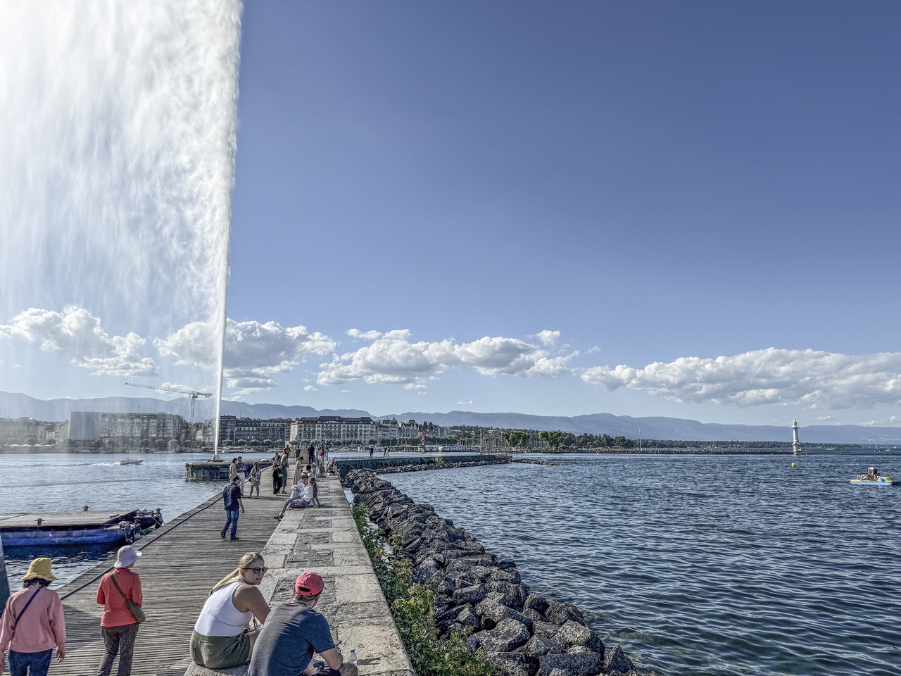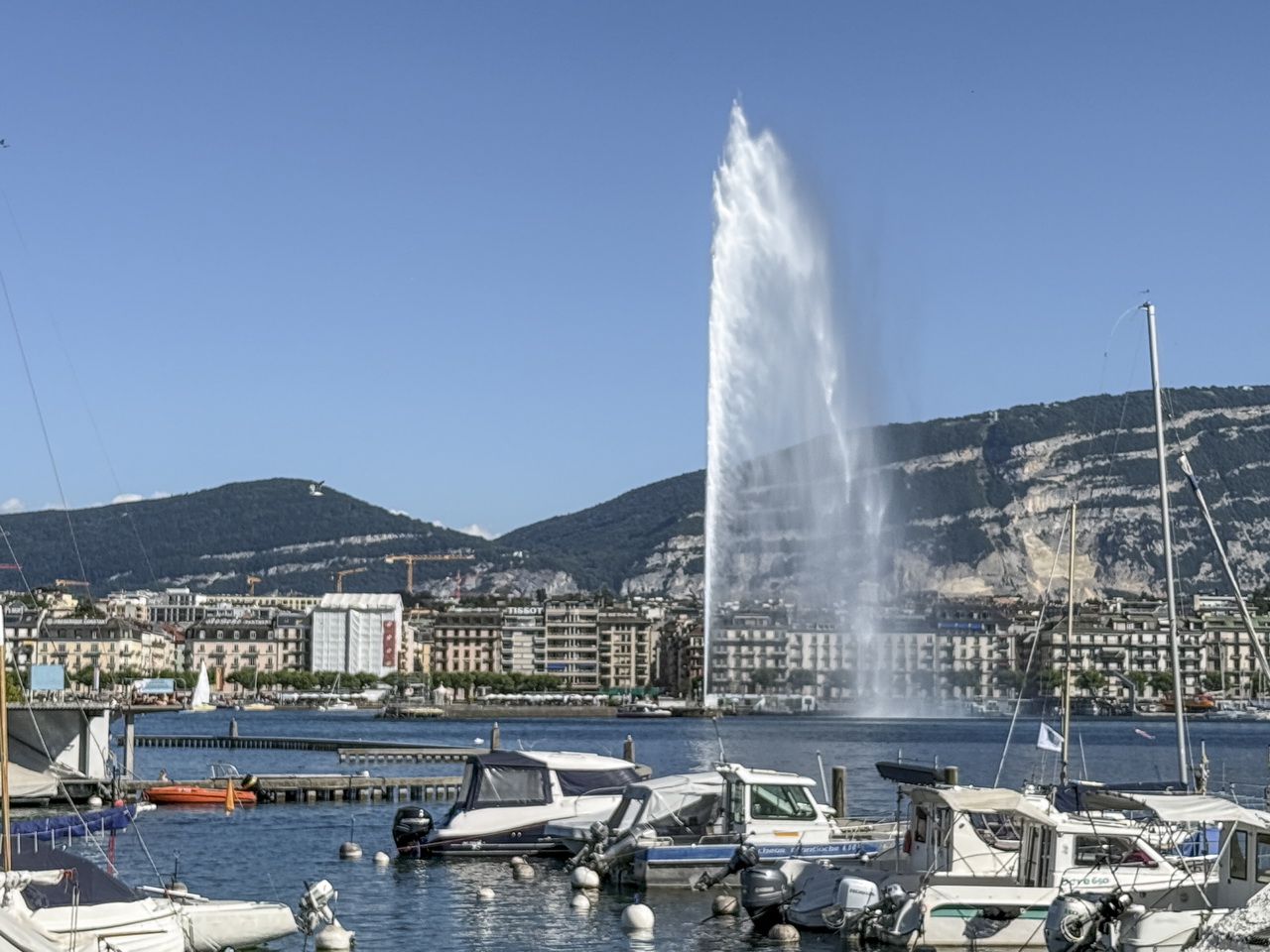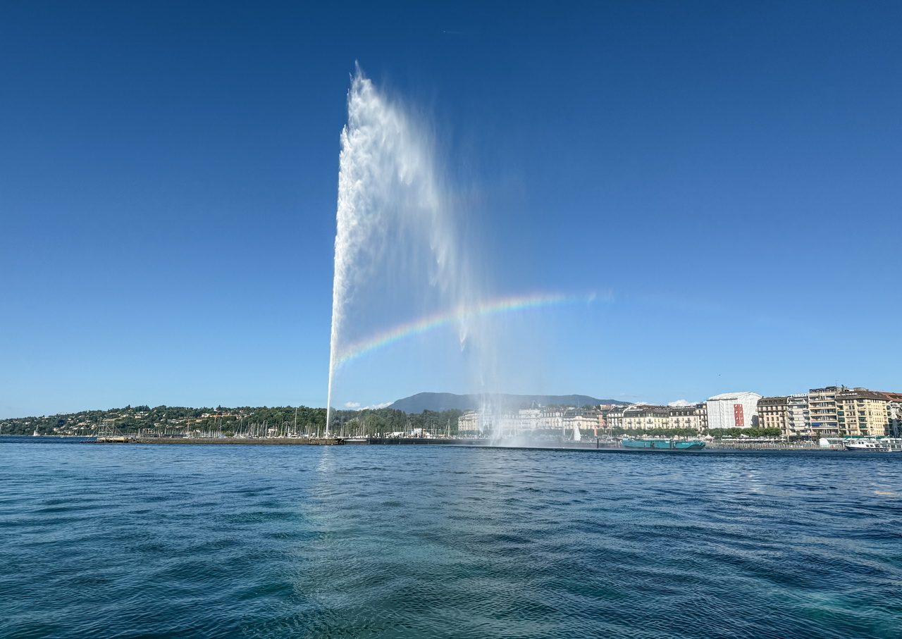 日內瓦以日內瓦湖的湖光山色,和多個國際機構總部所在而聞名。湖水清澈碧藍,面積遼闊,增添了城市的魅力。選擇近火車站及離日內瓦湖不遠的旅館,步行即可抵達。到達日內瓦時已是黃昏時間(以台灣習慣而言),走路到湖邊散步。日內瓦湖是歐洲最大的湖,近舊市區這一端的大噴泉是著名地標,水柱高達140公尺,噴出的水幕還可見彩虹,增添趣味。現在正值夏季,湖邊的告示牌公告,可以在湖邊自由游泳的區域,涼快一夏。