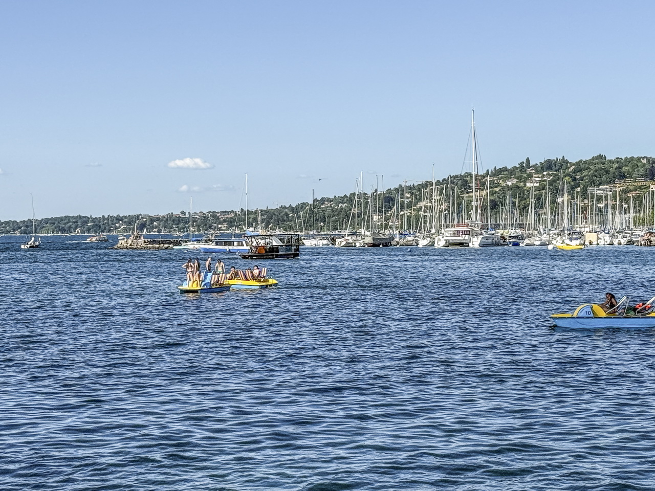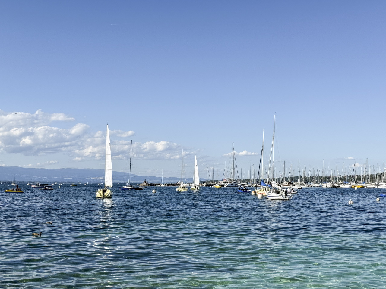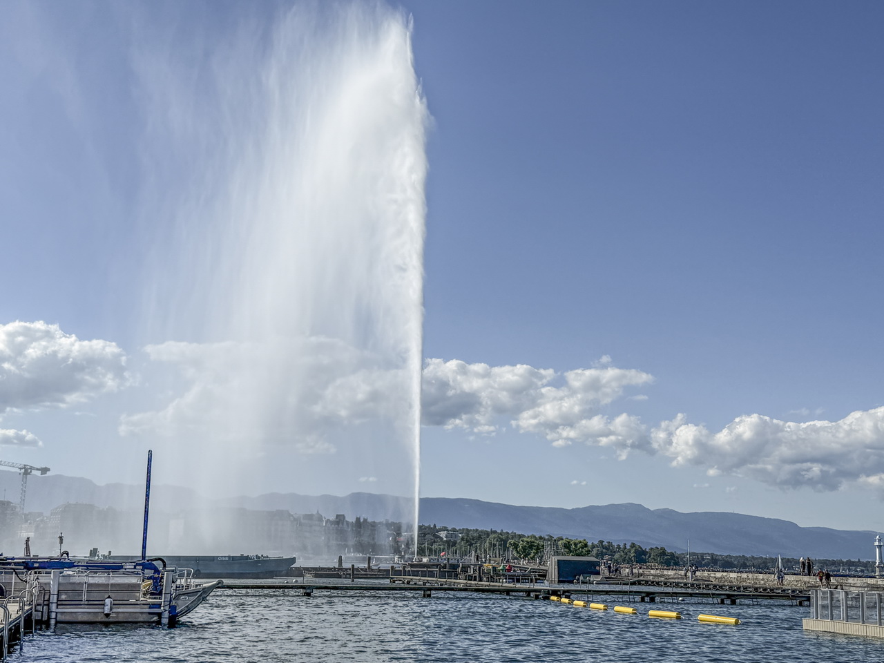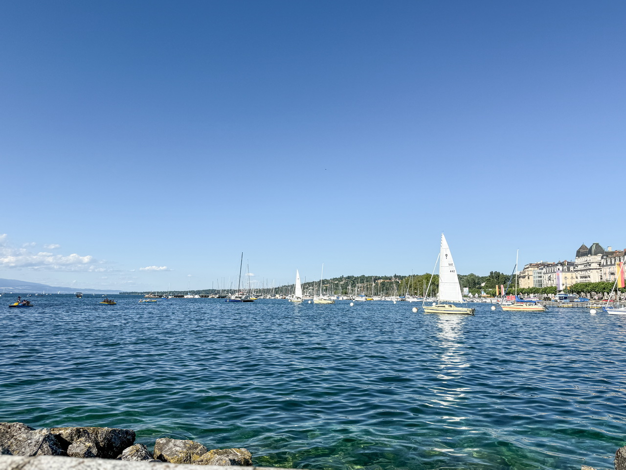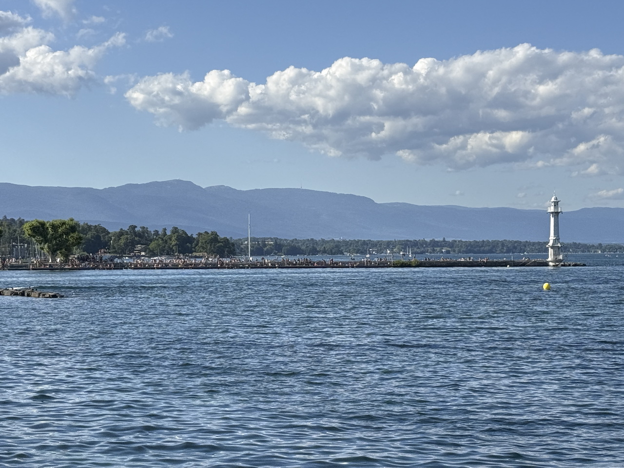 日內瓦以日內瓦湖的湖光山色,和多個國際機構總部所在而聞名。湖水清澈碧藍,面積遼闊,增添了城市的魅力。選擇近火車站及離日內瓦湖不遠的旅館,步行即可抵達。到達日內瓦時已是黃昏時間(以台灣習慣而言),走路到湖邊散步。日內瓦湖是歐洲最大的湖,近舊市區這一端的大噴泉是著名地標,水柱高達140公尺,噴出的水幕還可見彩虹,增添趣味。現在正值夏季,湖邊的告示牌公告,可以在湖邊自由游泳的區域,涼快一夏。