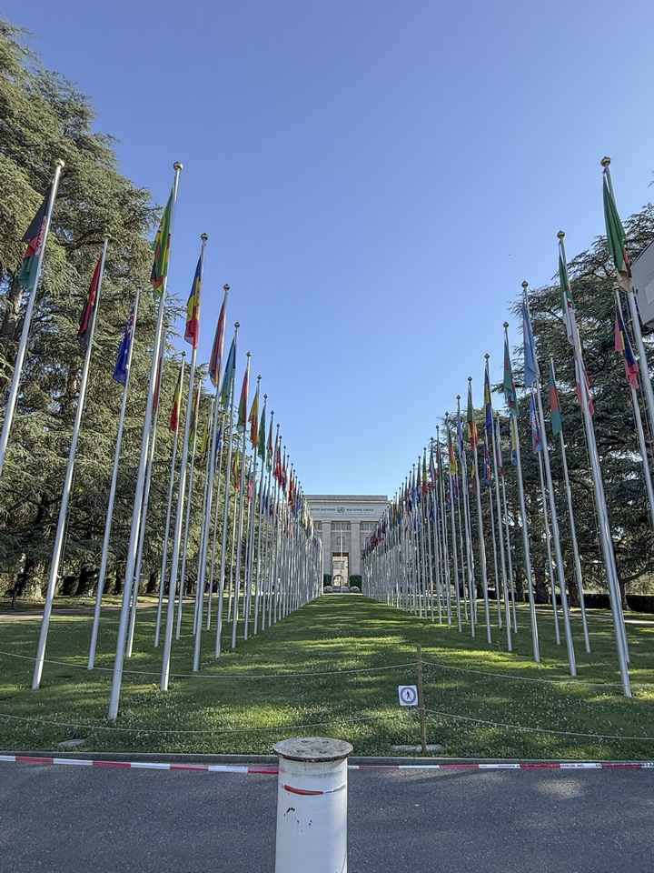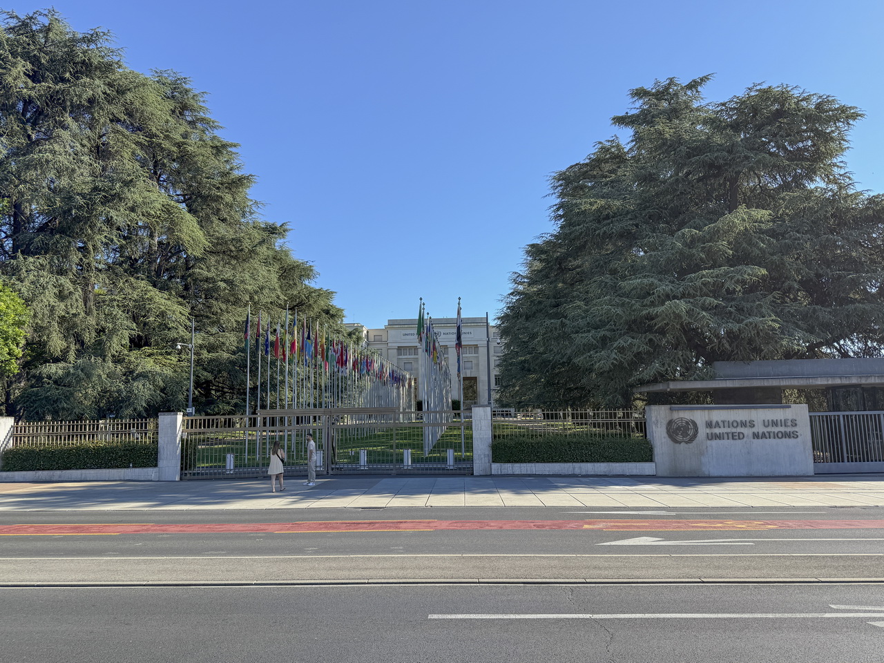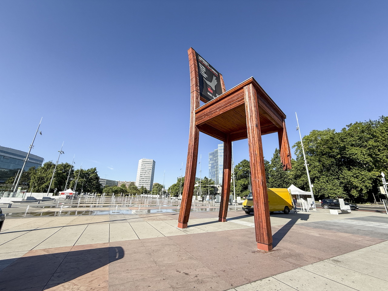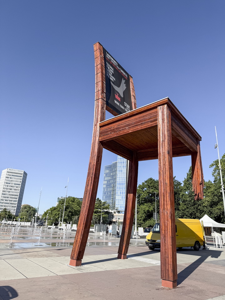 行程安排日內瓦,是為了從這裡搭火車到巴黎。到巴黎的火車班次是下午,早上先到聯合國歐洲總部走走,廣場上有一張三腳椅,提醒世人不要忘記地雷的禍害。總部大門沒有開放,只能從大門門縫拍一張照片,到此一遊,看來這個總部好像不怎麼親民。