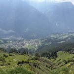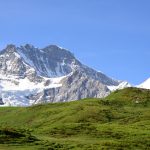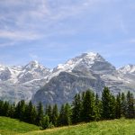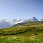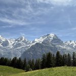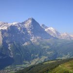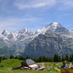 在火車站對面,先搭纜車,到山頂再轉乘火車,很快地就抵達 Murren 。穿過市區找到齒軌纜車站,直達 Allmendhubel 。這裡被稱為鮮花之谷。山上的花並不是人工大面積種植某種草花,它是自然的在山坡草原上,春天到臨時開放的各種草花,點綴在大片草原上。步道發達,健行、越野騎自行車,都是熱門的活動。在具有360度視野的高點,可以眺望艾格峰、僧侶峰、少女峰一列排開。向後轉,沿著纜車線向上延伸,雪朗峰就在那裡。好多美景,都想去走一走,可是得有充裕的時間才能得以實現。