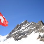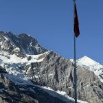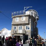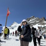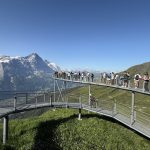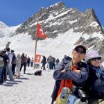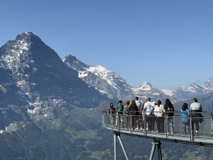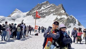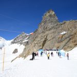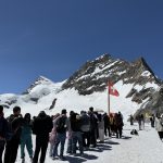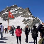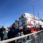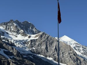 最後一個景點是走出主建築物的戶外,從這裡看到的才是少女峰。此時的賞景廣場上,人山人海,在一支掛有瑞士國旗旗杆前,排了一隊長龍,都是為了要在旗杆下,留下一張一手拉開旗杆下方另一面瑞士國旗的照片。我們不流行這個,找個比較空曠的地方,背景包含了少女峰和瑞士國旗的畫面即可。