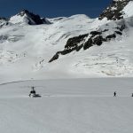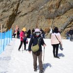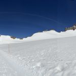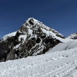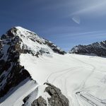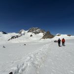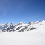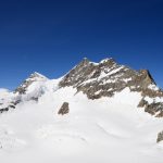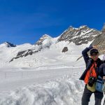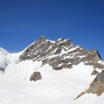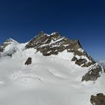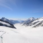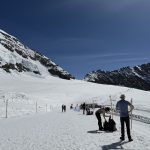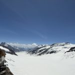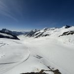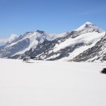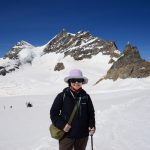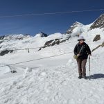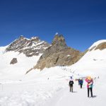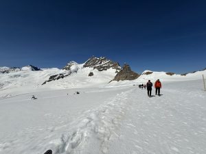 到少女峰車站,依照參觀順序先上觀景台,眺望四周,首先映入眼簾的是阿雷奇冰河。冰河地處很高的山上,還沒有受到土石流的覆蓋,還呈現閃閃發光的白色。搭電梯下樓,通過隧道走到空曠的雪地,雪地步道經雪車整理過,沒有穿冰爪也沒問題。步道前方左側近距離觀賞保護少女的僧侶峰,續往前方可以走到 Monchsioch Hunt 。我們沒有時間走到那裡,走到自己想回頭時就往回走,大家經歷了一次自由自在的雪地步行。