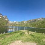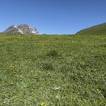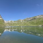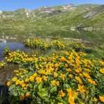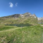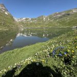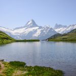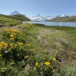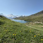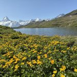 我們的重點是從纜車站走到 Bachalpsee 的健行,步道沿途寬敞,起伏不大,步道旁野花盛開,走來十分輕鬆愉快。這裡的湖有兩個,另一個我不知道名稱是什麼。湖邊的黃色小花開得好燦爛,蹲下來把黃色小花、湖水、山的倒影及遠山拍下來,好美。十一點多了,拿出早上兩位三星主廚準備的午餐,坐在湖邊板凳享用午餐,還有什麼樣的午餐能勝過這一餐。