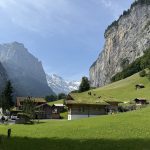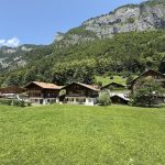 今天先從格林德瓦搭火車,到有瀑布小鎮之稱的 Lauterbrunnen (勞特布魯嫩)。火車剛駛離格林德瓦火車站,沿路的景觀就已讓我們驚嘆不已。畢竟這是旅程進入山區的第一天,看到的一切都是最新鮮、最新奇的。格林德瓦位於艾格峰山腳下,是一座美麗的小鎮。來少女峰山區旅遊的遊客,一般都選擇住宿在這裡或茵特拉肯。火車駛出車站,沿著山坡往上爬,車窗外山坡碧草如茵,其間開著色彩繽紛的小花。典型的小木屋散落在山坡上,錯落有致,和山景構成了一幅美麗的畫面。