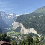 從茵特拉肯開來的火車,只開到小夏戴克,我們要搭這班開回茵特拉肯的車,計劃在Lauterbrunnen 下車。Lauterbrunnen 有瀑布小鎮之稱,據統計72個大大小小瀑布。走出車站,照著導航找據稱很棒的瀑布觀景點,可是沒找著。不找了,直接走到離市區最近的地標瀑布 Staubbachfall ,和近處另一瀑布 。今天的Staubbachfal瀑布的水並不是非常大,氣勢略顯不足,顯得十分嬌柔。步行走完全程山谷步道,是我的理想目標,但是大家腳程有差異,這一段走了一公里多,夠了。往回走回火車站,轉往 Murren 。
