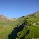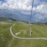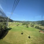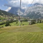 下山如果搭纜車回到格林德瓦,是非常快速的。為了體驗一下經過山間小鎮的風光,採租用山景滑板車下山。這是一種滑板車,把手具有前後輪的刹車系統,不用腳踩,只順著山坡自然的坡度向下滑,就可以抵達格林德瓦市區的 First 纜車站。山路雖然可以通行汽車,卻也不是很寬,有汽車來時得停下來讓汽車先行。另外一個重點是,經過陡坡時速度是很快的,如果刹車不當,又或是過於恐懼的人,是有可能摔車的。所以,這並不是絕對安全的器材。