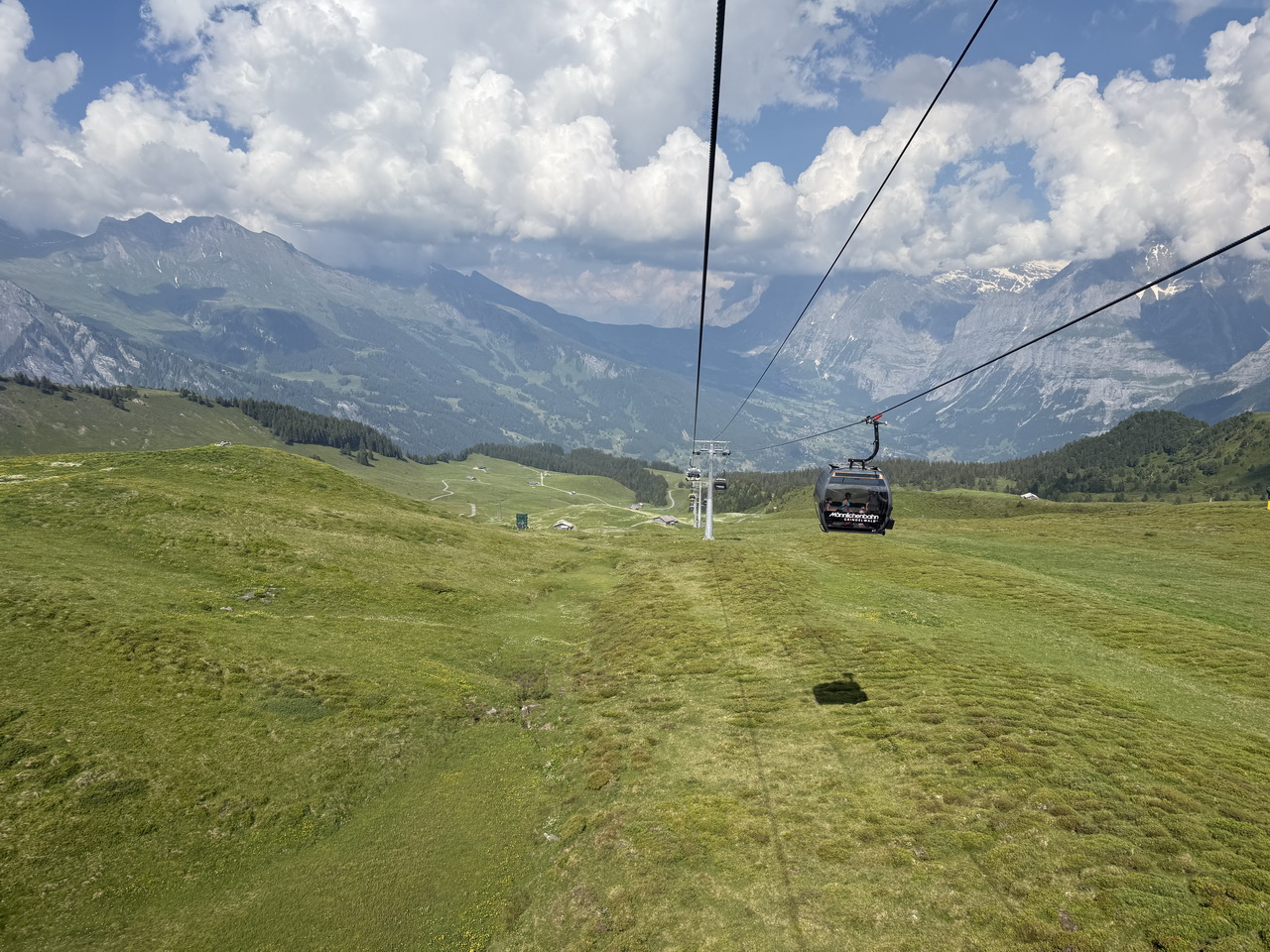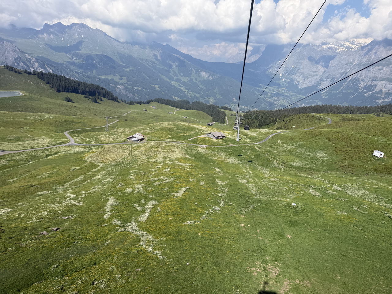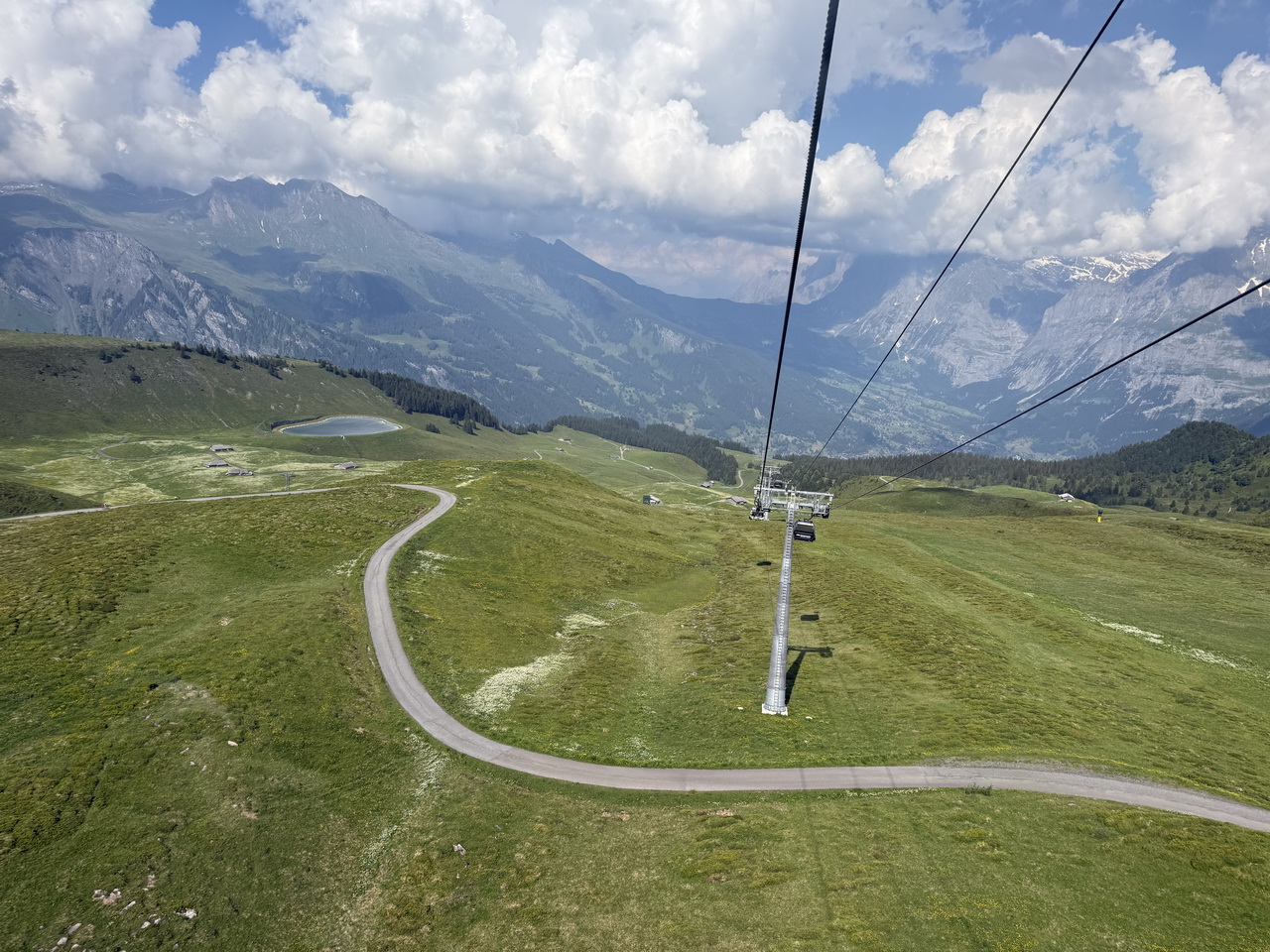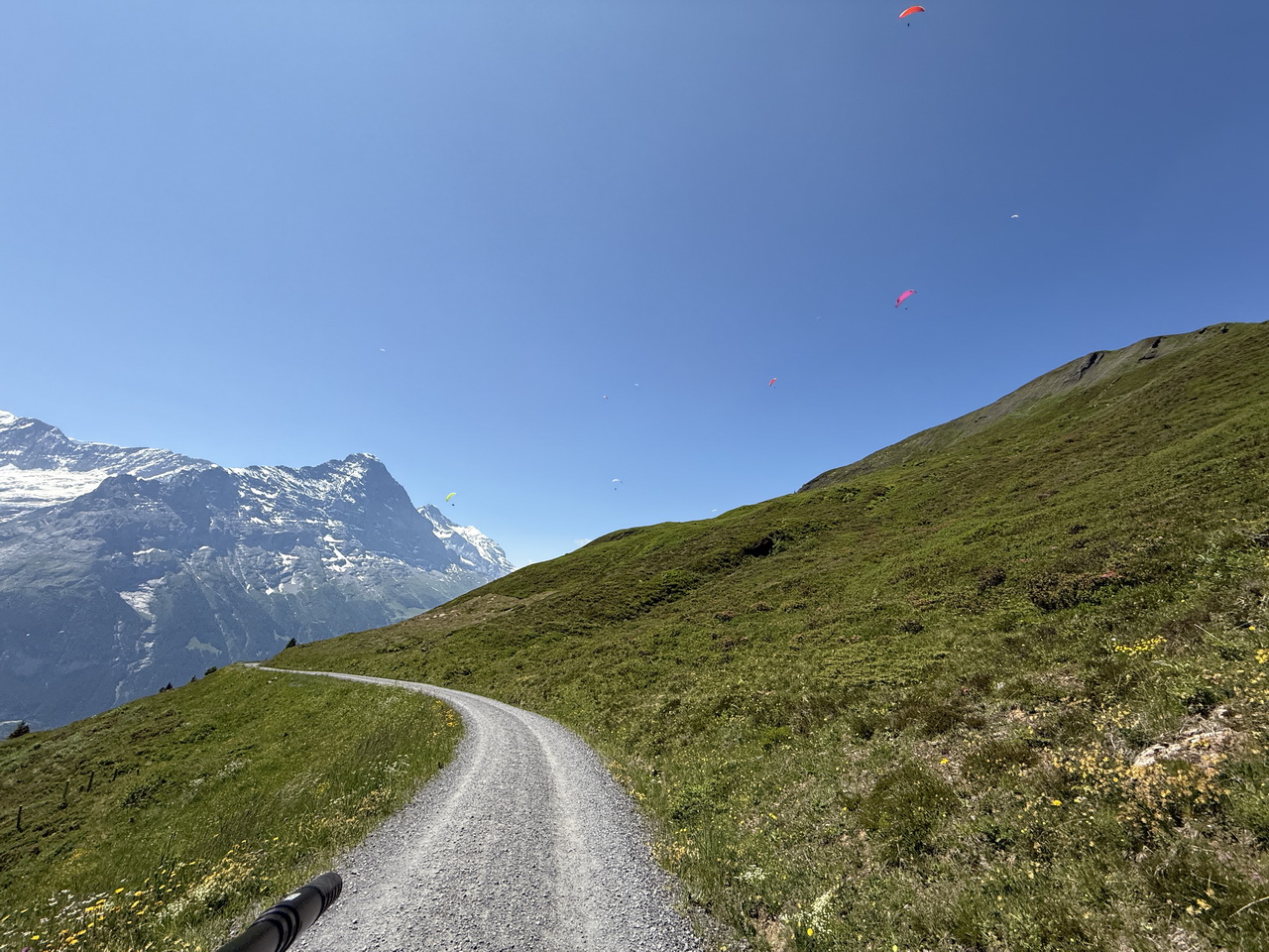 下山如果搭纜車回到格林德瓦,是非常快速的。為了體驗一下經過山間小鎮的風光,採租用山景滑板車下山。這是一種滑板車,把手具有前後輪的刹車系統,不用腳踩,只順著山坡自然的坡度向下滑,就可以抵達格林德瓦市區的 First 纜車站。山路雖然可以通行汽車,卻也不是很寬,有汽車來時得停下來讓汽車先行。另外一個重點是,經過陡坡時速度是很快的,如果刹車不當,又或是過於恐懼的人,是有可能摔車的。所以,這並不是絕對安全的器材。