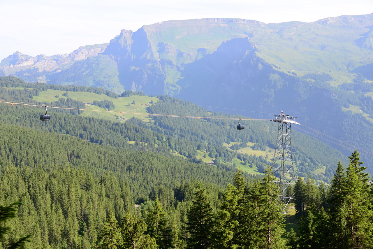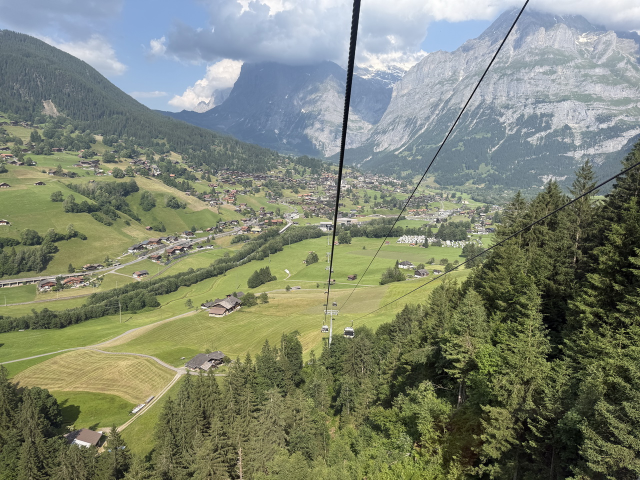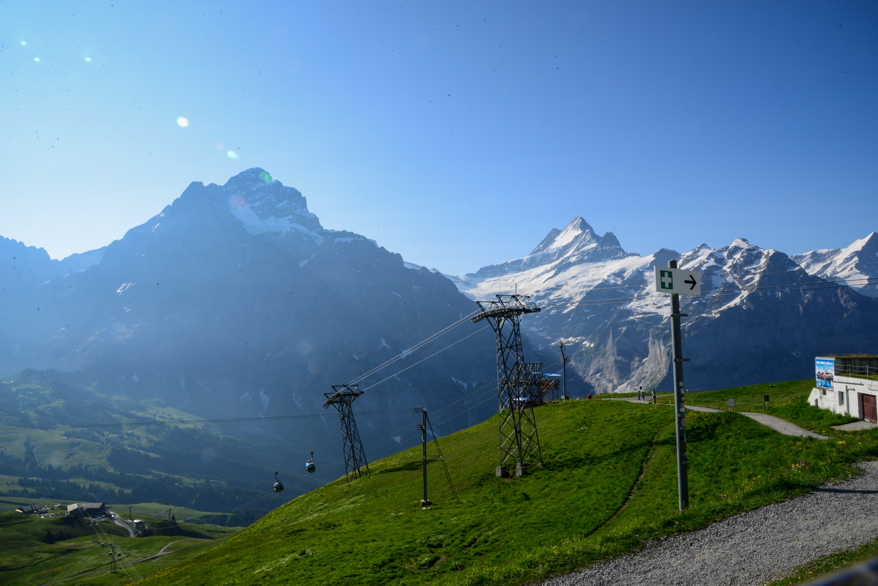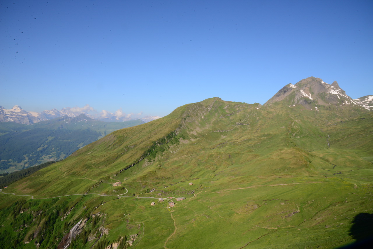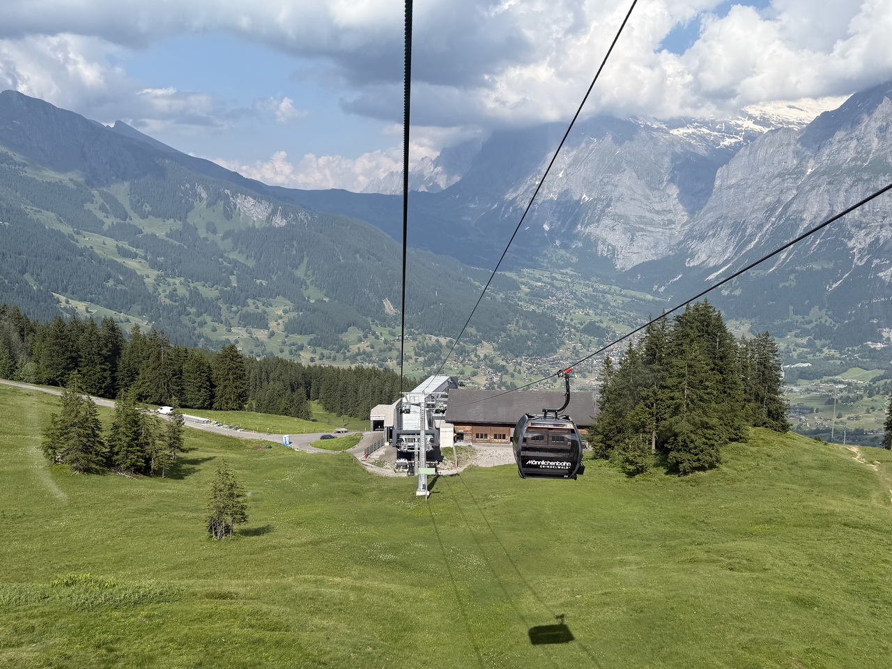 下山如果搭纜車回到格林德瓦,是非常快速的。為了體驗一下經過山間小鎮的風光,採租用山景滑板車下山。這是一種滑板車,把手具有前後輪的刹車系統,不用腳踩,只順著山坡自然的坡度向下滑,就可以抵達格林德瓦市區的 First 纜車站。山路雖然可以通行汽車,卻也不是很寬,有汽車來時得停下來讓汽車先行。另外一個重點是,經過陡坡時速度是很快的,如果刹車不當,又或是過於恐懼的人,是有可能摔車的。所以,這並不是絕對安全的器材。